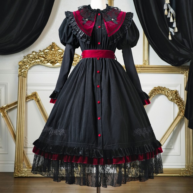 闇に溶ける黒に、鋭く差し込む色。 静けさの奥で、感情だけが確かに息づいている。 甘さも、強さも、どちらも手放さない。 それは、夜を選ぶための装い。 ウエストラインを美しく引き締めるレースアップデザインが印象的なワンピース。 フロントが大きく開いた立体的な切り替えで、お手持ちのスカートを調和して理想のゴシックコーデに。 随所に配された配色アクセントと装飾が、静かな緊張感と華やかさを両立。 一枚でコーディネートが完成する、シリーズを象徴するクラシカルなワンピースです。 着用スカート: サマーウィッチ スカート https://hoshibako.thebase.in/items/75744257 *商品本体以外の衣類及び撮影用小物は付属致しません。 【カラー】 ・ブラック×レッド ・ブラック×ネイビー 【サイズ】 着丈 104cm 肩幅 36cm バスト 94cm ウエスト 81cm 袖丈 72.5cm 袖口まわり 20cm 【素材】 表地: ポリエステル 92% スパンデックス 3% ビスコース 4% ナイロン 1% 裏地: コットン その他: 合金 【購入の際のご注意】 *モニター環境により、実際の商品の色合いと異なって見える場合がございます。 *手作業での製作品の為、仕上がりには個体差がございます。ご了承下さい。 *予約商品に関しまして、情勢及び輸送事情、生産状況により、お届け時期が前後する可能性がございます。何卒ご了承くださいませ。 *お客様のご入金確認後、在庫が確保できた商品から順次商品を発送いたします。但し、商品の在庫状況により発送までお時間をいただく場合がございます。 *発送時期の異なる予約商品を同時にご注文頂いた場合、発送時期が遅いものに合わせて発送いたします。 【取り扱いの際の注意点】 *強い衝撃を与えますと飾りが取れてしまう可能性がありますのでご注意下さい。 【返品について】 *イメージと違った、サイズが合わない、ご注文をお間違えになった、など、お客様都合による理由の場合につきましては、他商品への交換及び返品は、原則お受けしておりません。ご注文の際には十分ご注意下さい。