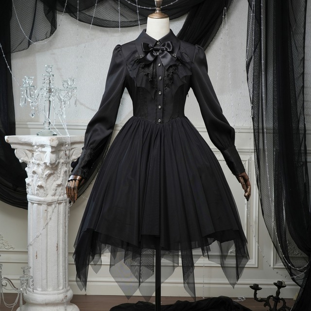 その羽を広げる時―― 大人気なナイト・イーヴィルシリーズより、新作のワンピースが登場✧ 縦ラインを強調する端正なシルエットがクラシカルで凛とした印象に。 胸元のフリル装飾が蝙蝠の羽根のような形でファンタジック。 ゴシックとクラシカルが調和した主役級のワンピースはいかがでしょうか。 *商品本体以外の衣類及び撮影用小物は付属致しません。 【カラー】 ・ブラック ・ブラック×レッド ・ホワイト 【サイズ】 着丈 117cm 肩幅 36cm バスト 88cm~94cm ウエスト 70cm~80cm 袖丈 67cm 袖口まわり 21.5cm 【素材】 表地: ポリエステル 裏地: ポリエステル スパンデックス その他: 合金 【購入の際のご注意】 *モニター環境により、実際の商品の色合いと異なって見える場合がございます。 *手作業での製作品の為、仕上がりには個体差がございます。ご了承下さい。 *予約商品に関しまして、情勢及び輸送事情、生産状況により、お届け時期が前後する可能性がございます。何卒ご了承くださいませ。 *お客様のご入金確認後、在庫が確保できた商品から順次商品を発送いたします。但し、商品の在庫状況により発送までお時間をいただく場合がございます。 *発送時期の異なる予約商品を同時にご注文頂いた場合、発送時期が遅いものに合わせて発送いたします。 【取り扱いの際の注意点】 *強い衝撃を与えますと飾りが取れてしまう可能性がありますのでご注意下さい。 【返品について】 *イメージと違った、サイズが合わない、ご注文をお間違えになった、など、お客様都合による理由の場合につきましては、他商品への交換及び返品は、原則お受けしておりません。ご注文の際には十分ご注意下さい。