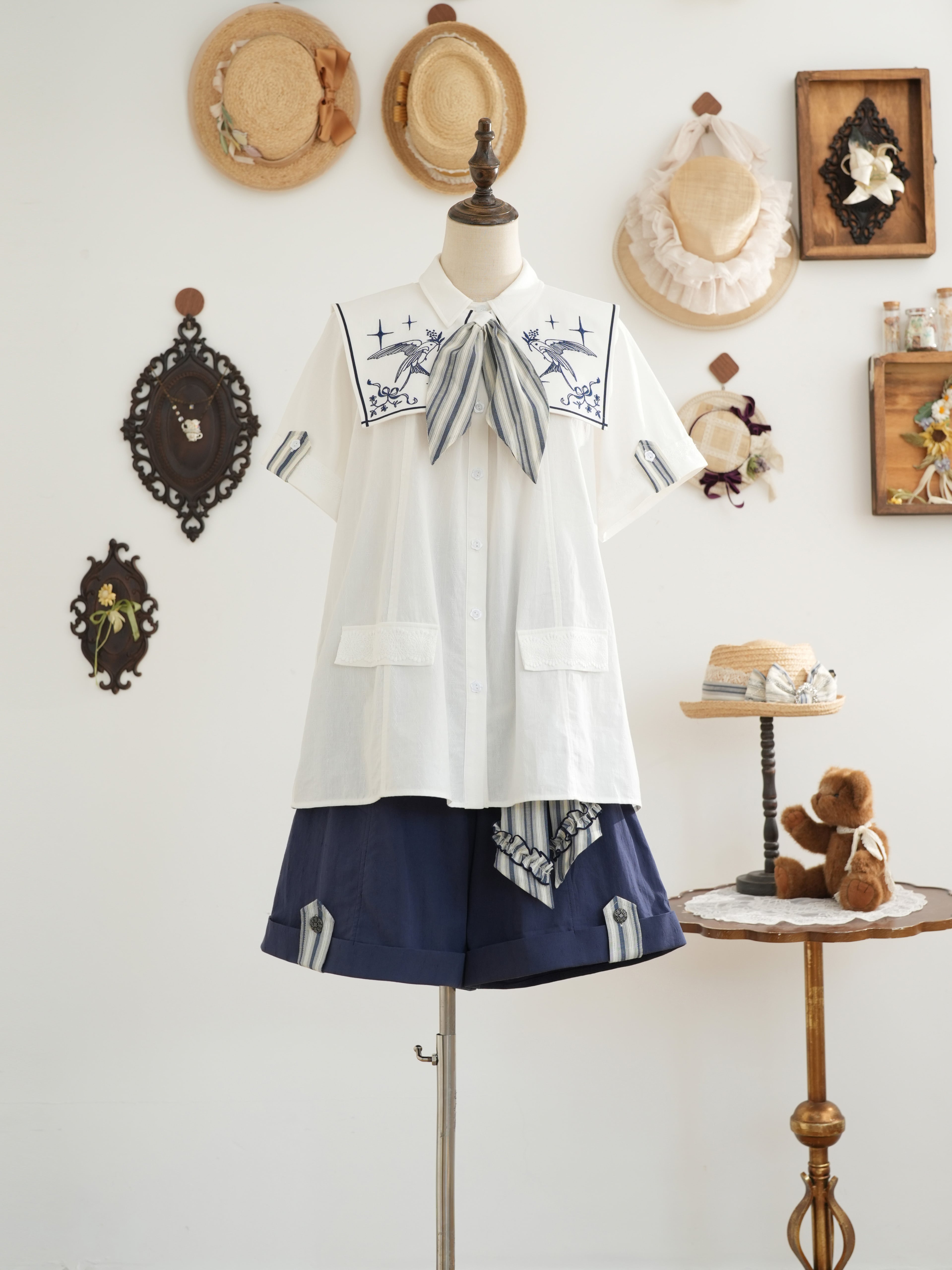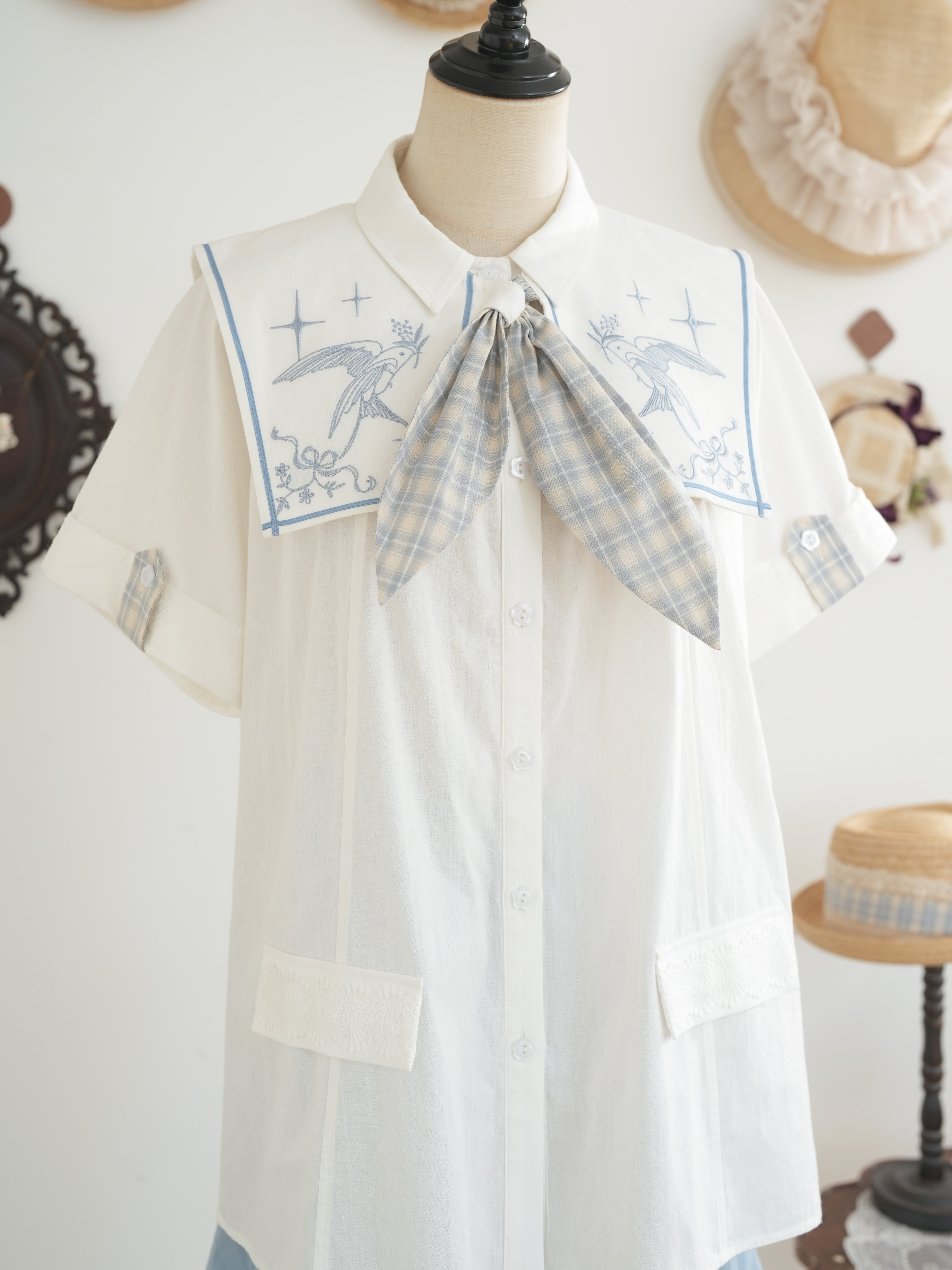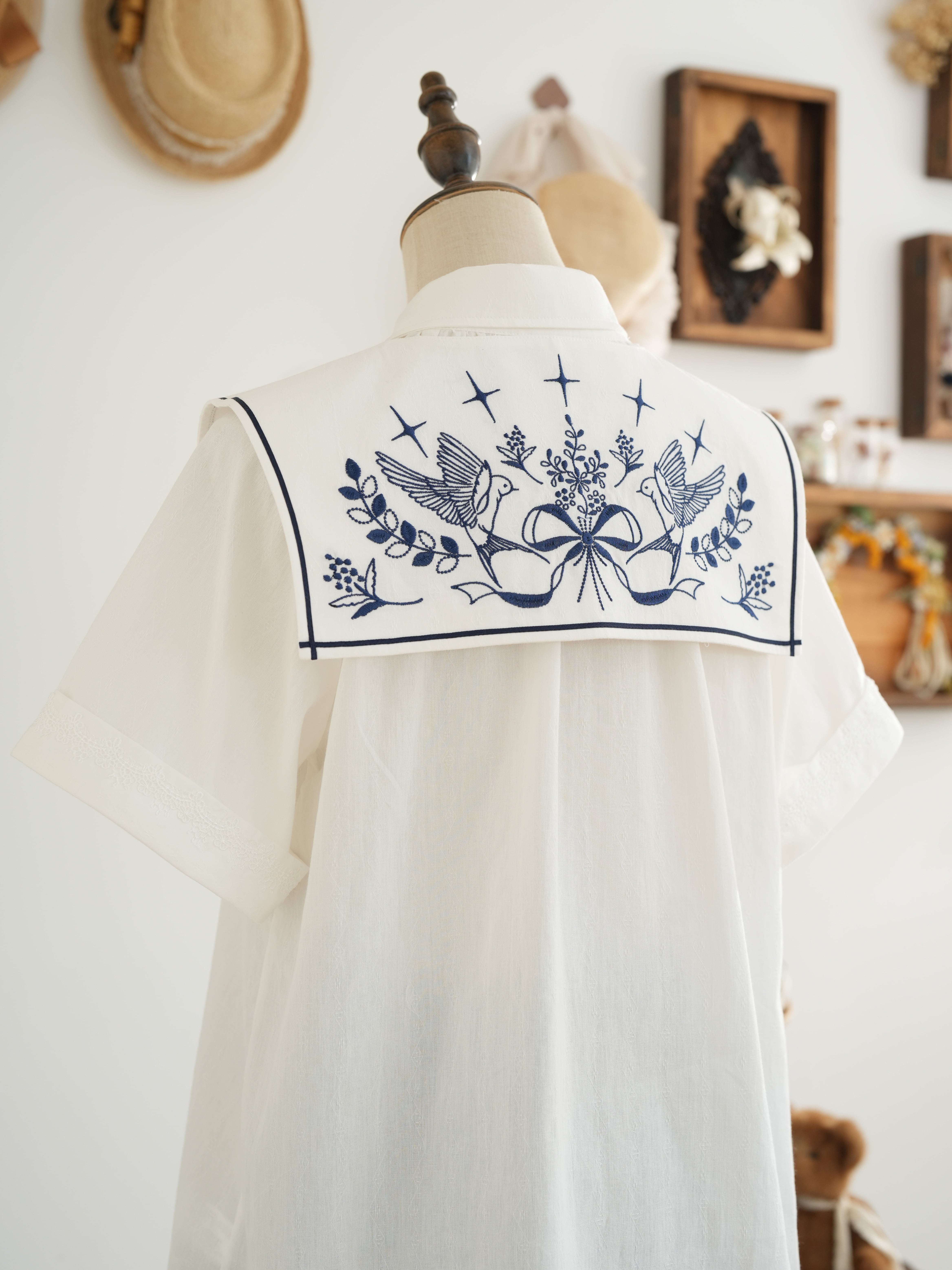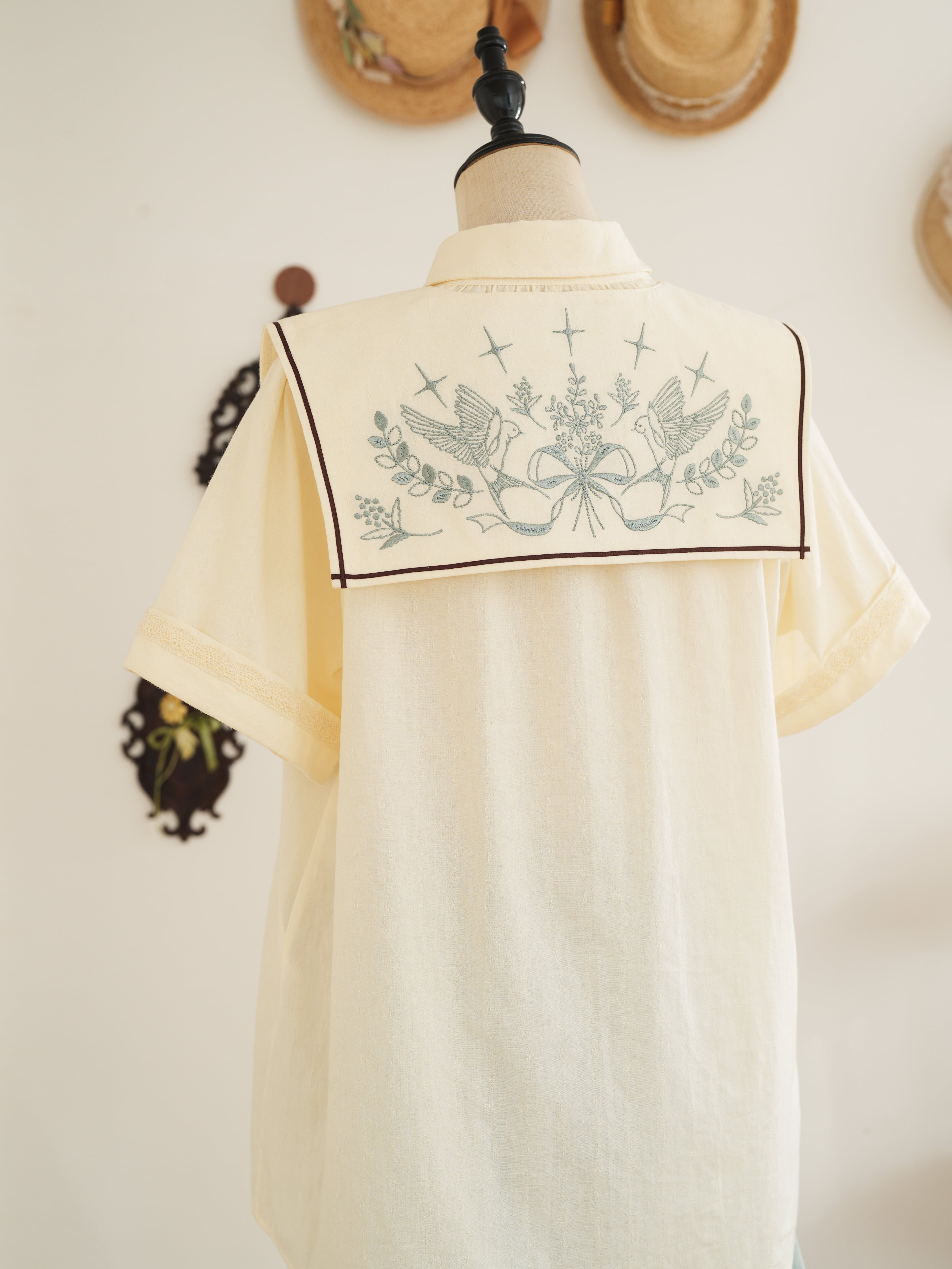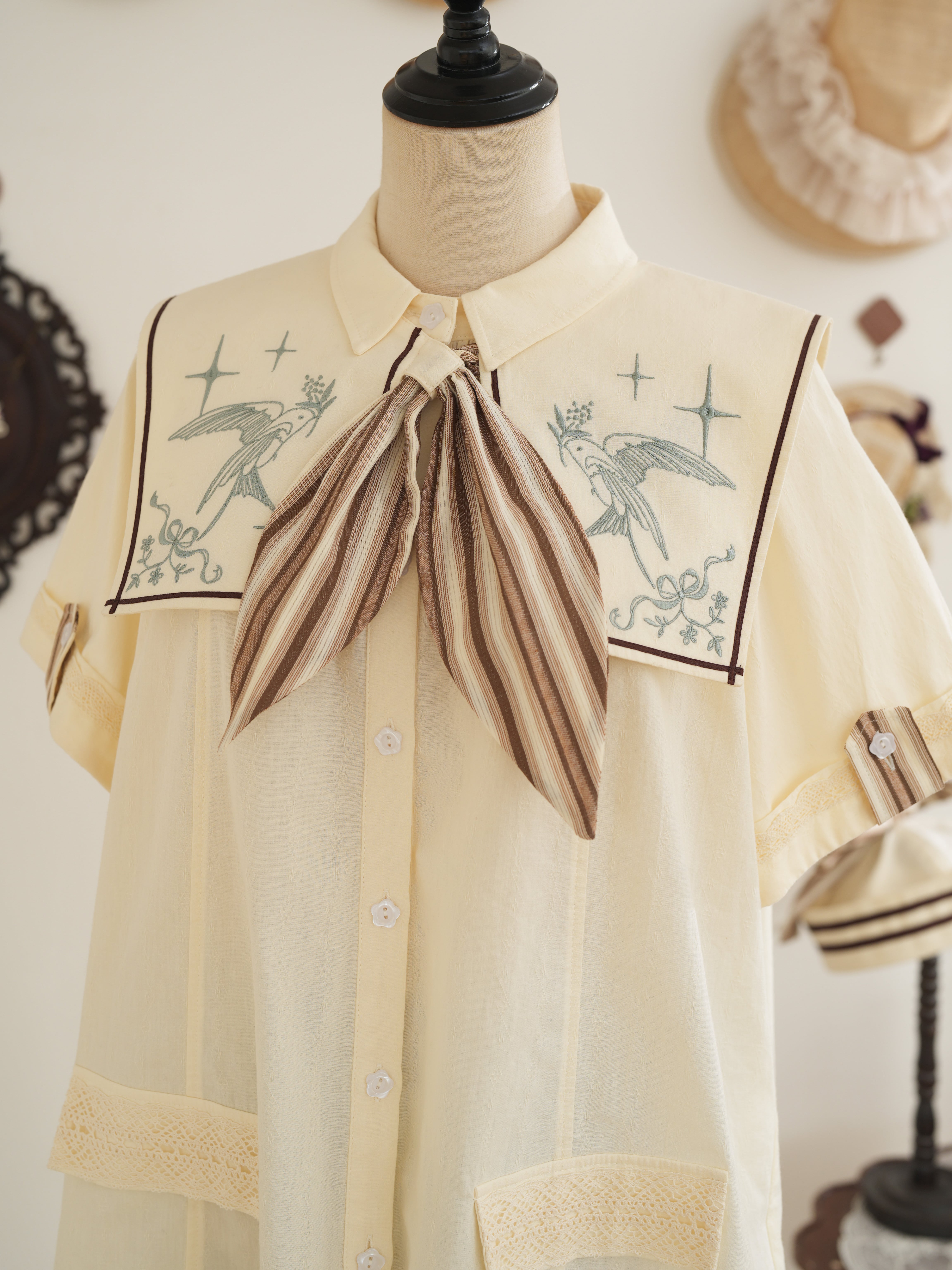 セーラー襟に刺繍されたカナリアとチェック柄のスカーフで爽やかに仕上げました。