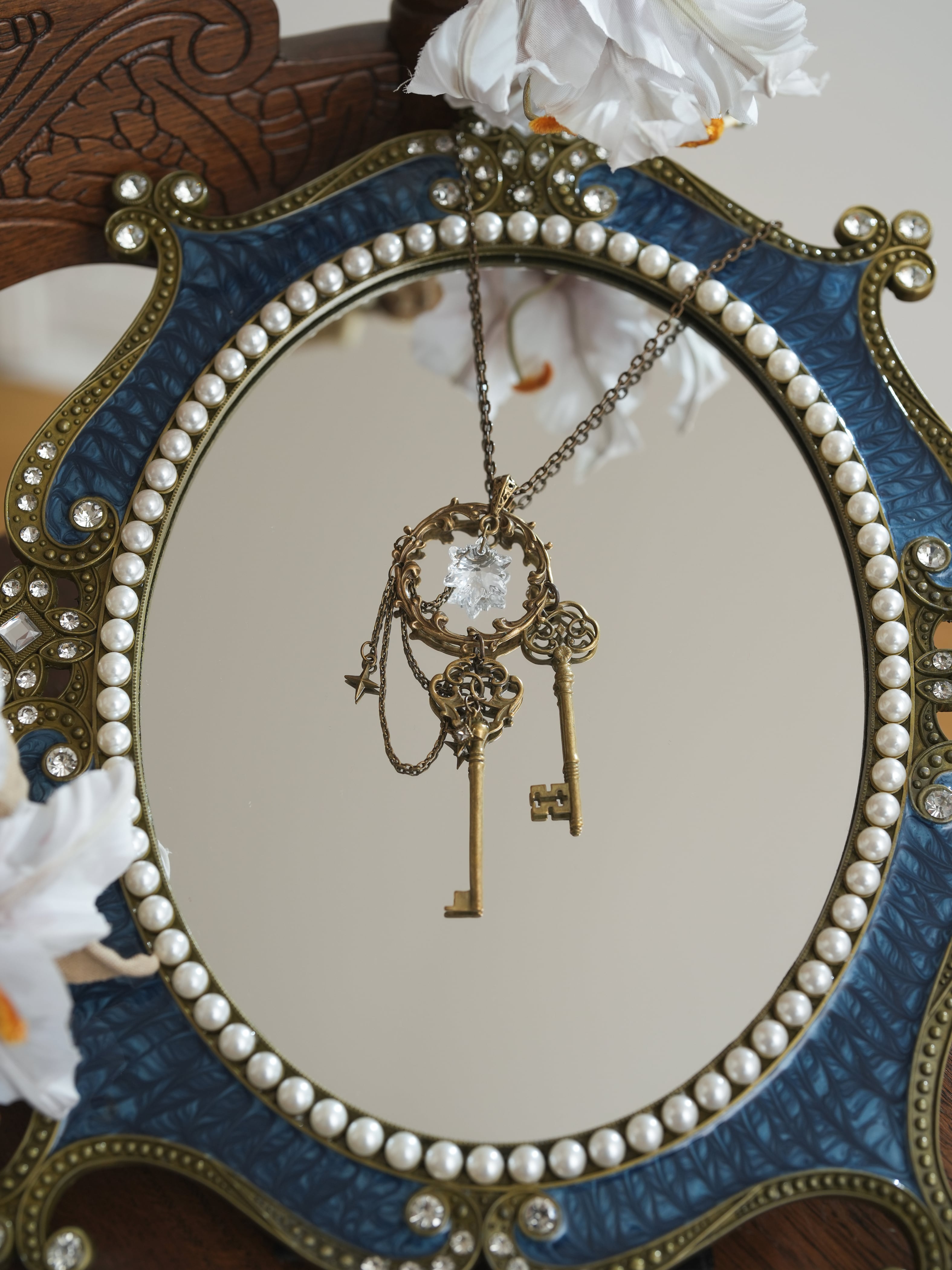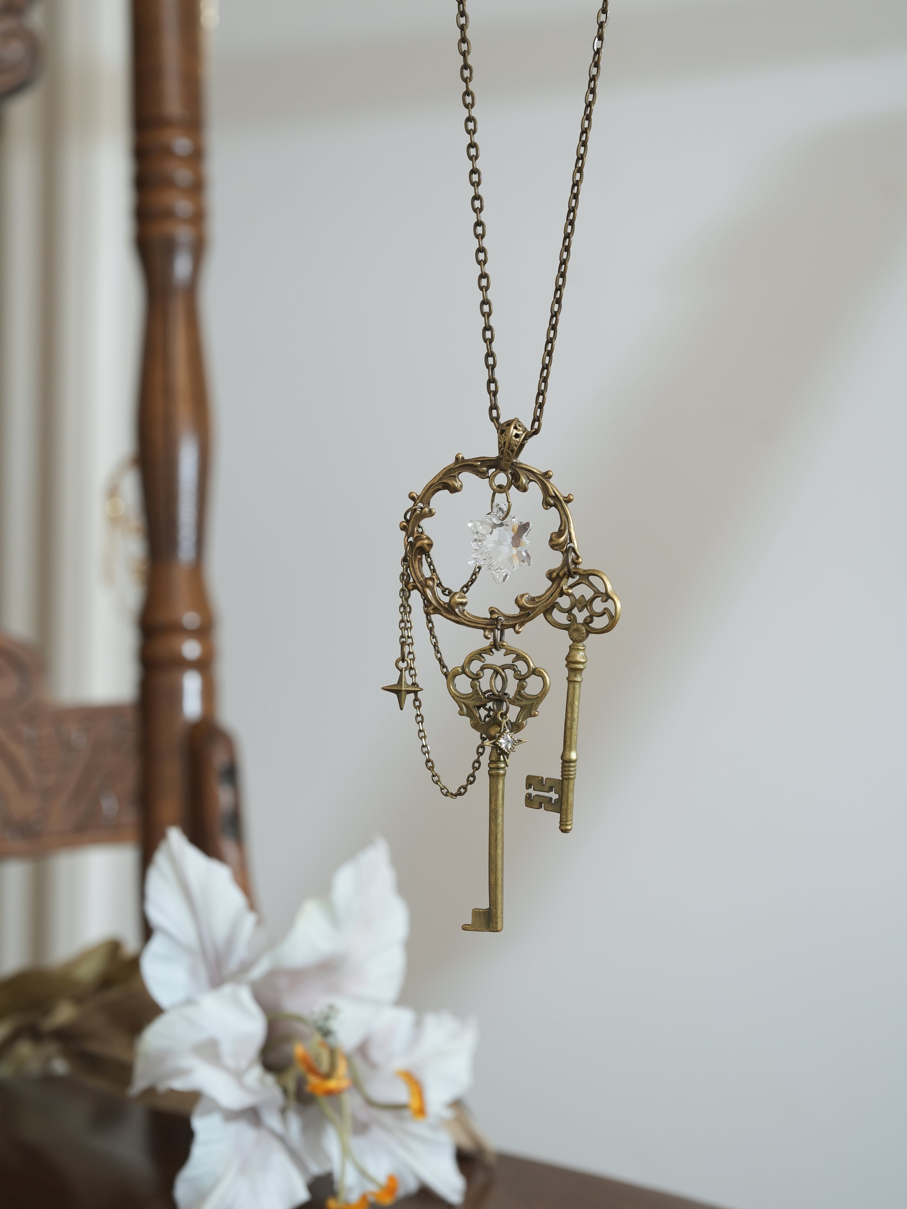 十字の星型チャームや、雪の結晶のようなクリスタルが華やかさをプラスします。