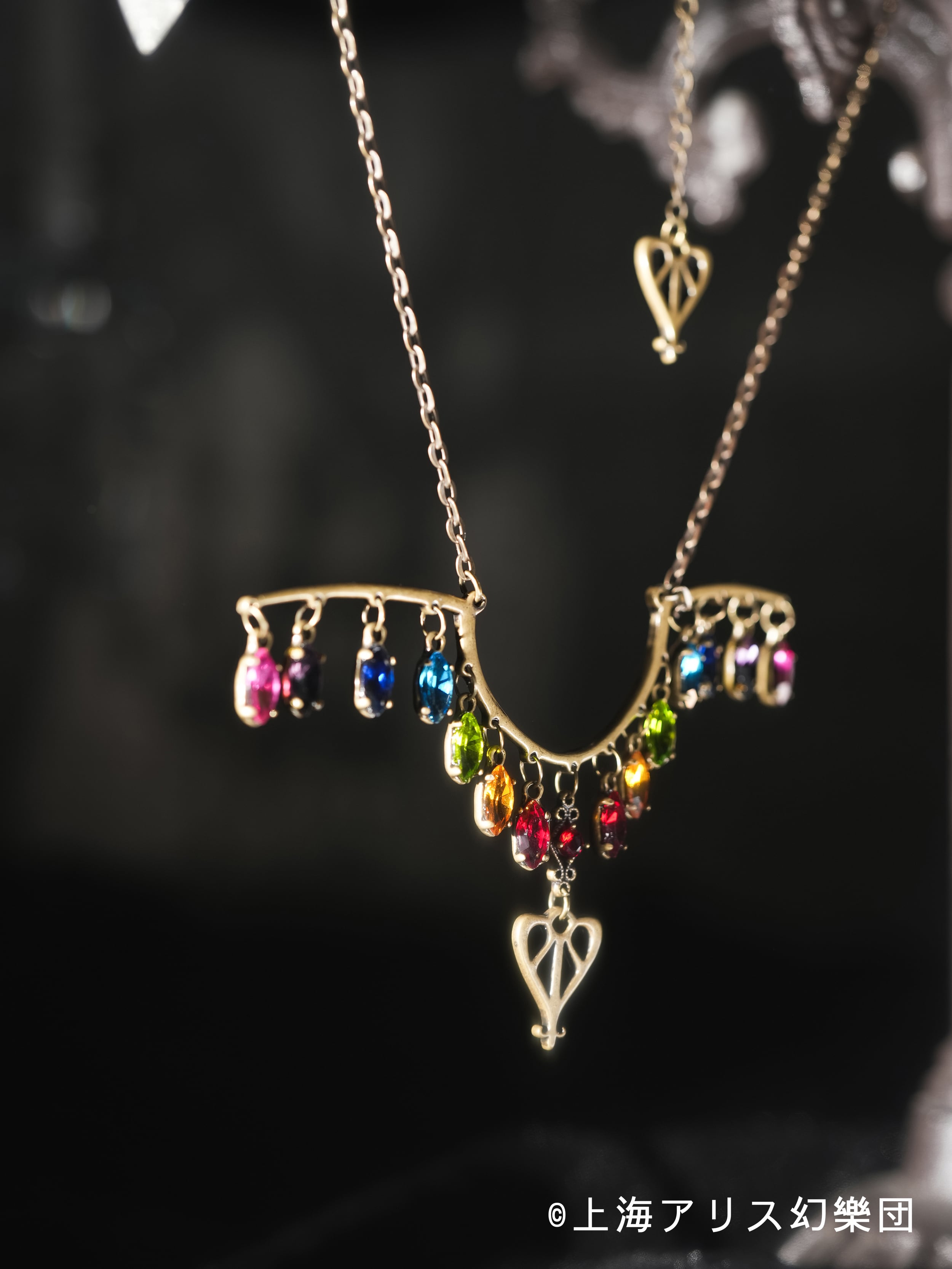 アンティーク感のある落ち着いた金属に、色とりどりのビジューが輝き、フランドールの個性的な羽根の美しさをそのままに、ファッションアイテムとしてお洋服にも馴染み良い質感を与えます。