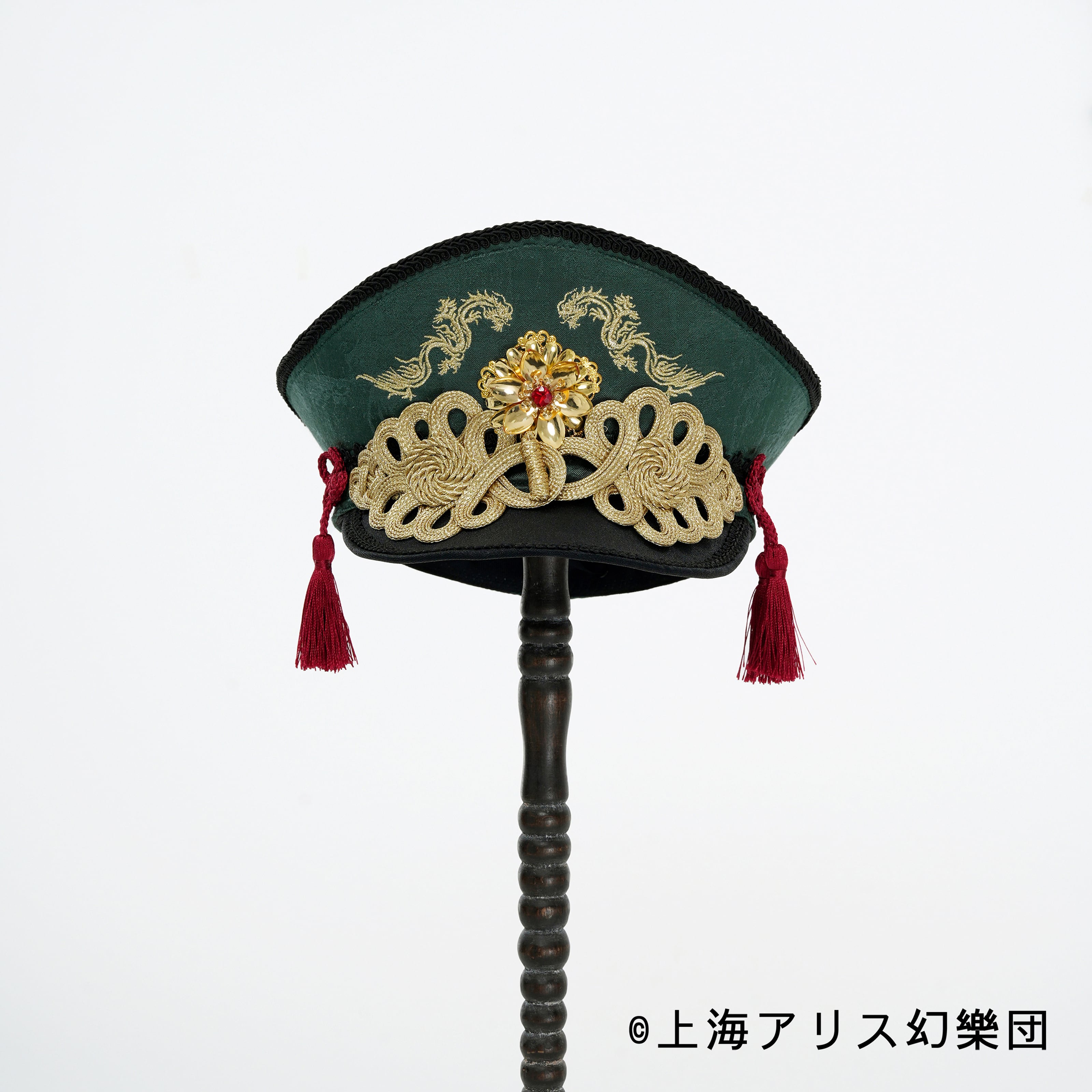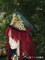 落ち着いたグリーンを基調としたミリタリー風のハット。紅茶のように紅いタッセルがゆらめき、金色の模様と龍のような華やかな飾りがインパクト抜群!