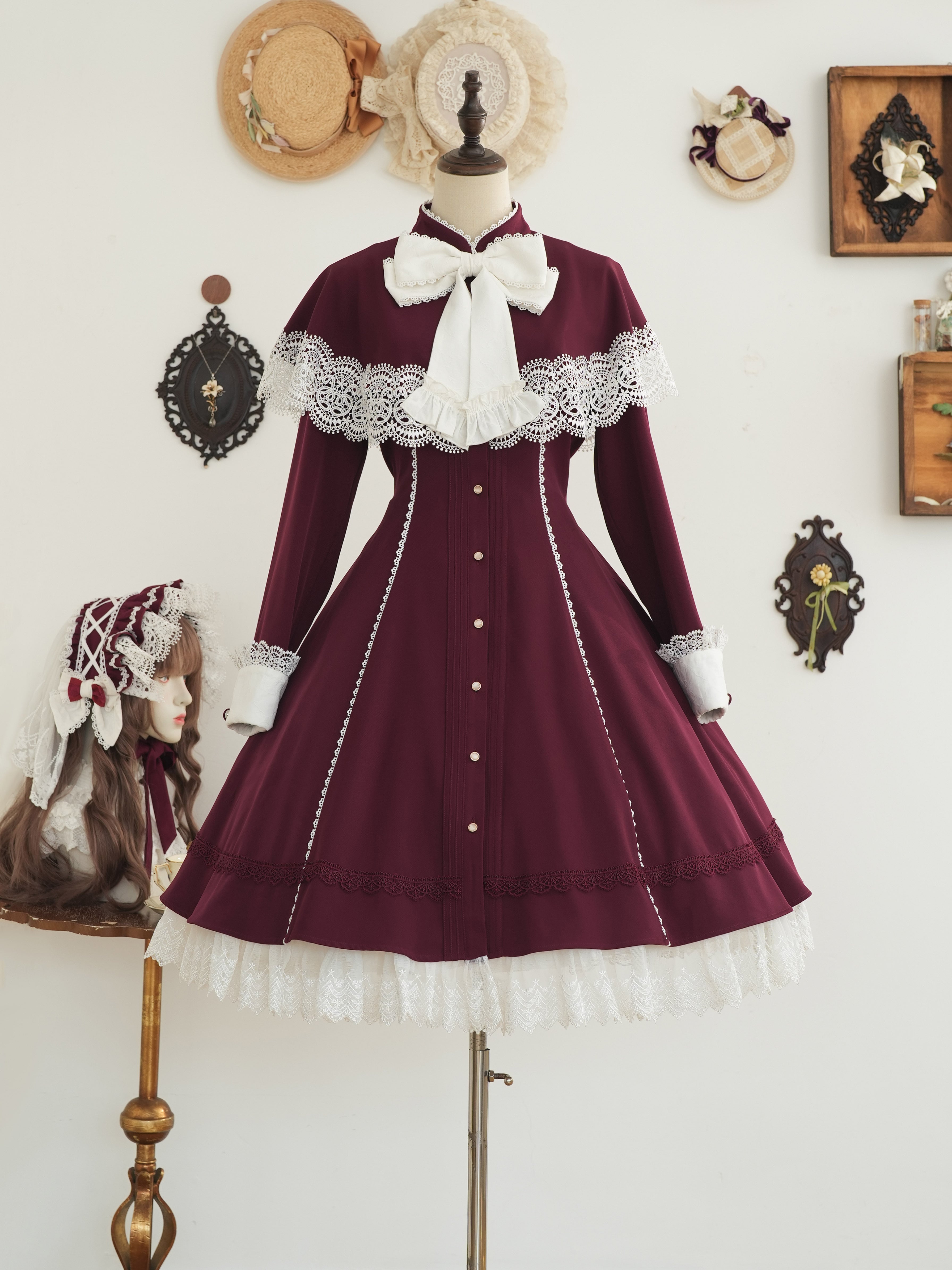 深みのあるカラーにホワイトカラーが美しいクラシカルワンピースが登場。