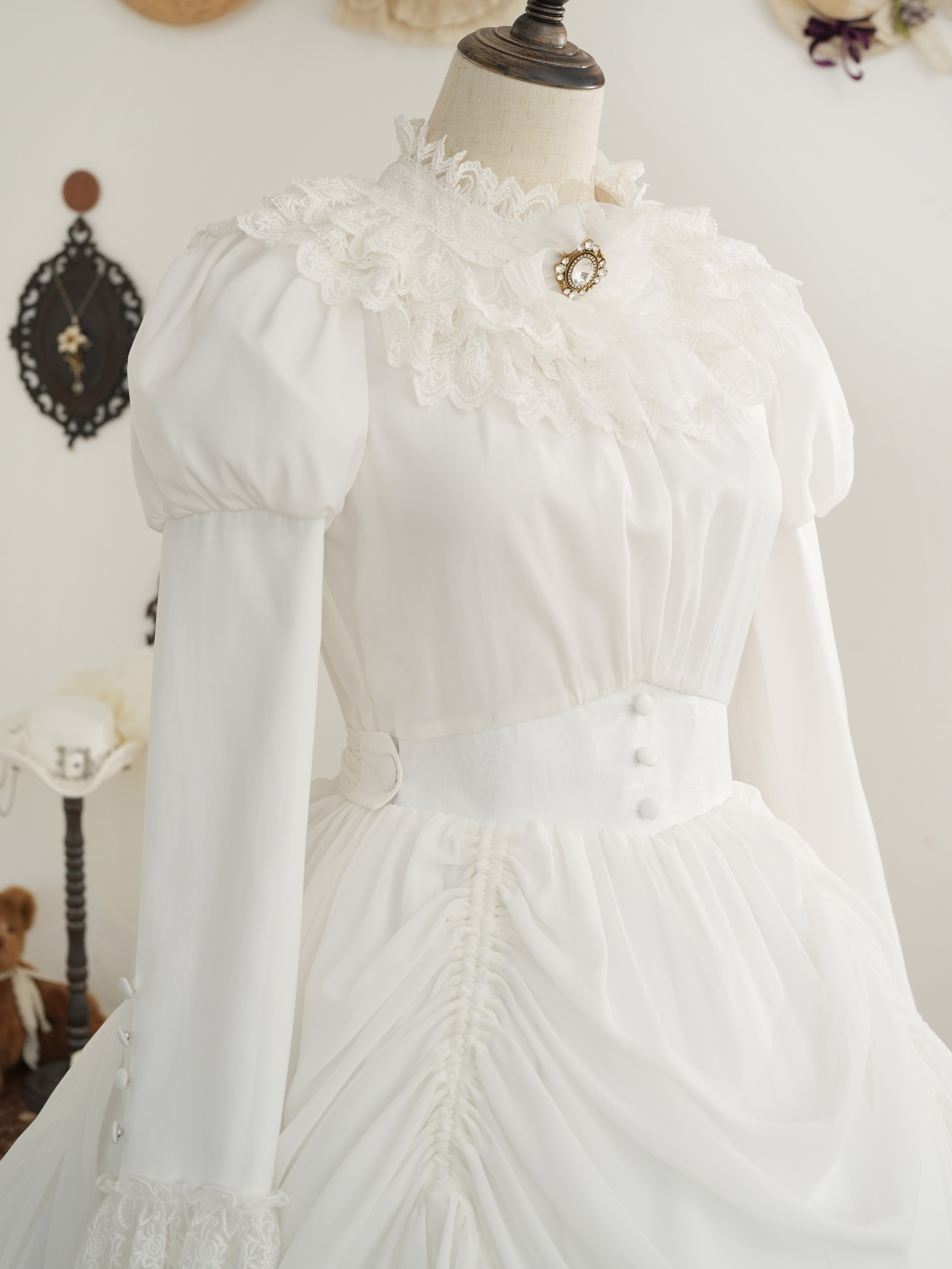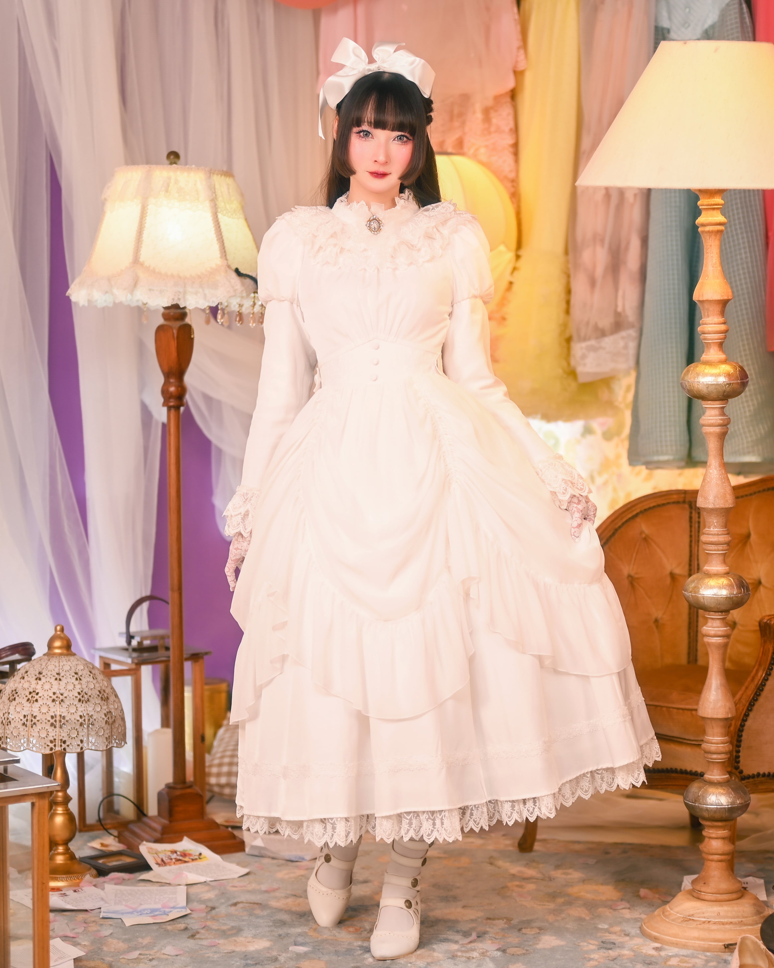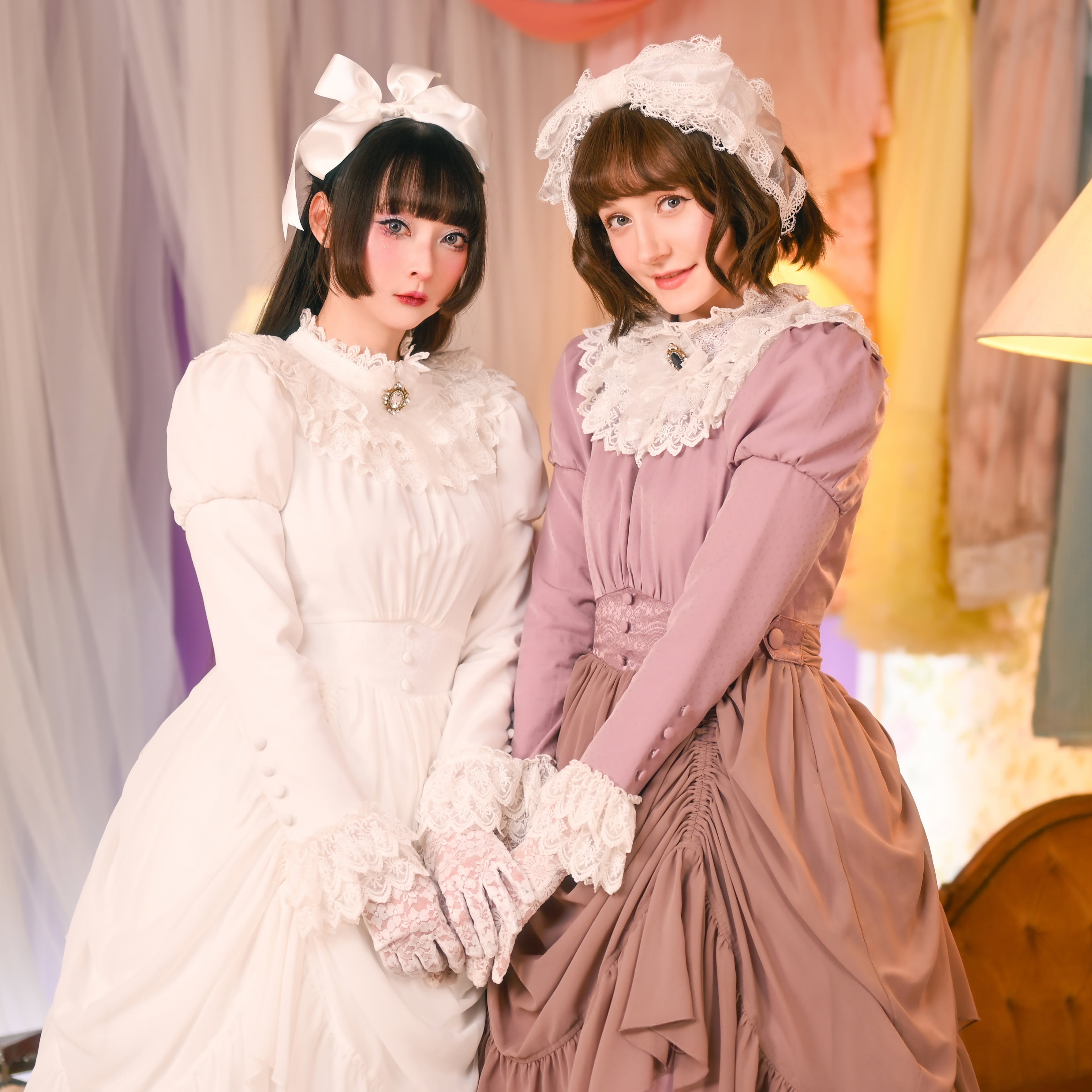 スタンドカラーや肩回りにレースがたっぷりついてるので、顔まわりを明るく彩ります。