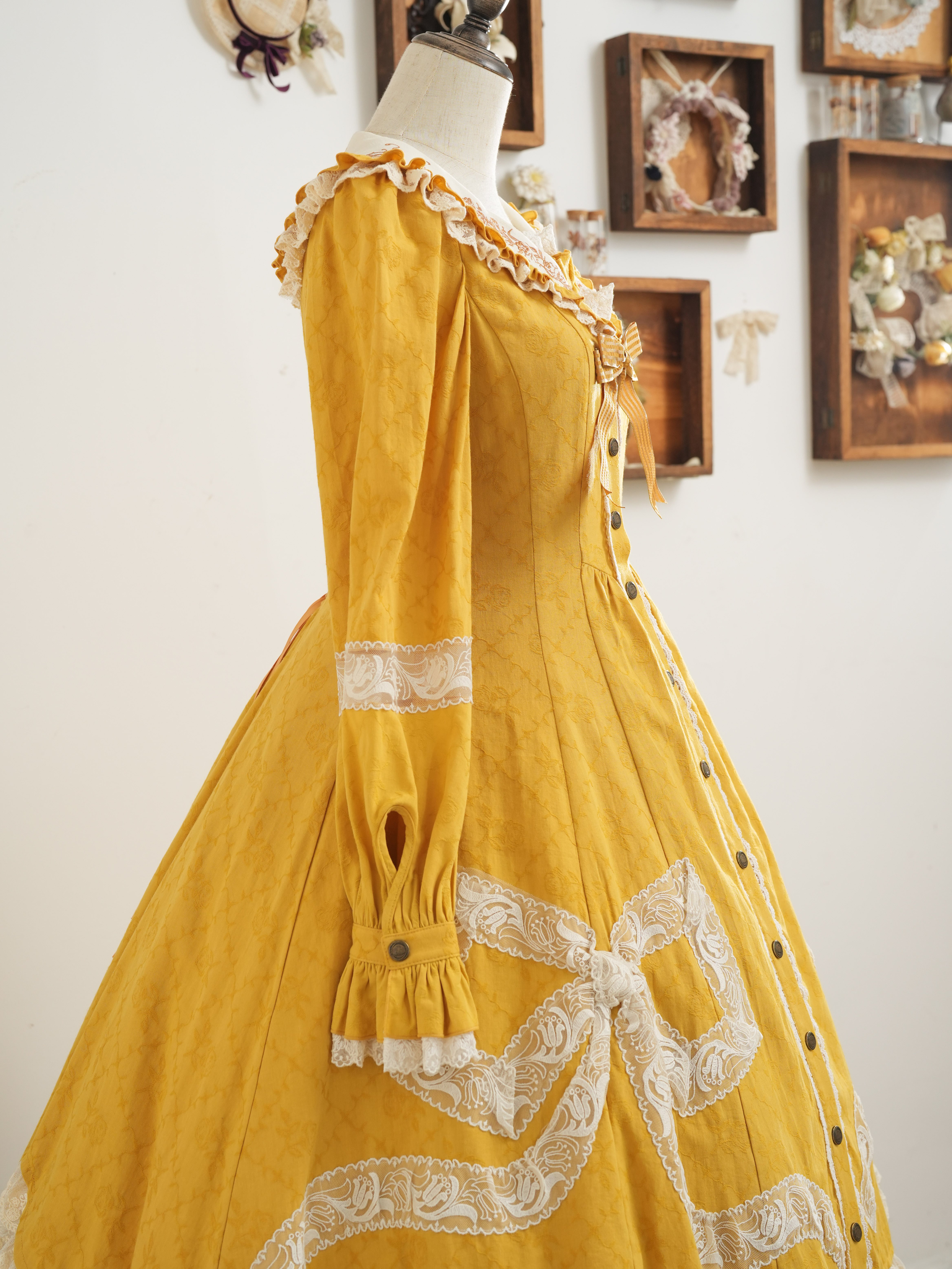 プリンセスラインの美しいシルエットに、バラ柄の生地でゴージャスな印象に。