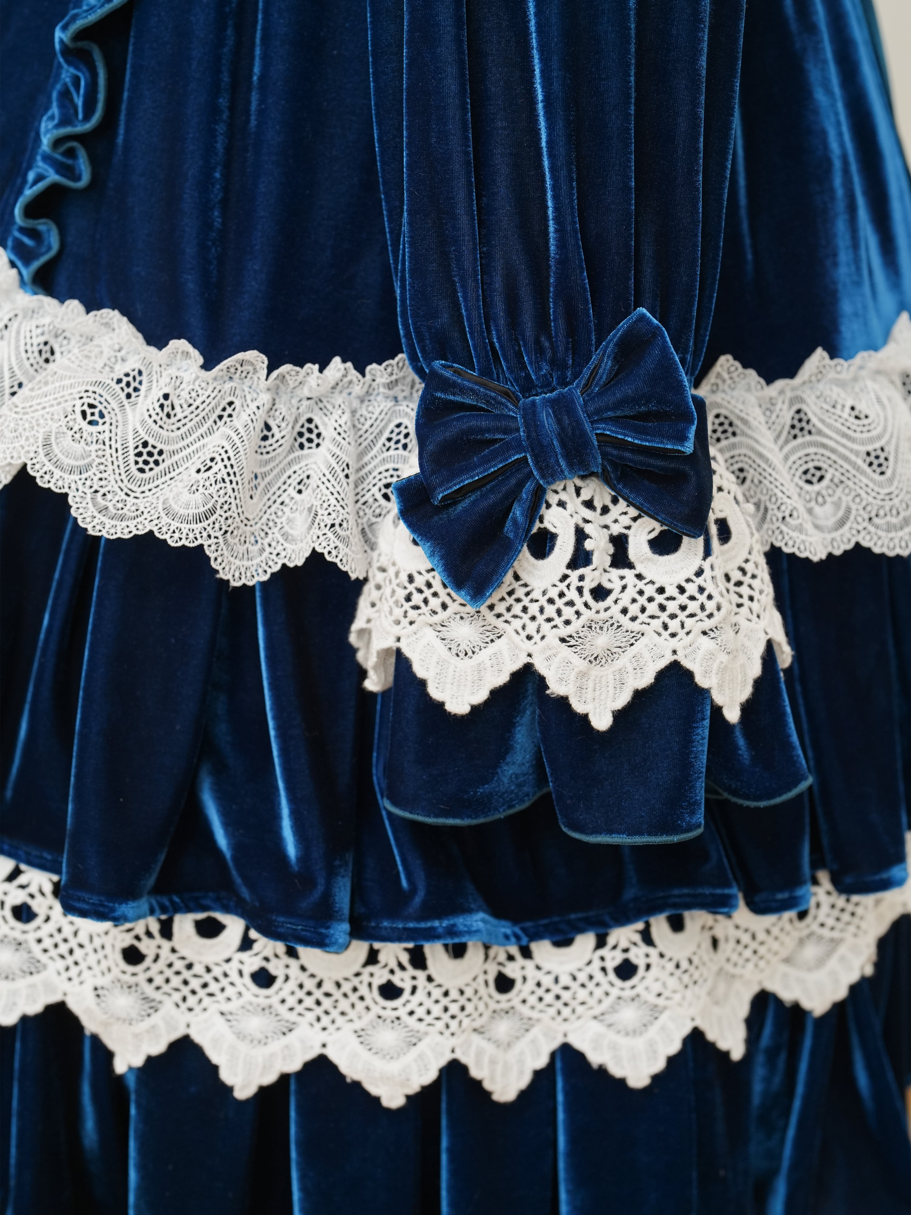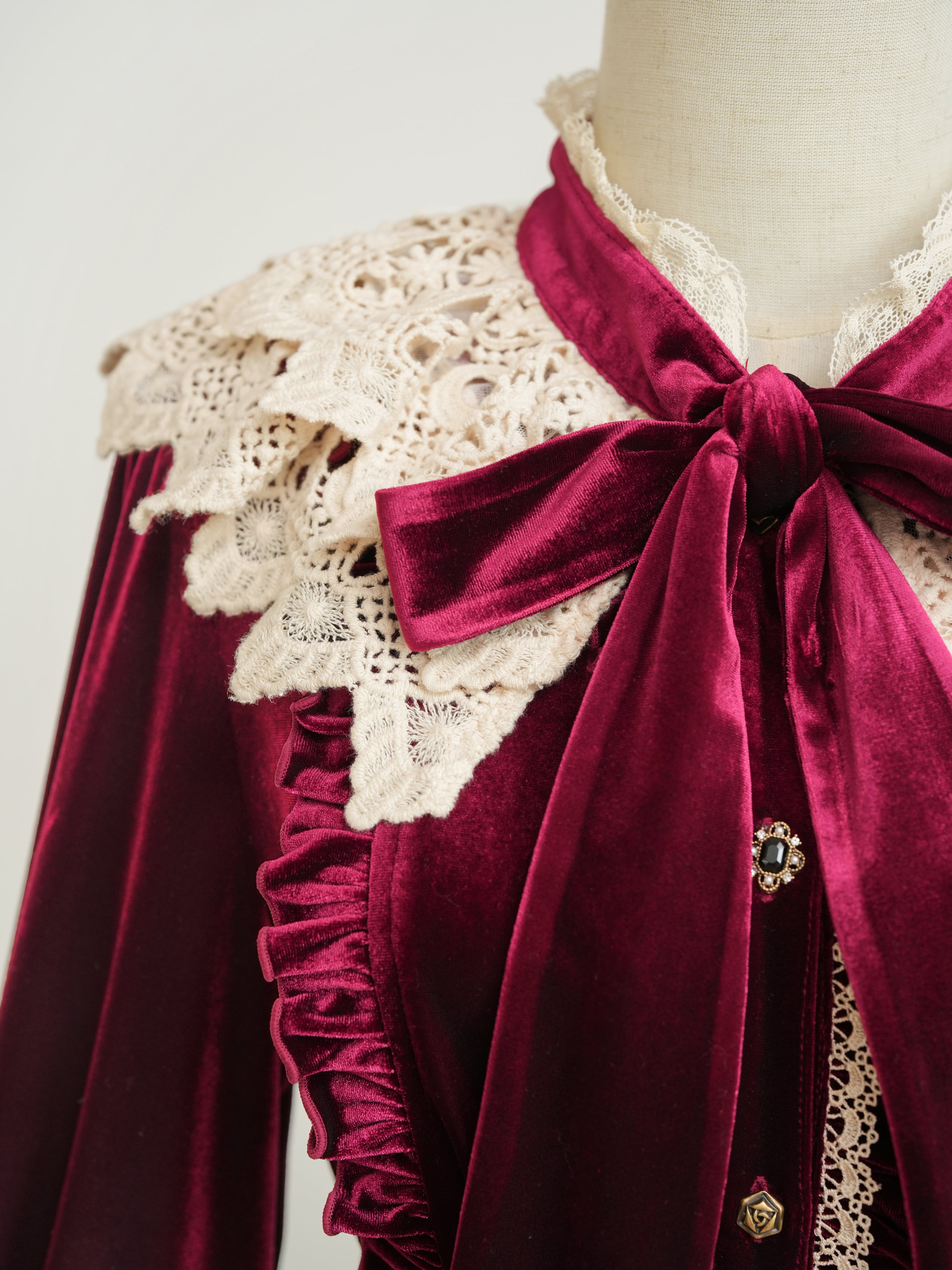深い光を湛えた生地に、繊細なレースとフリルを重ね、