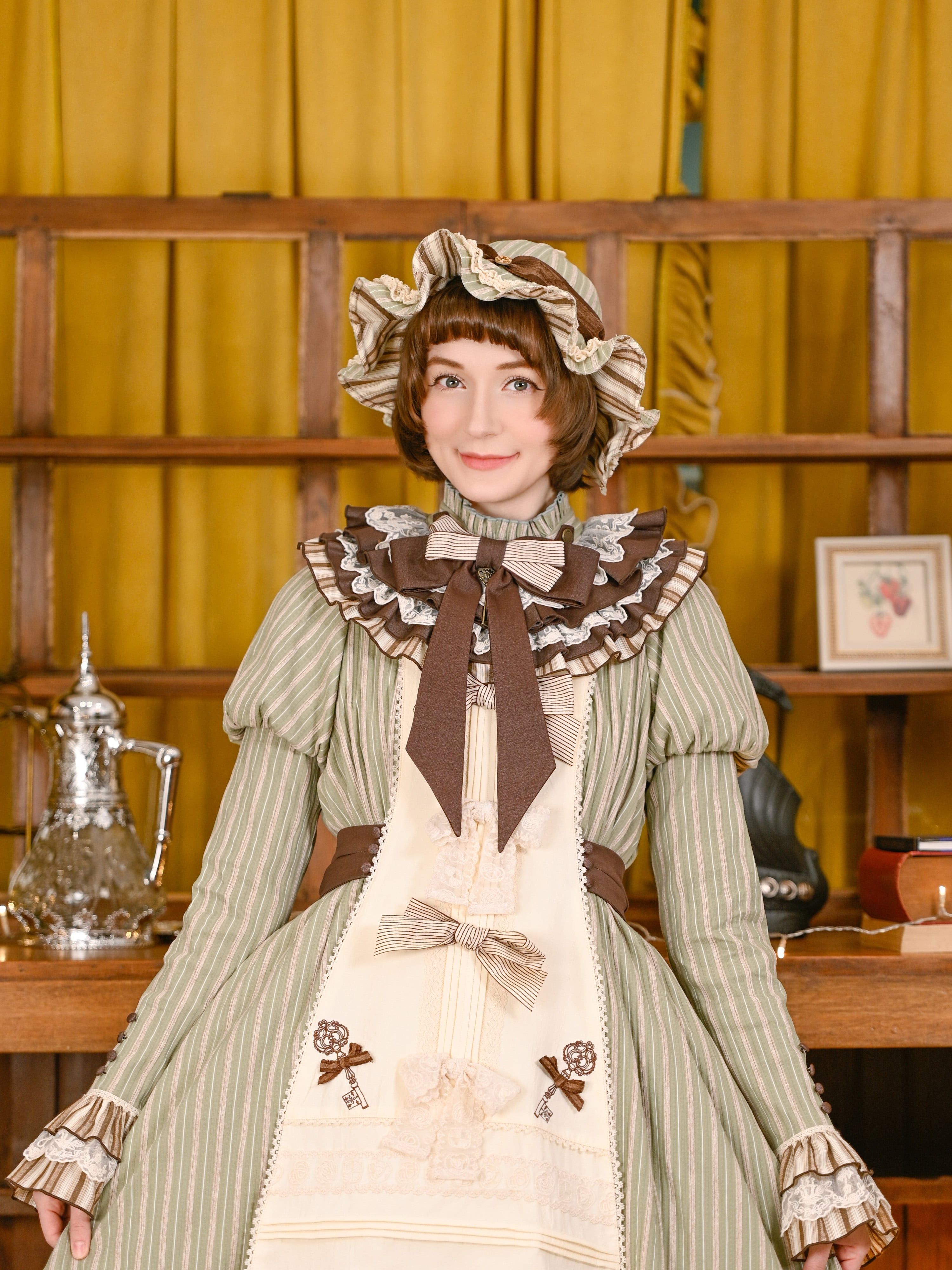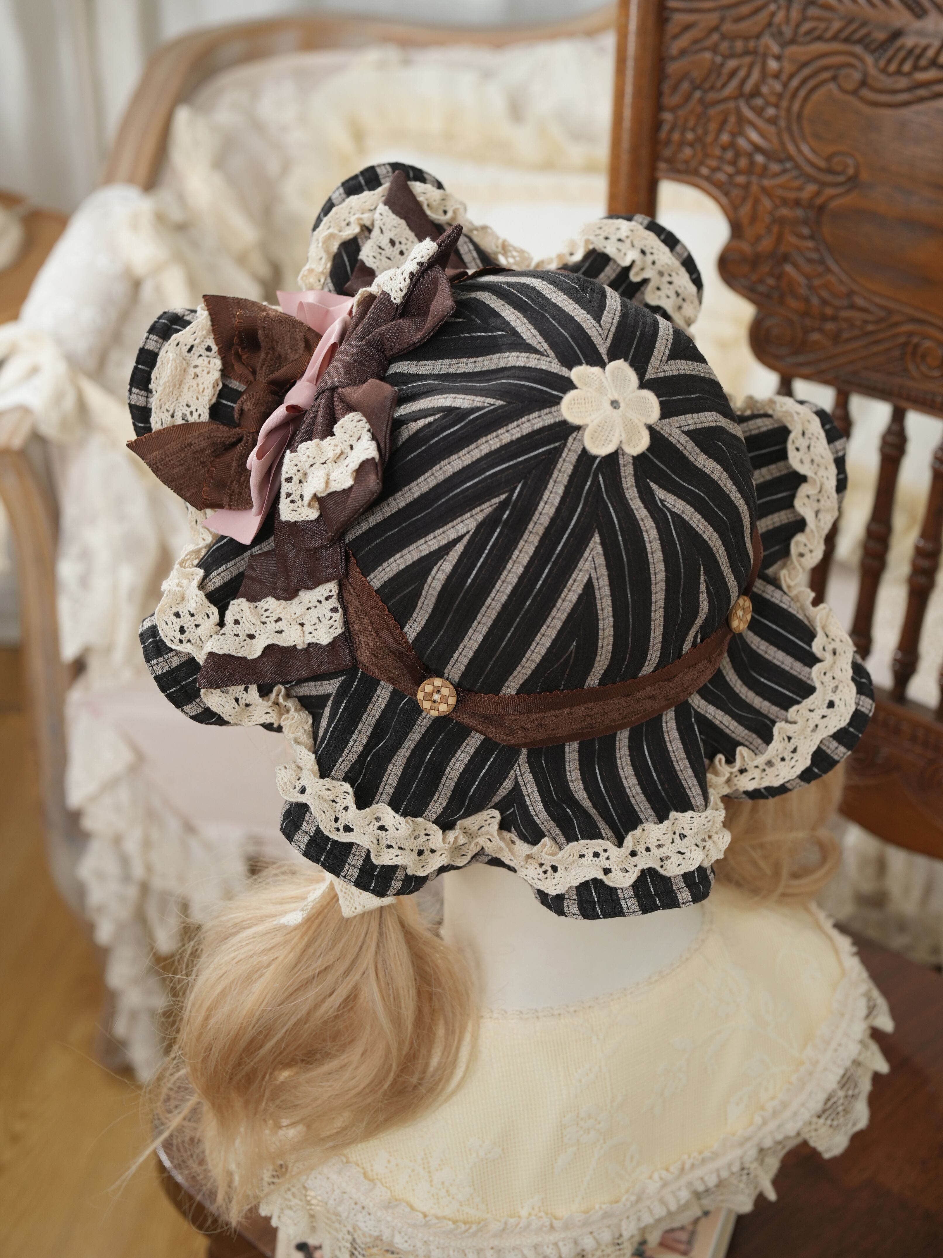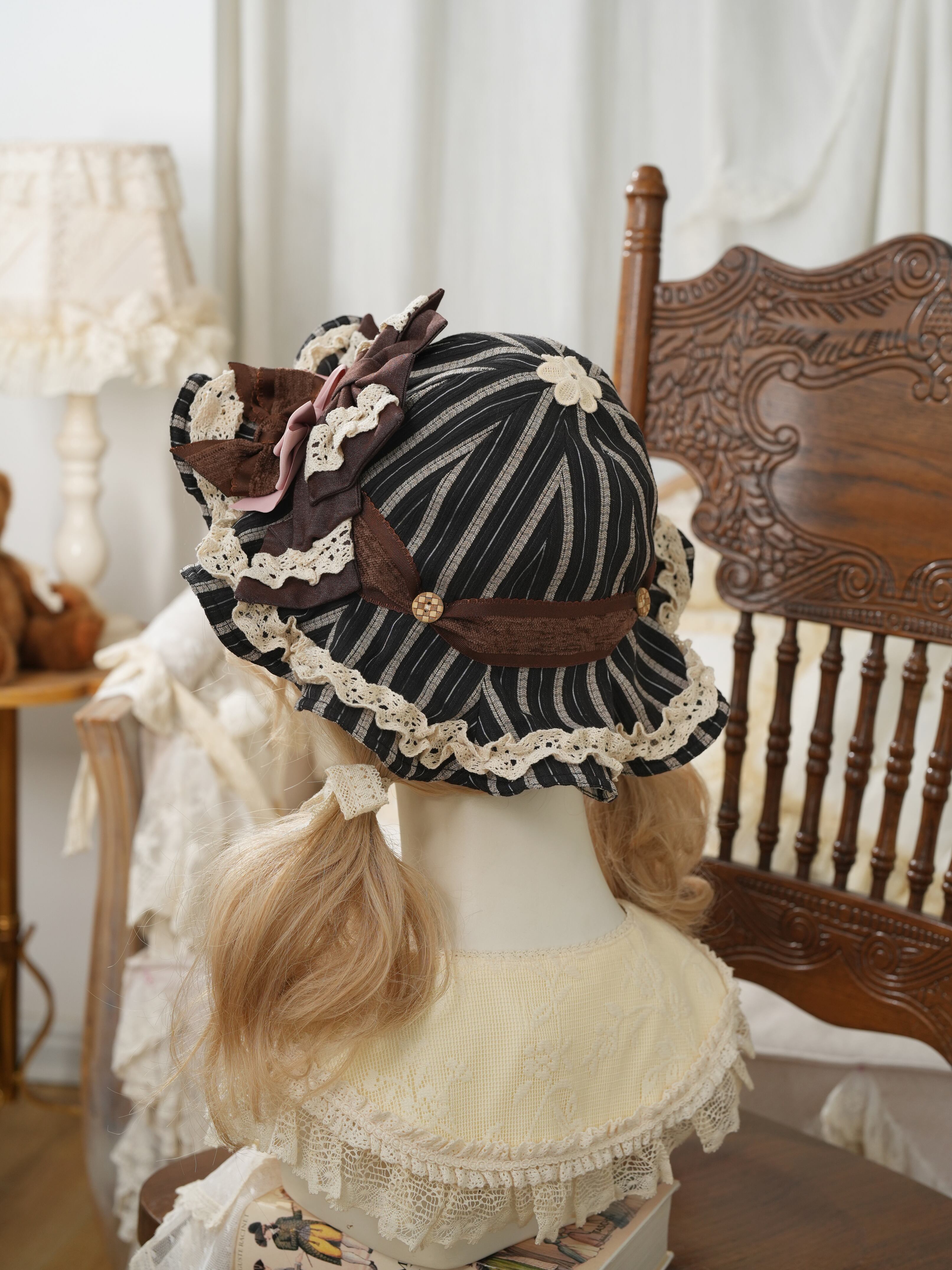 温かみのあるボタンと、レースやリボンのトッピングが、コーディネートに甘いアクセントを添えます。
