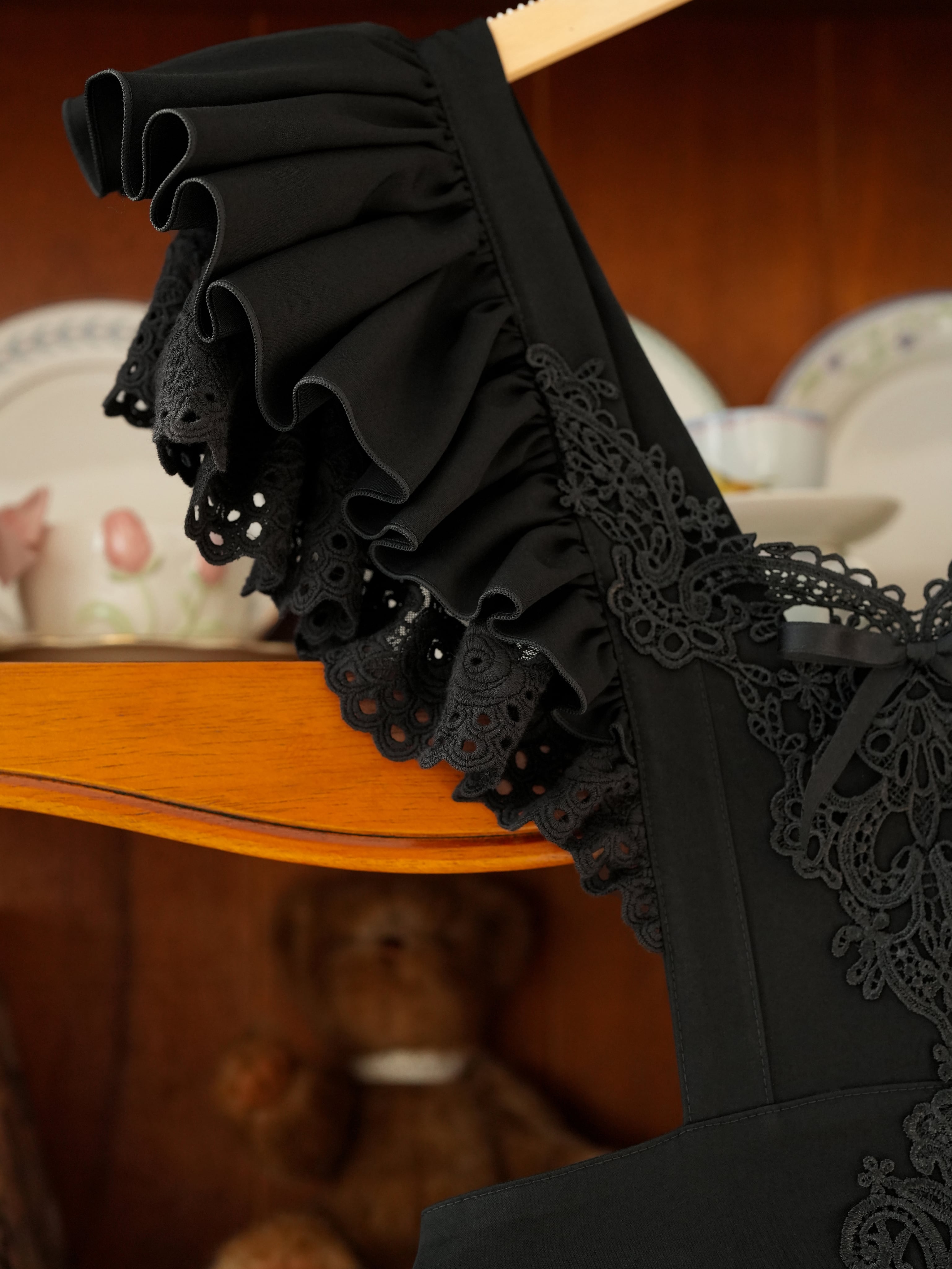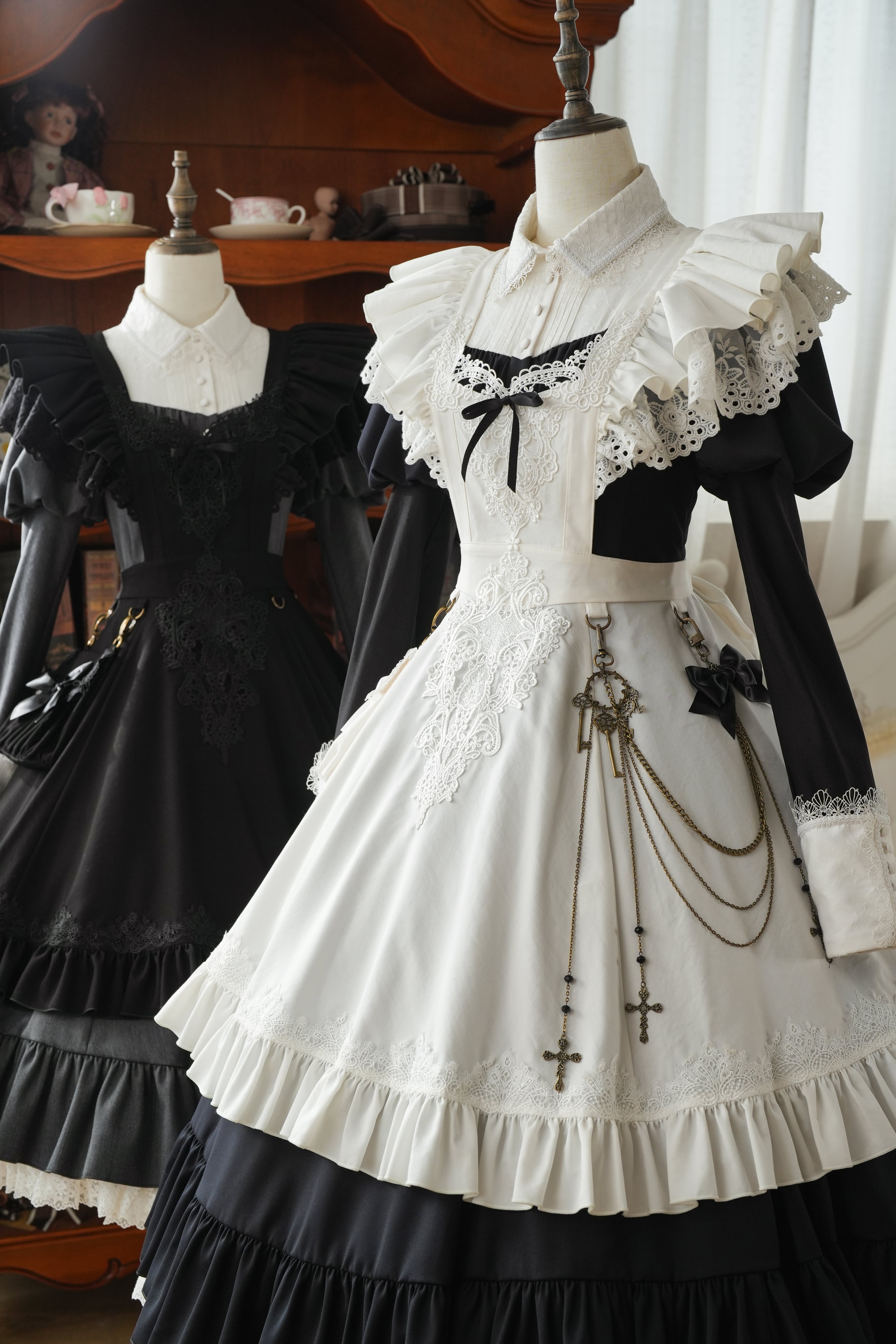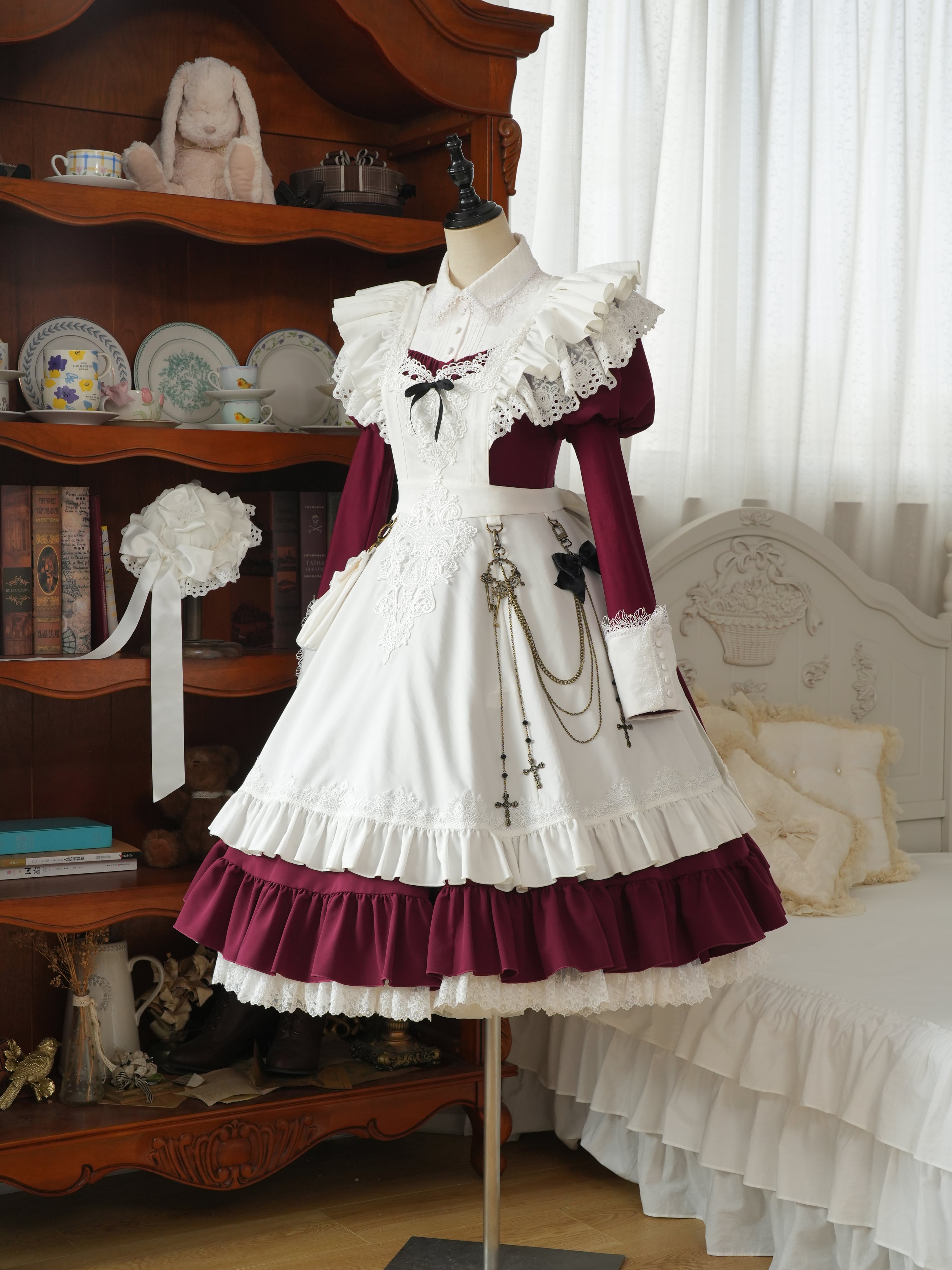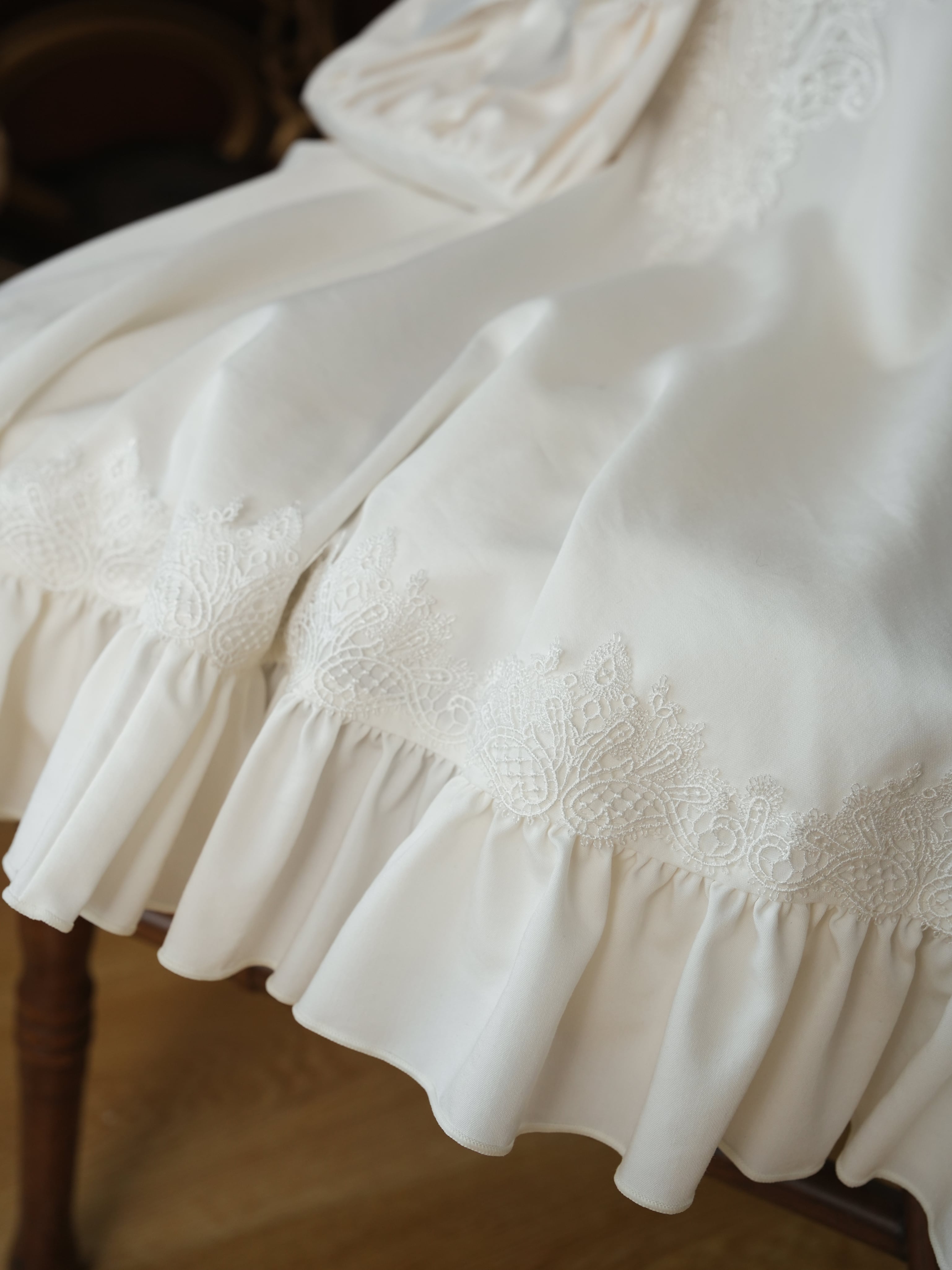 繊細なレースとフリルを重ねた、クラシカルな雰囲気のピナフォアエプロン。
