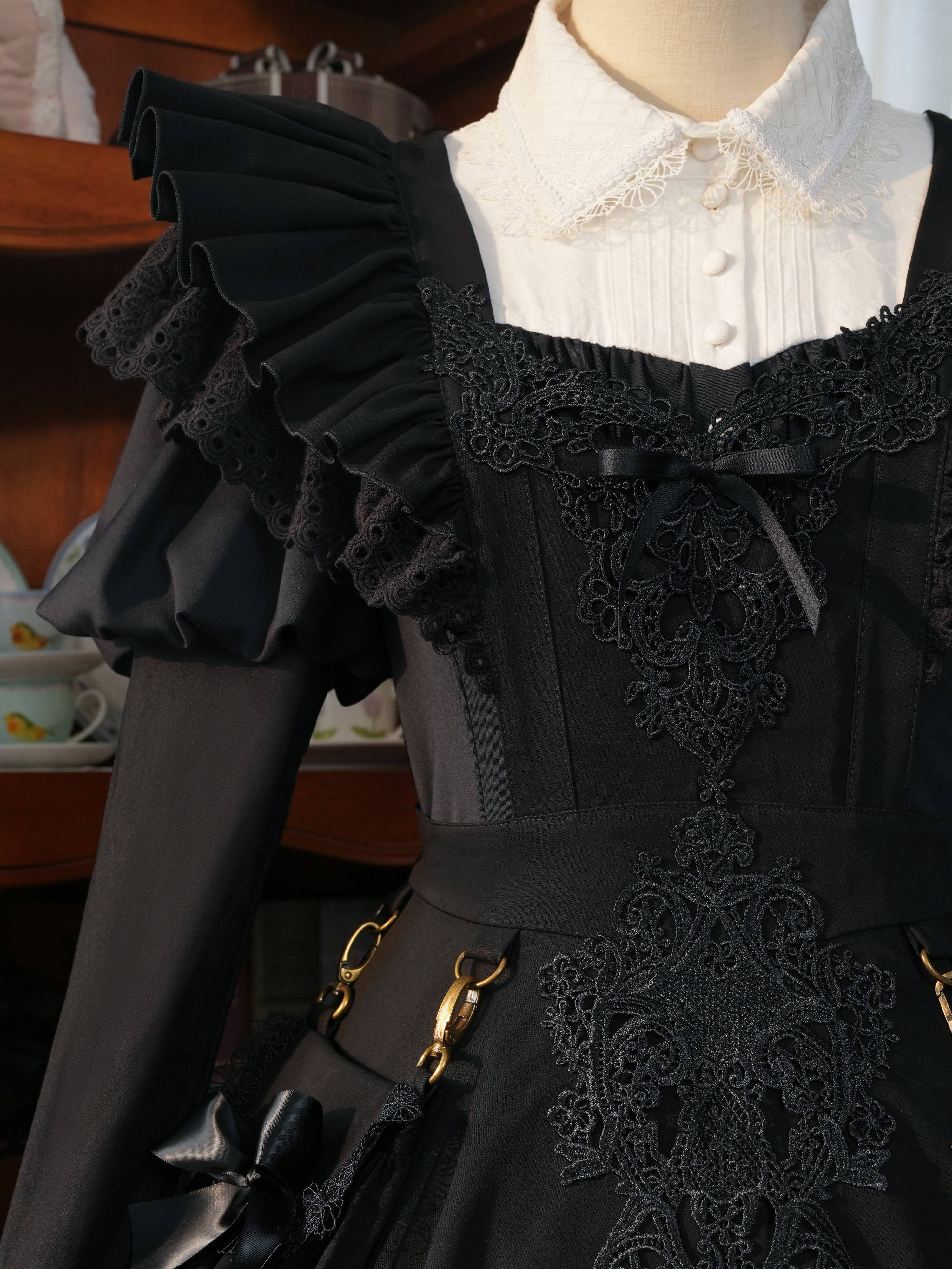 胸元から裾へ流れる装飾が、コーディネートに上品な立体感を与えます。