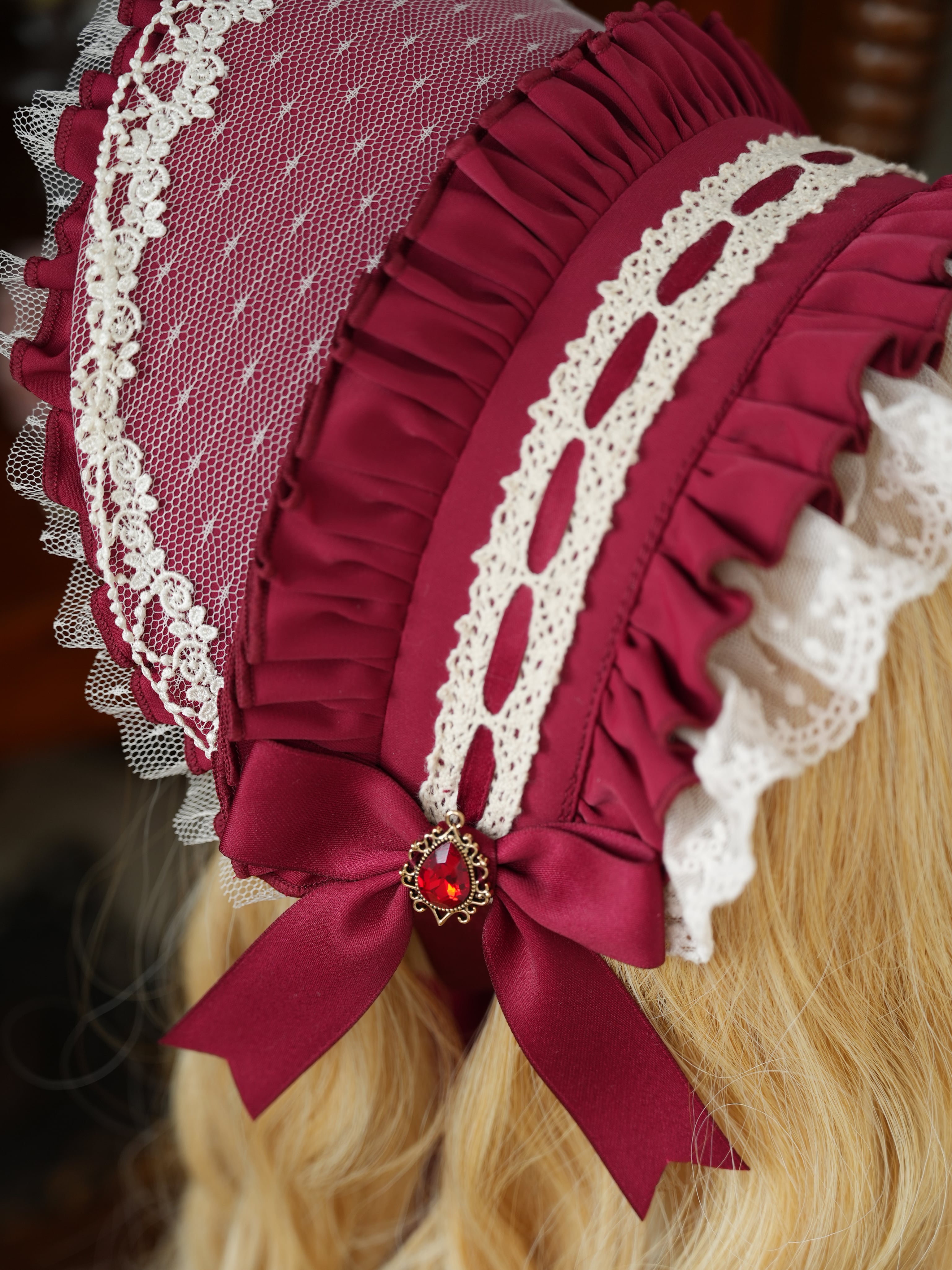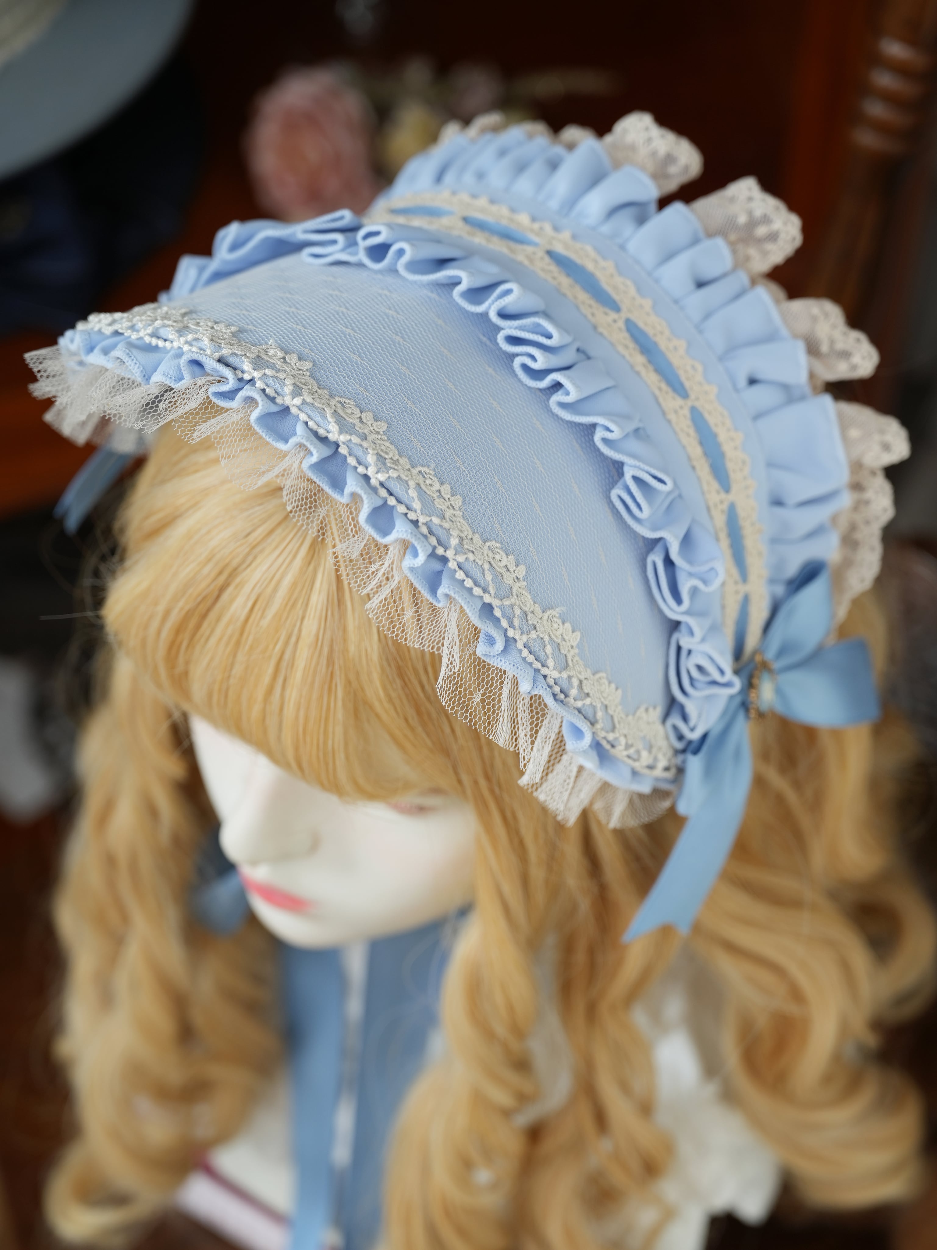 繊細なレースとフリルを重ねた、華やかなボンネット。