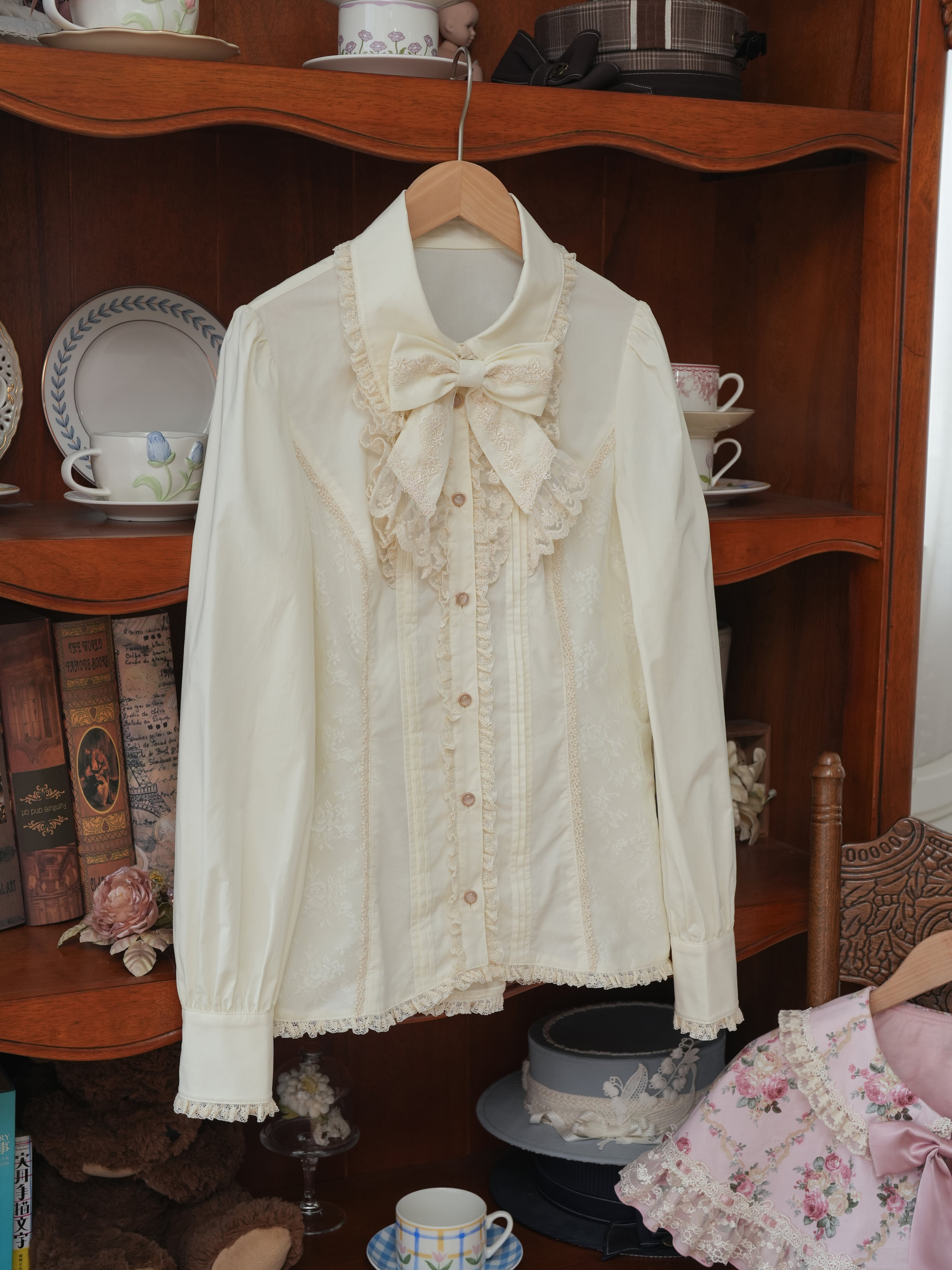 レースとフリルを重ねた、クラシカルな印象のブラウス。