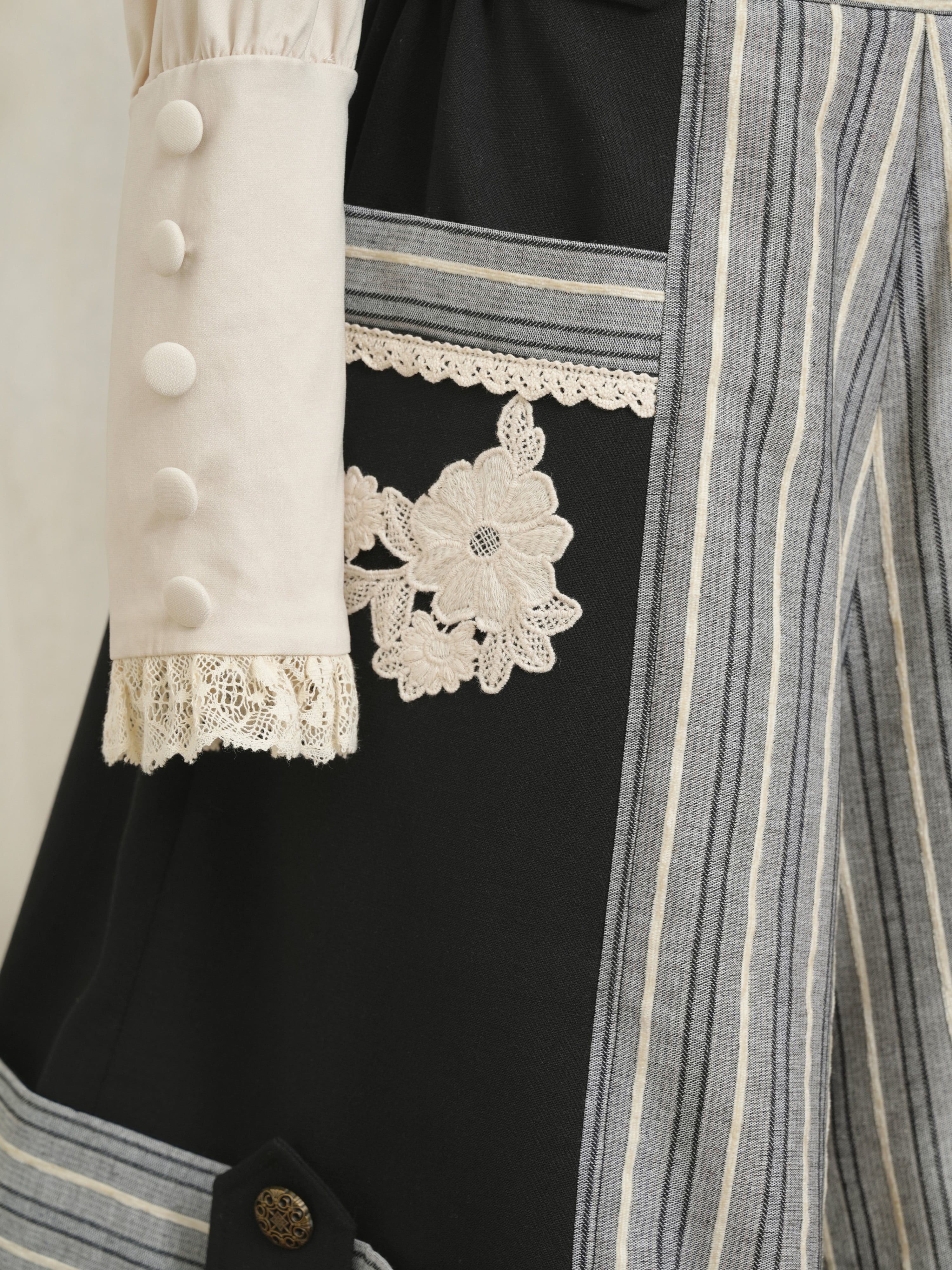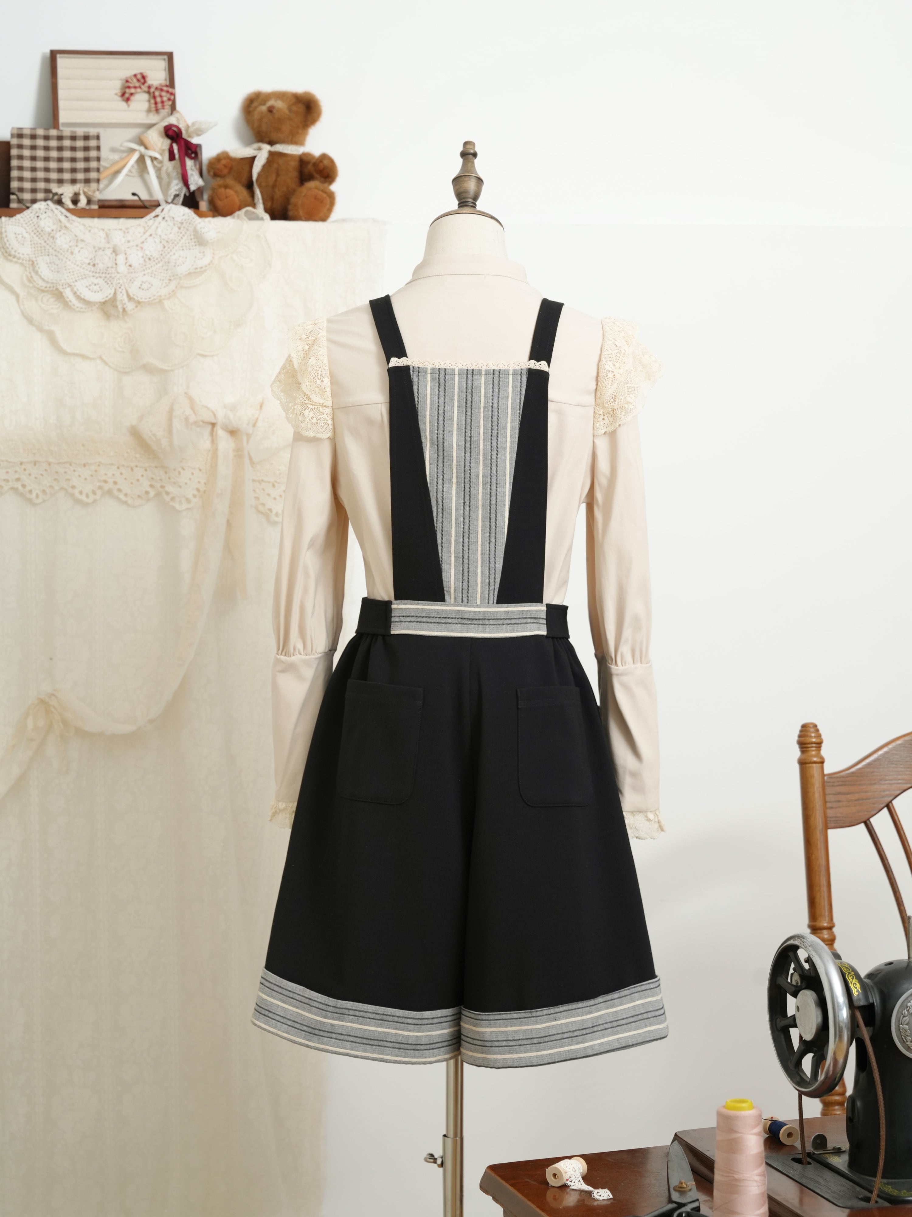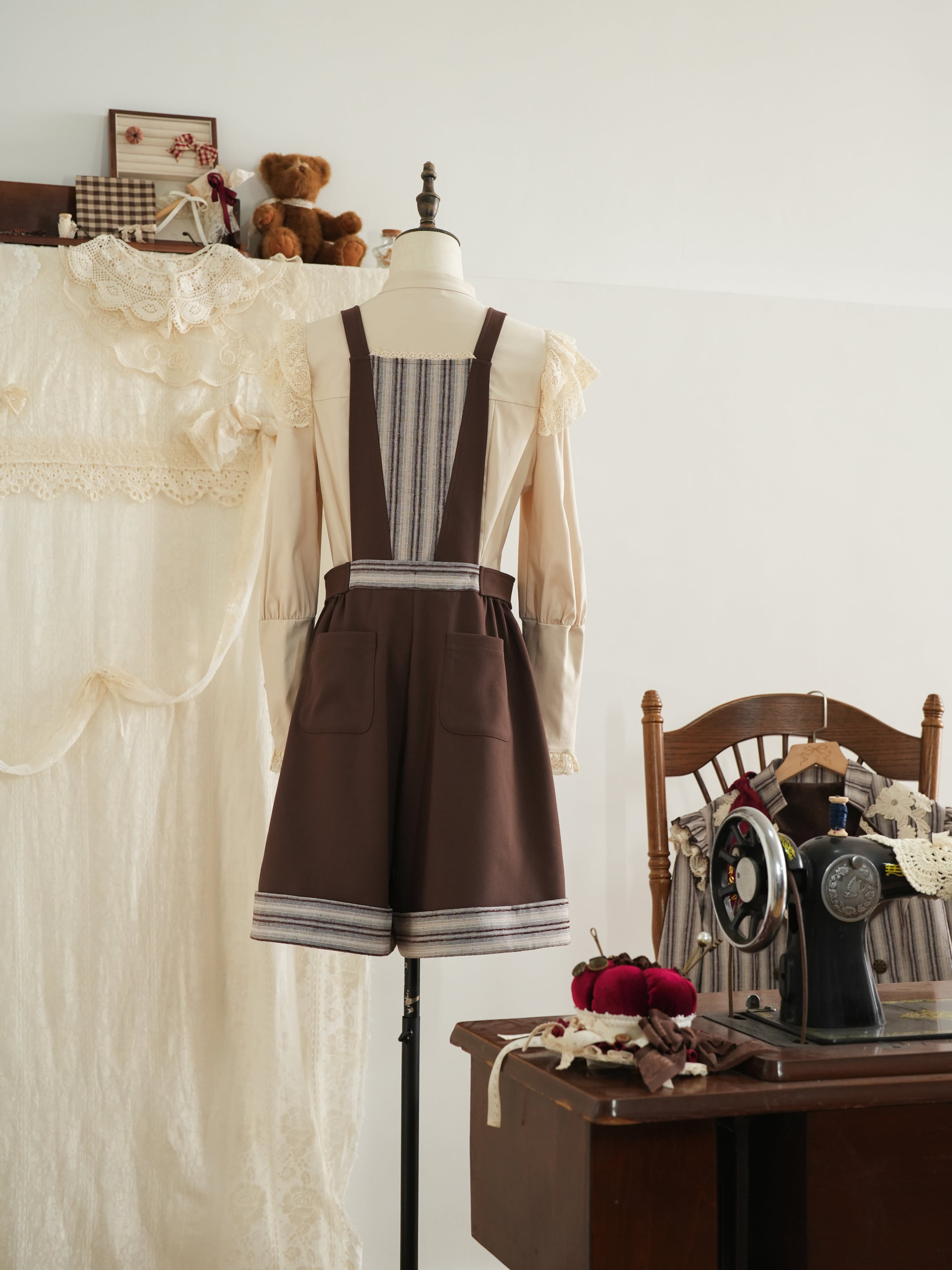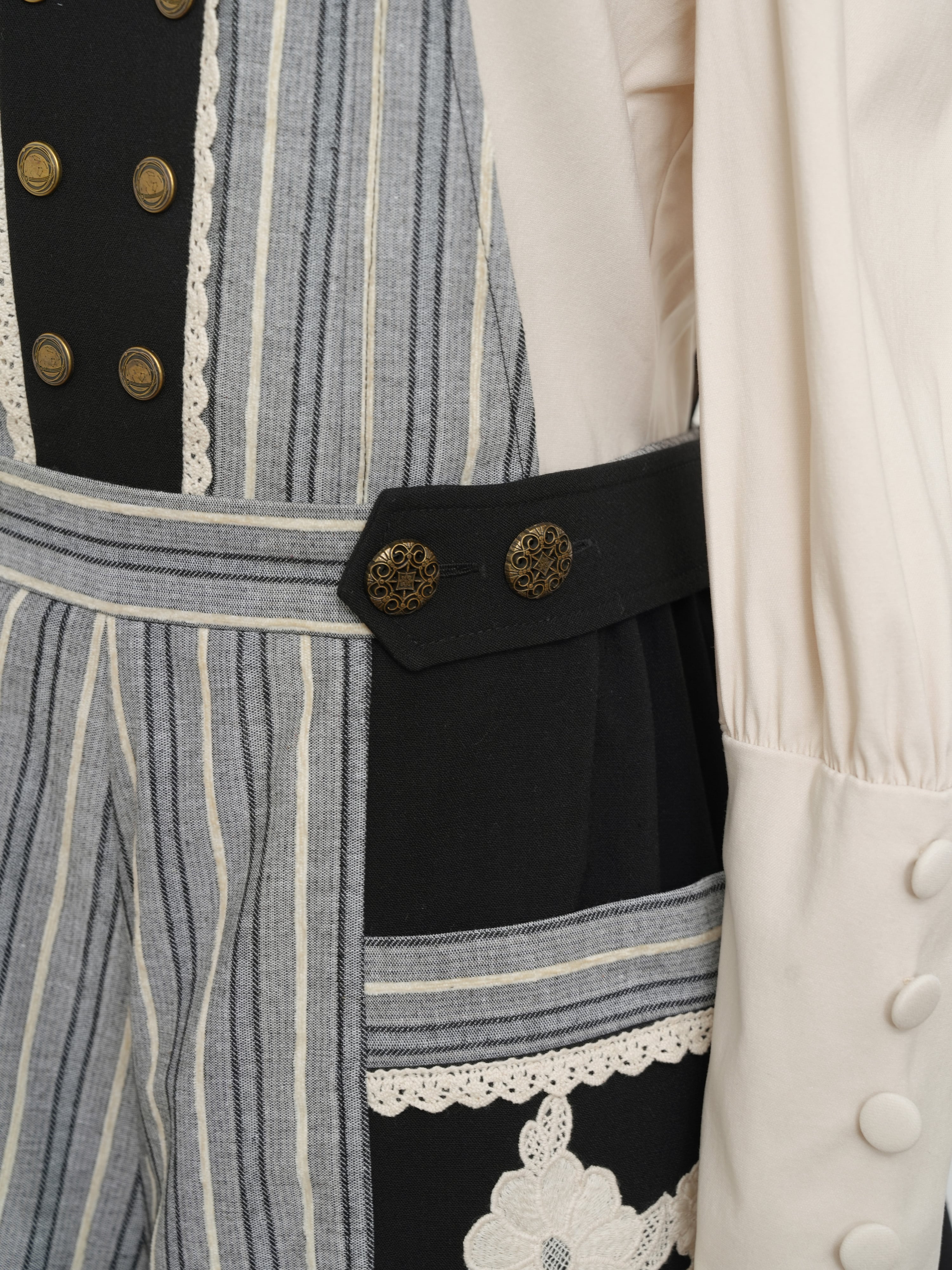包み紙のようなストライプとやわらかな無地を繋ぎ合わせた遊び心満載のサロペット。