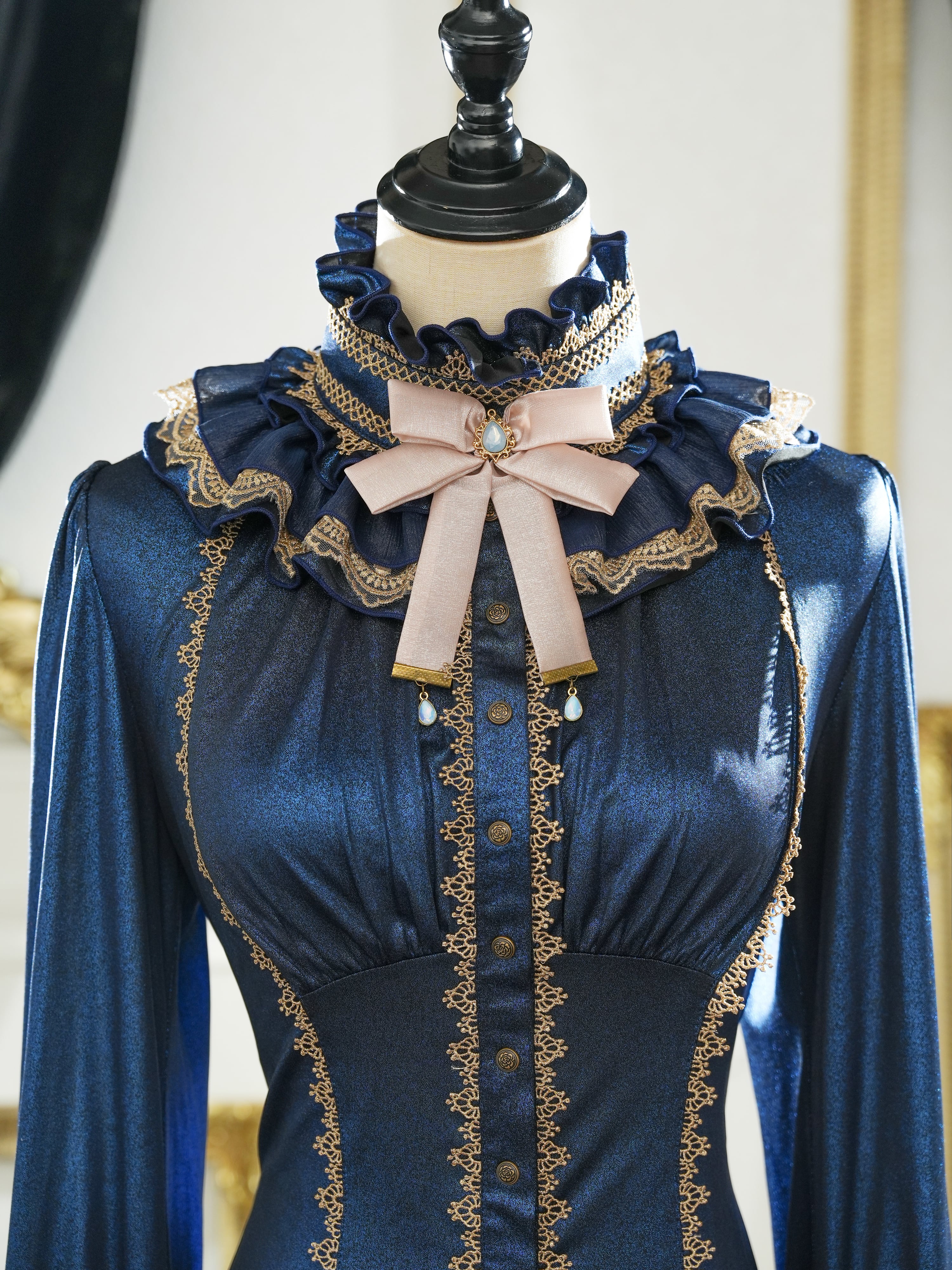 星空のようなキラキラのネイビーブルー生地と太陽光をイメージした金ラメの入った―オーガンジーの組み合わせ。
