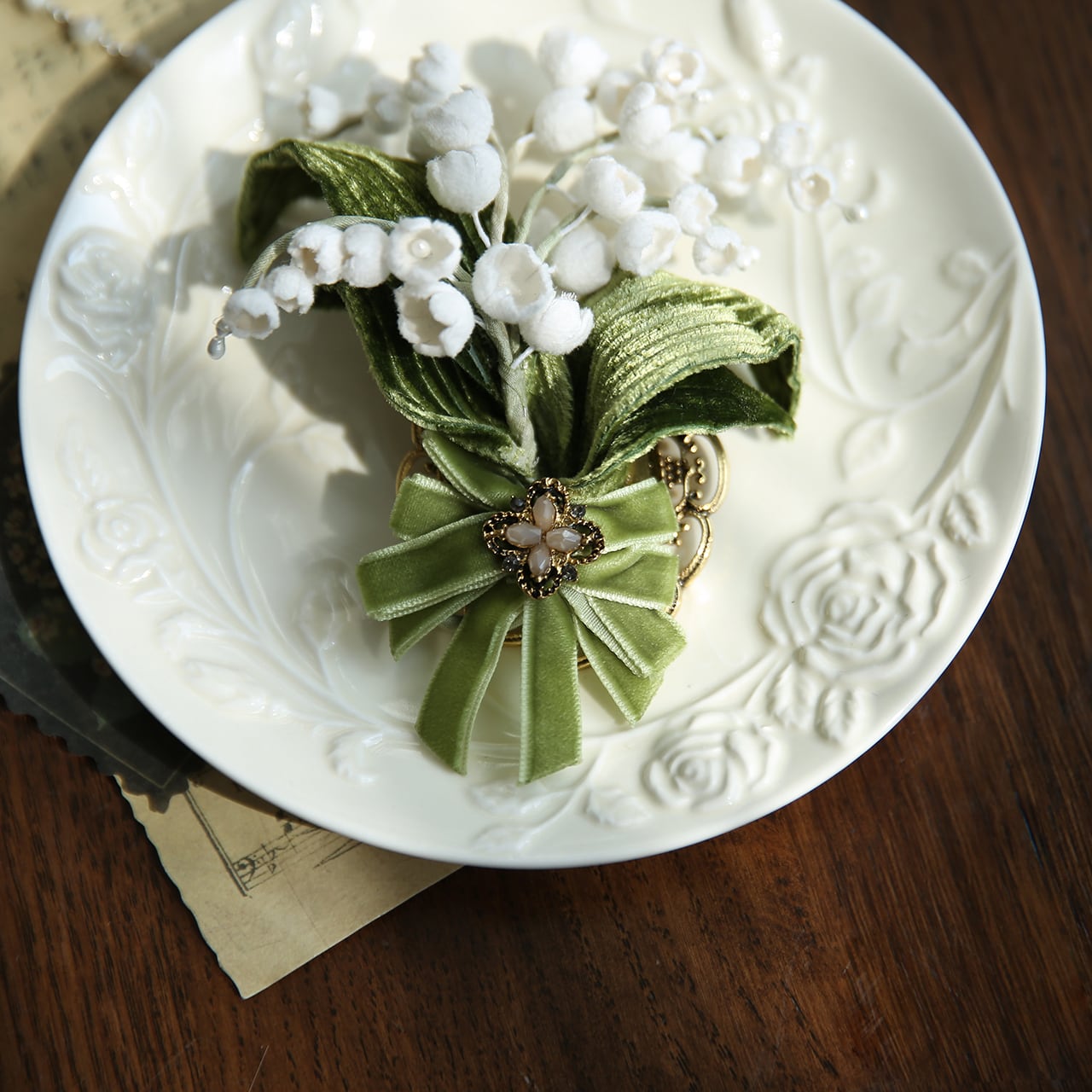 可憐なすずらんの花束をモチーフにしたコサージュ。