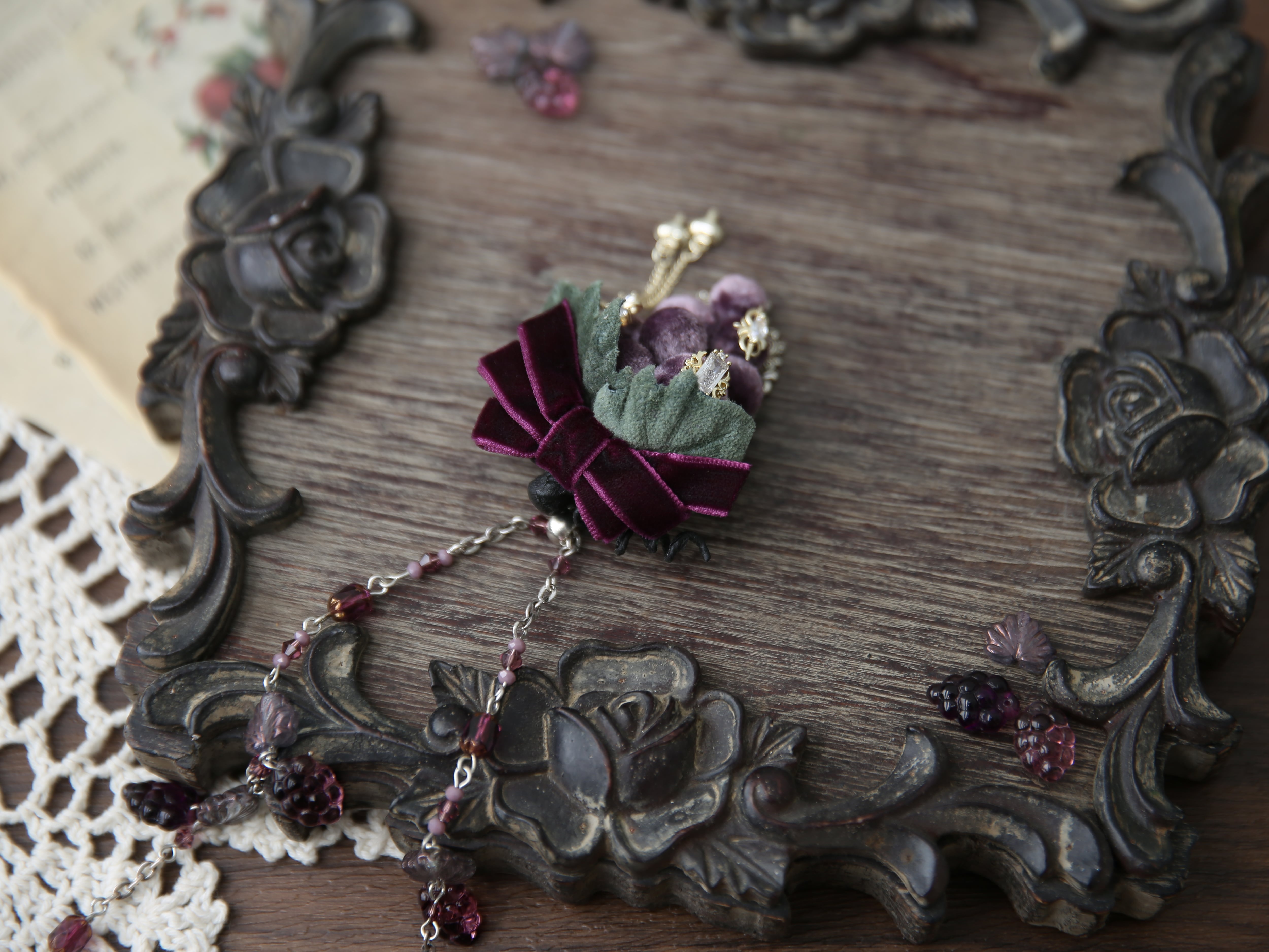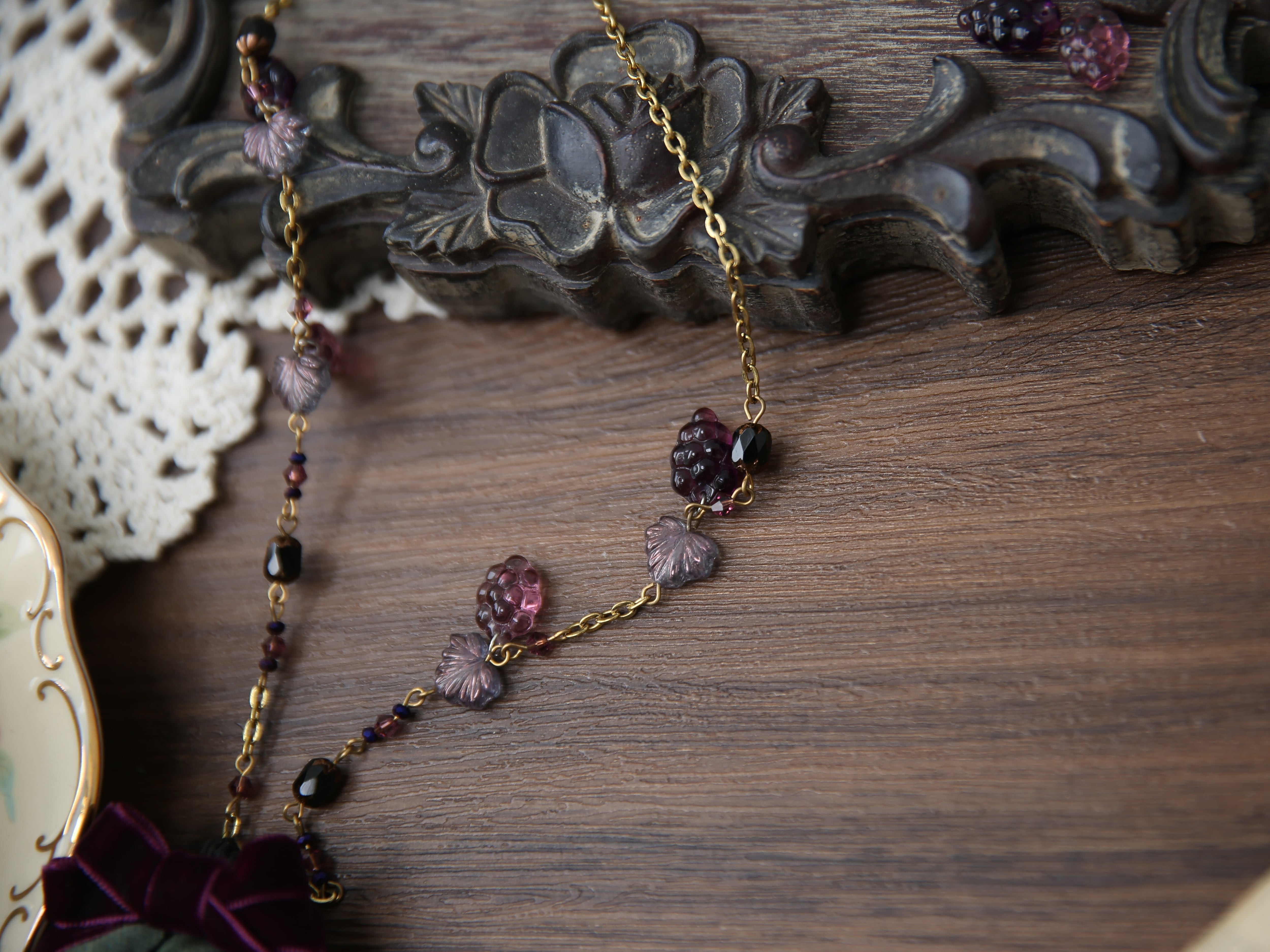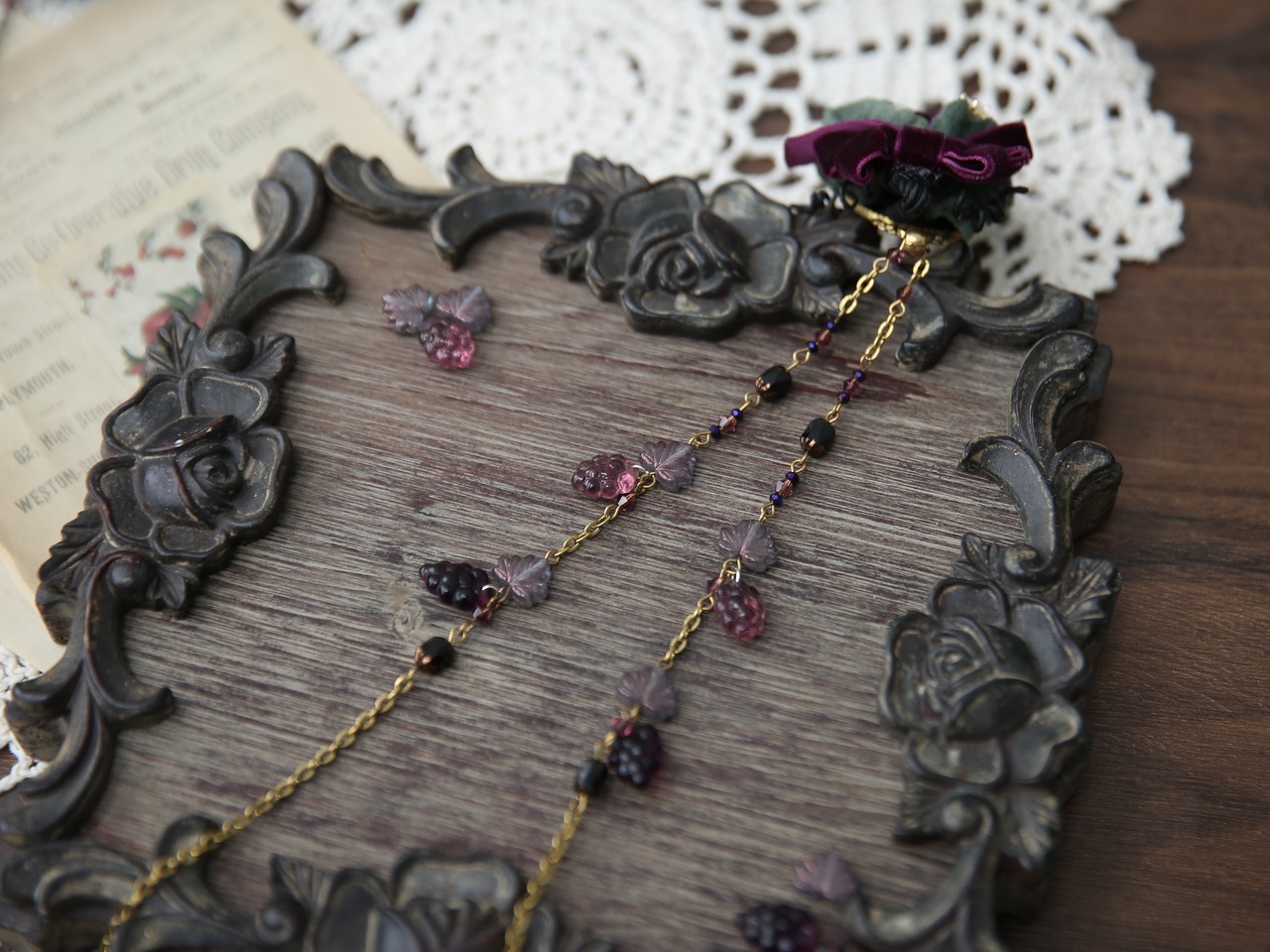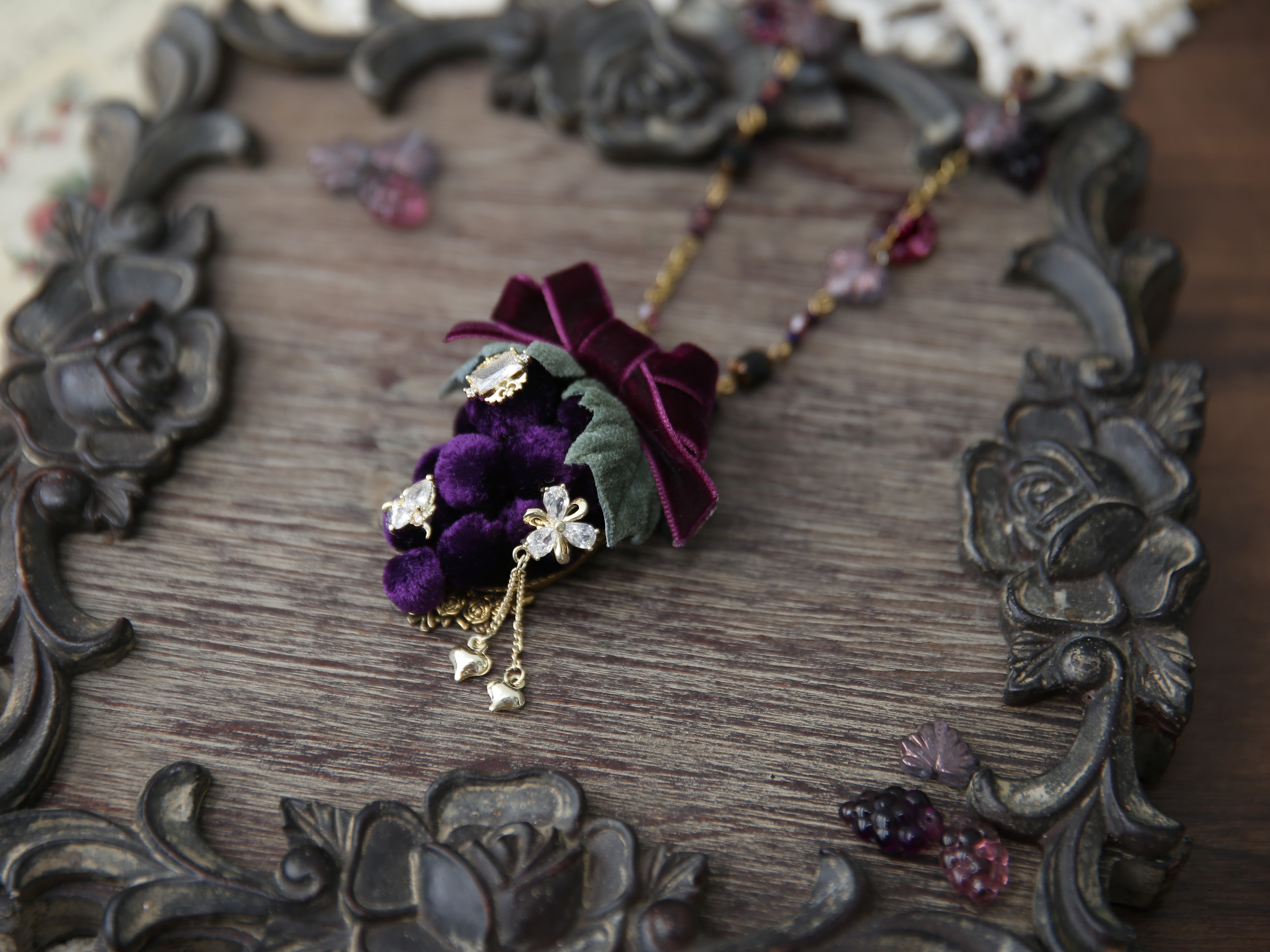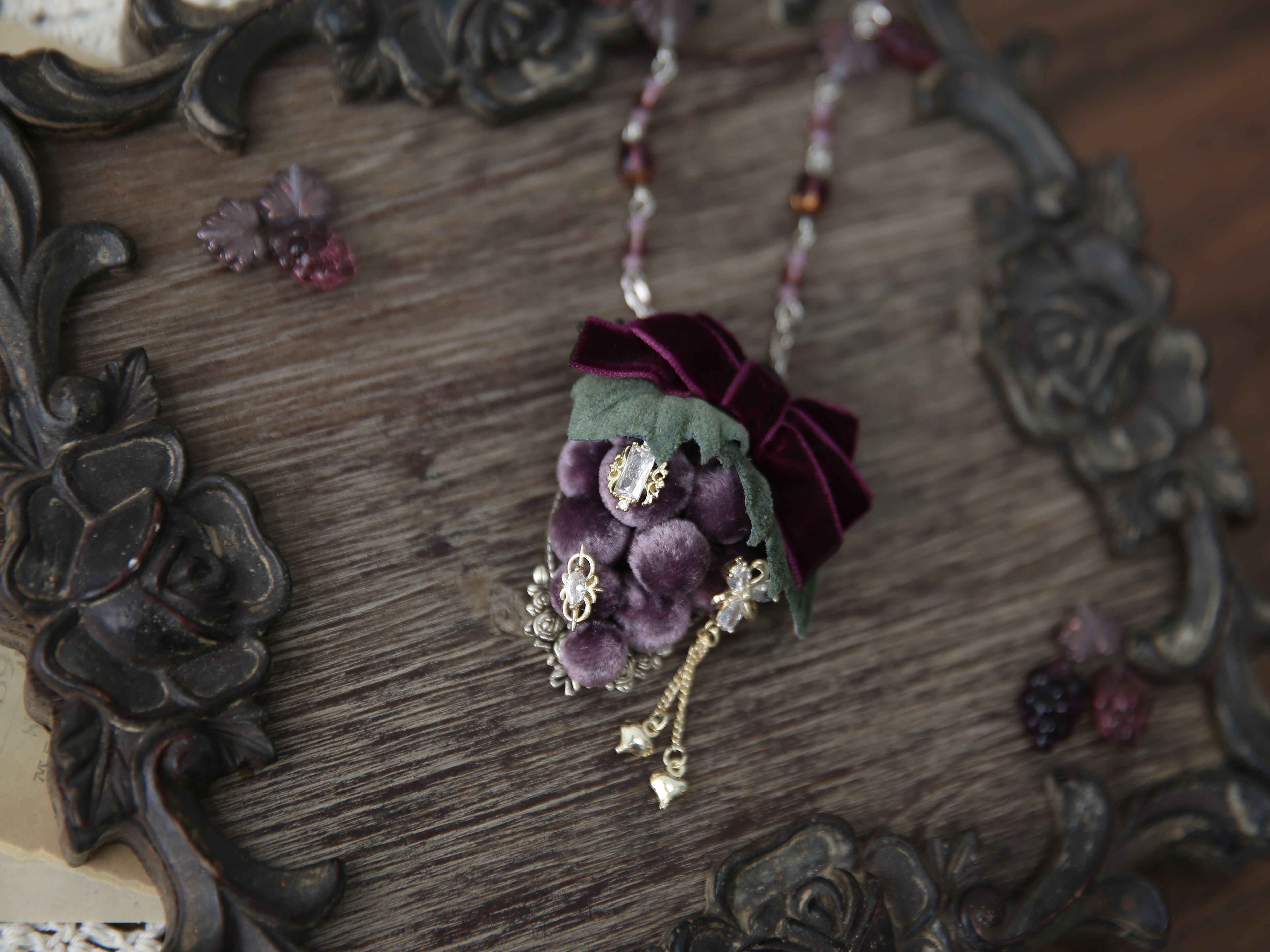 プラスチックパールをベルベットで包みボタン技法によって葡萄の実モチーフにしたペンダント、そして、チェーンにもキュートな葡萄と葉っぱがついています♡