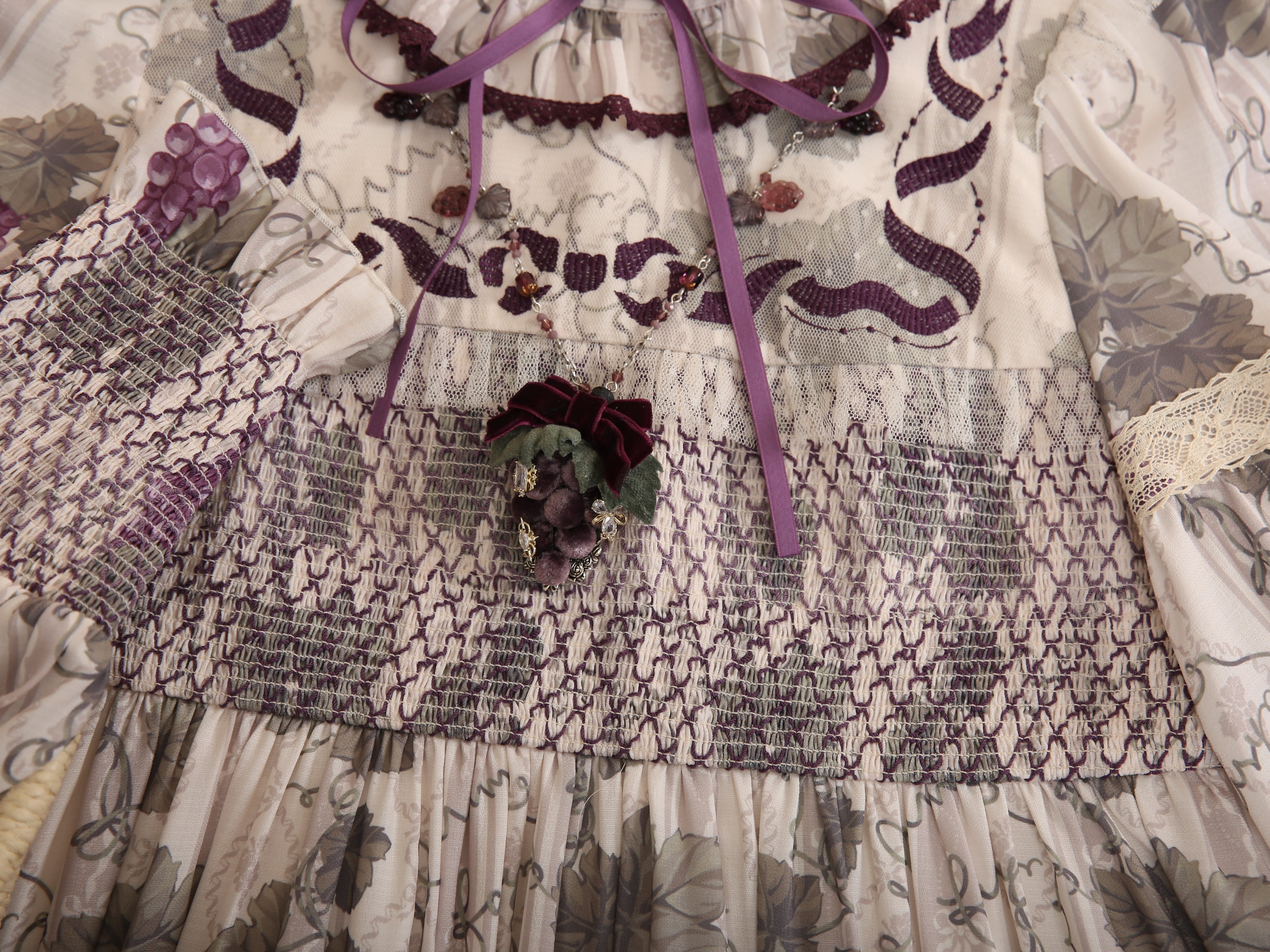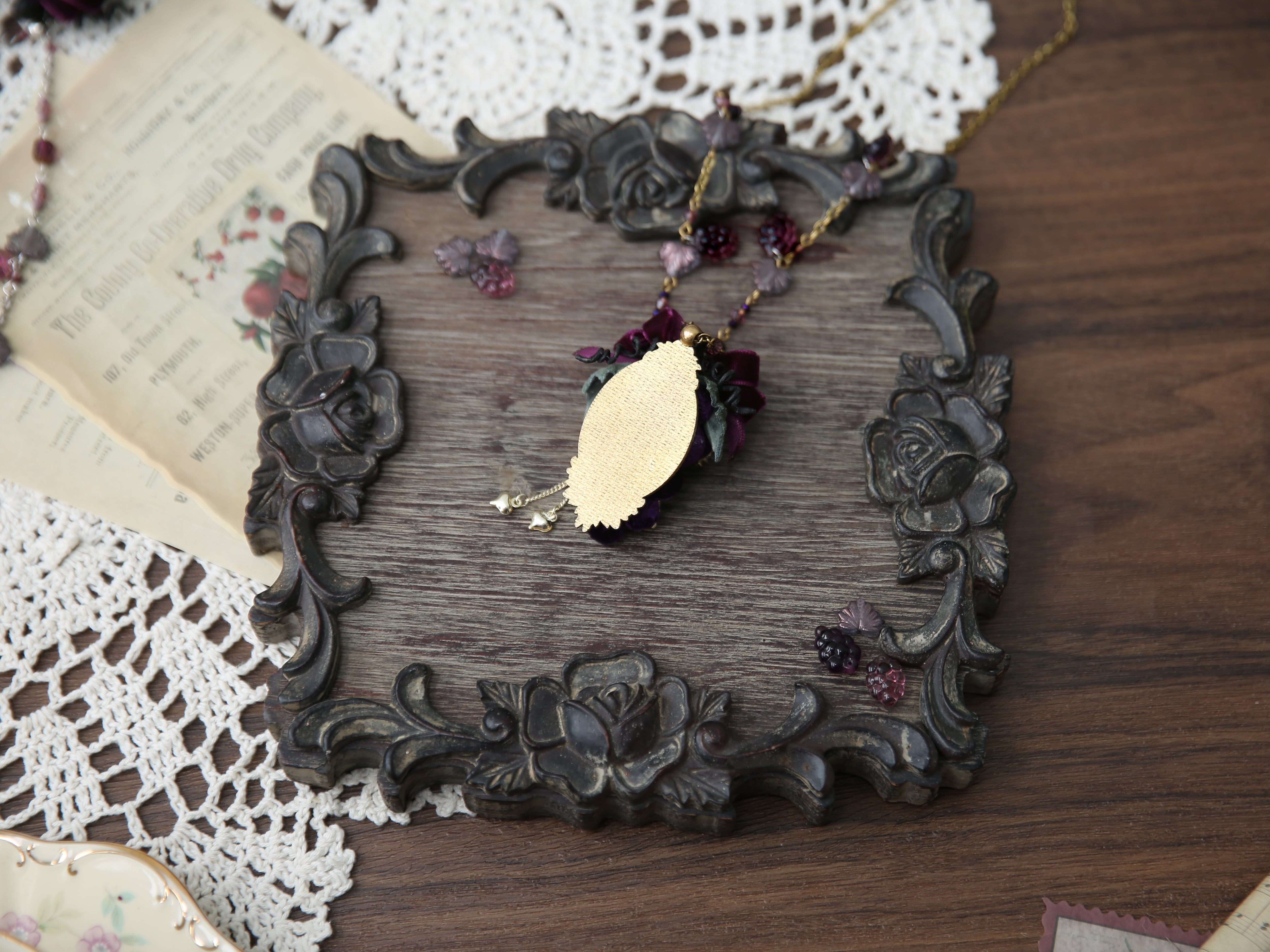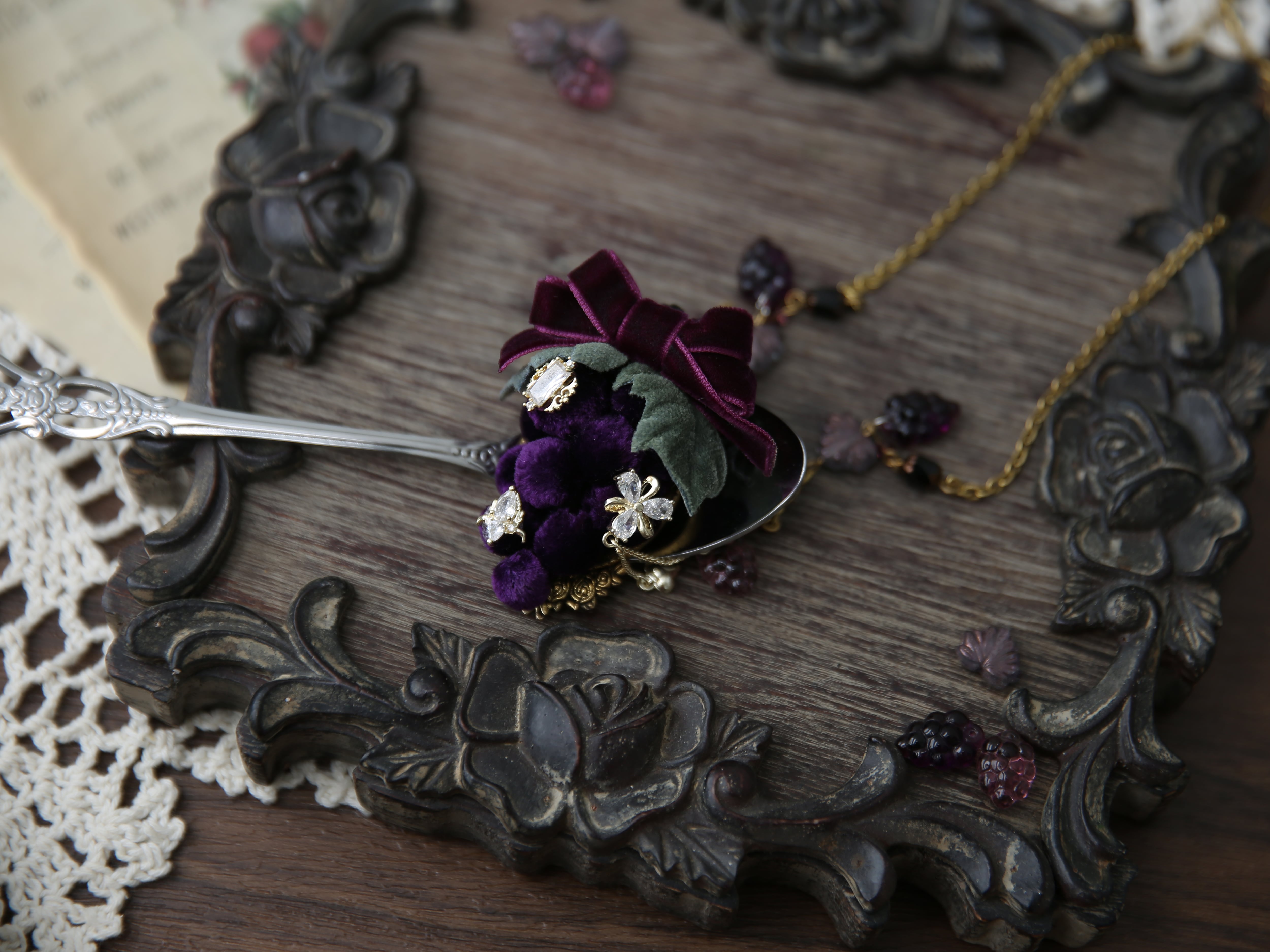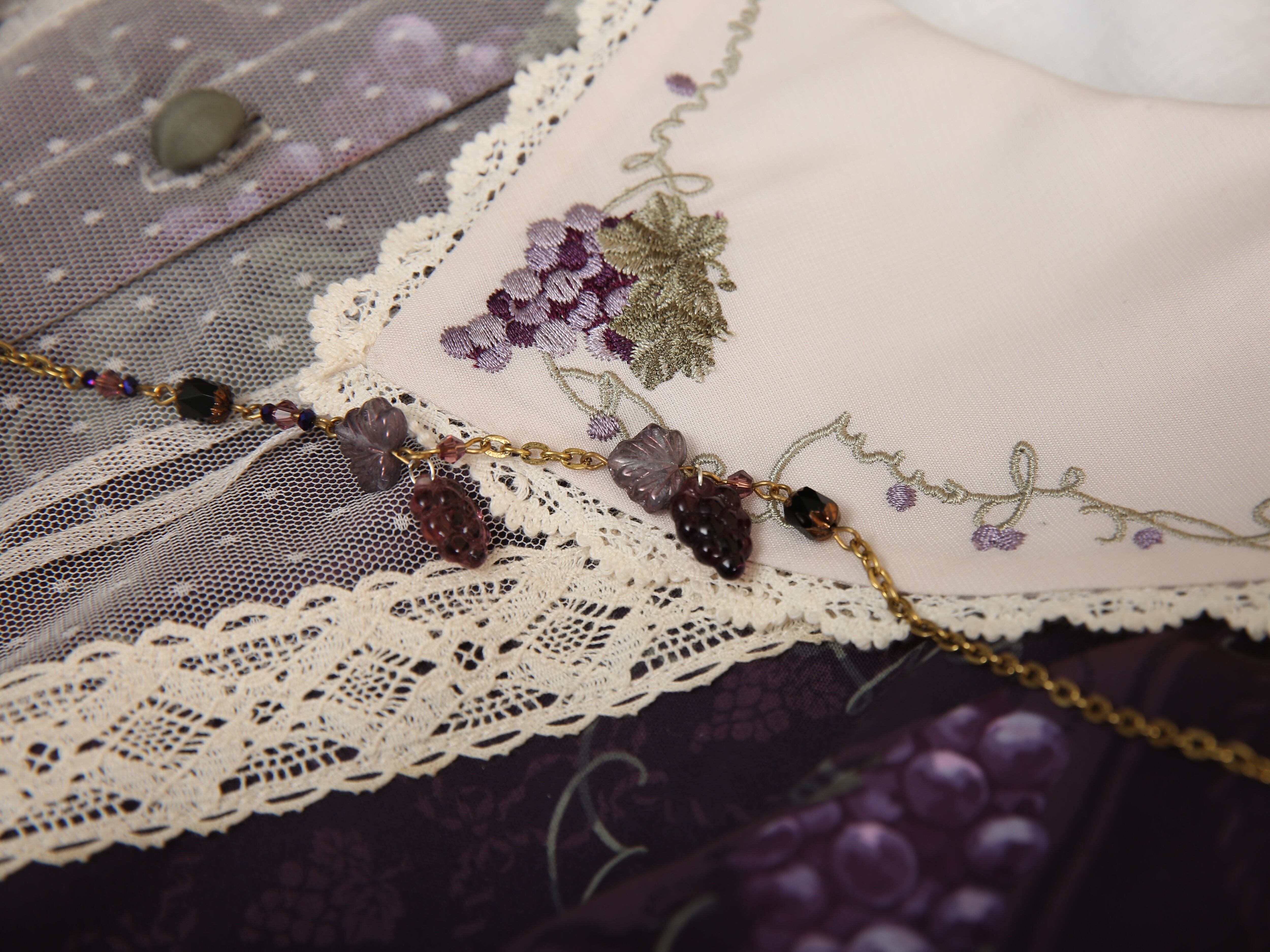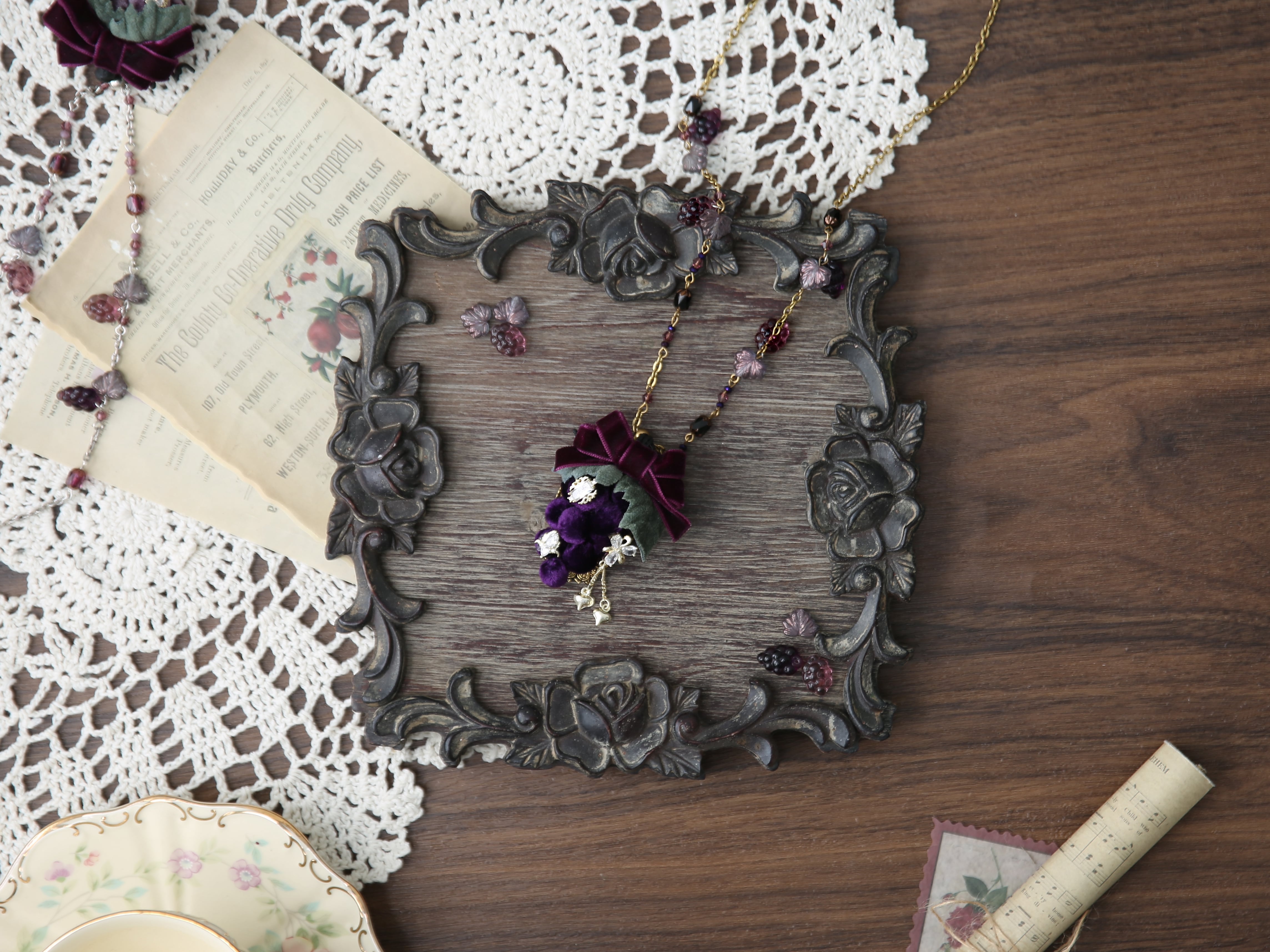 プラスチックパールをベルベットで包みボタン技法によって葡萄の実モチーフにしたペンダント、そして、チェーンにもキュートな葡萄と葉っぱがついています♡