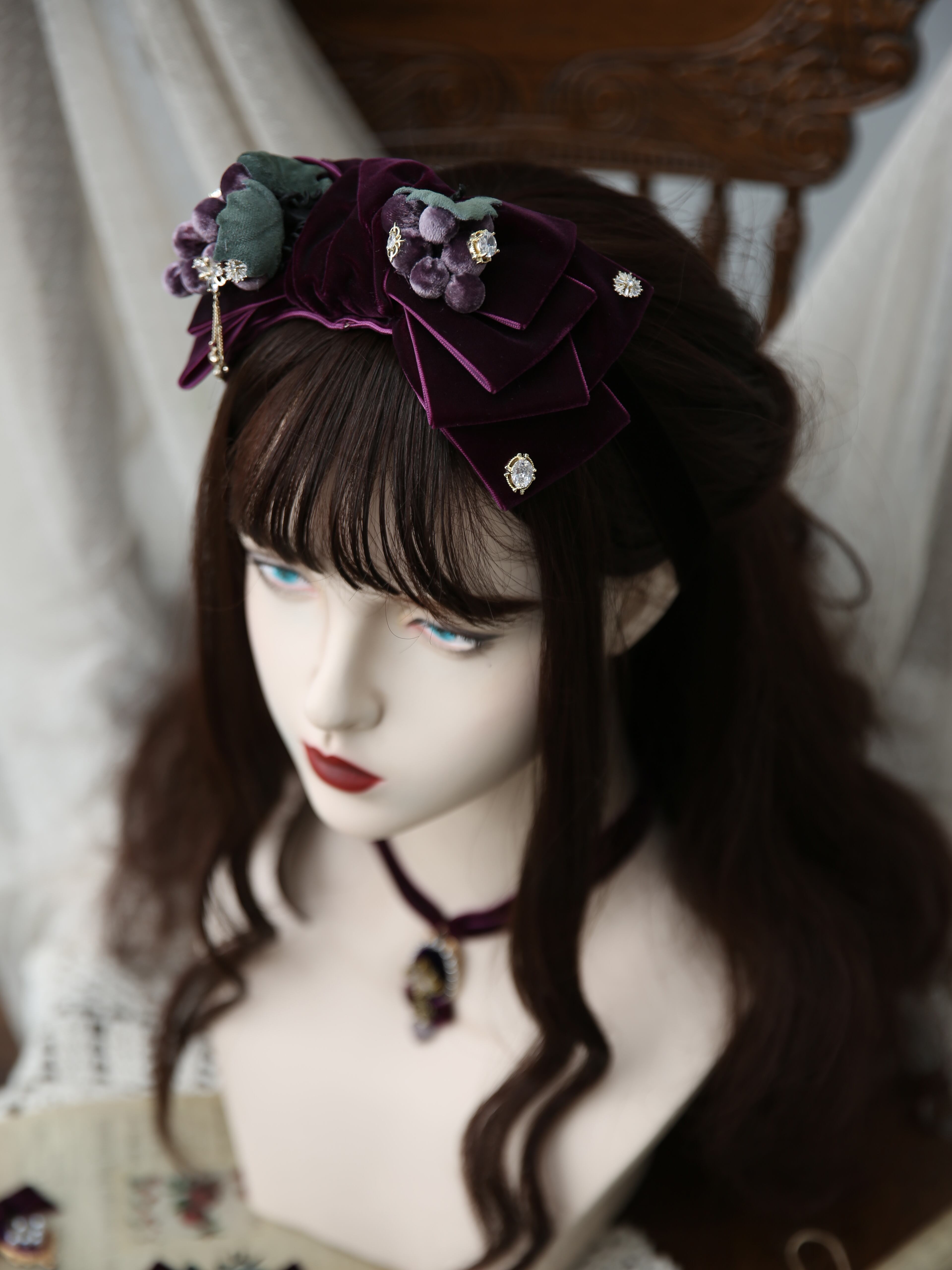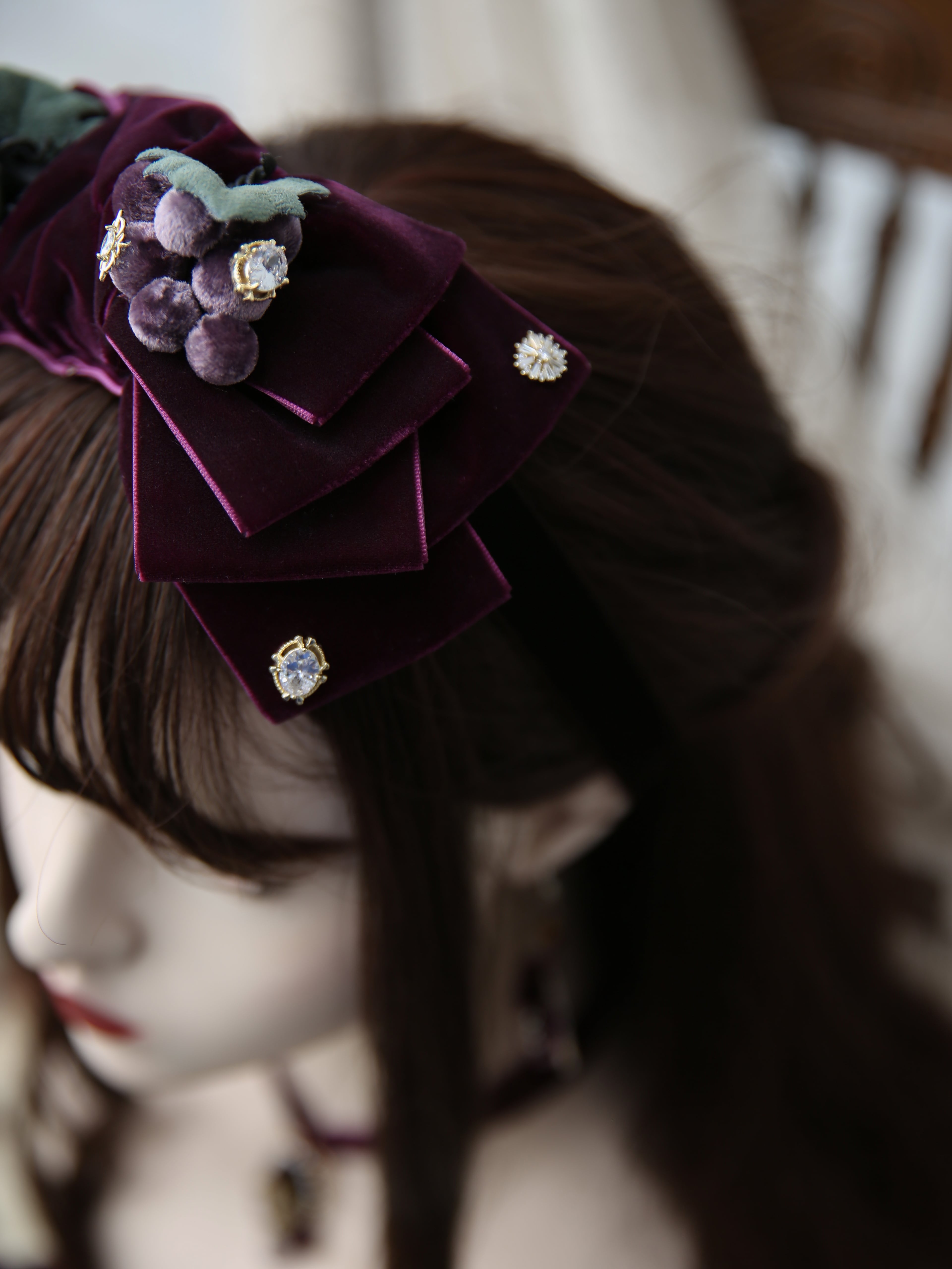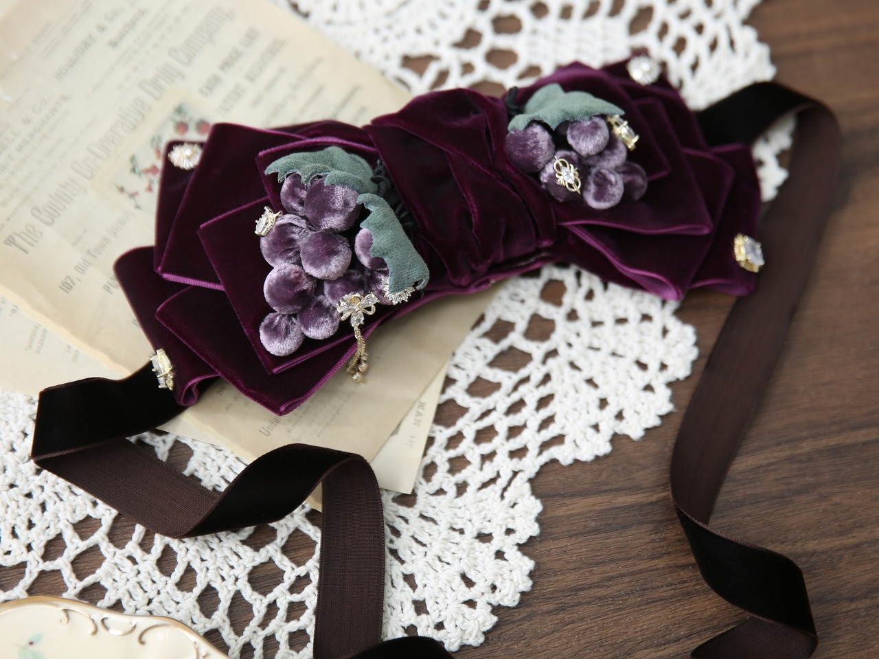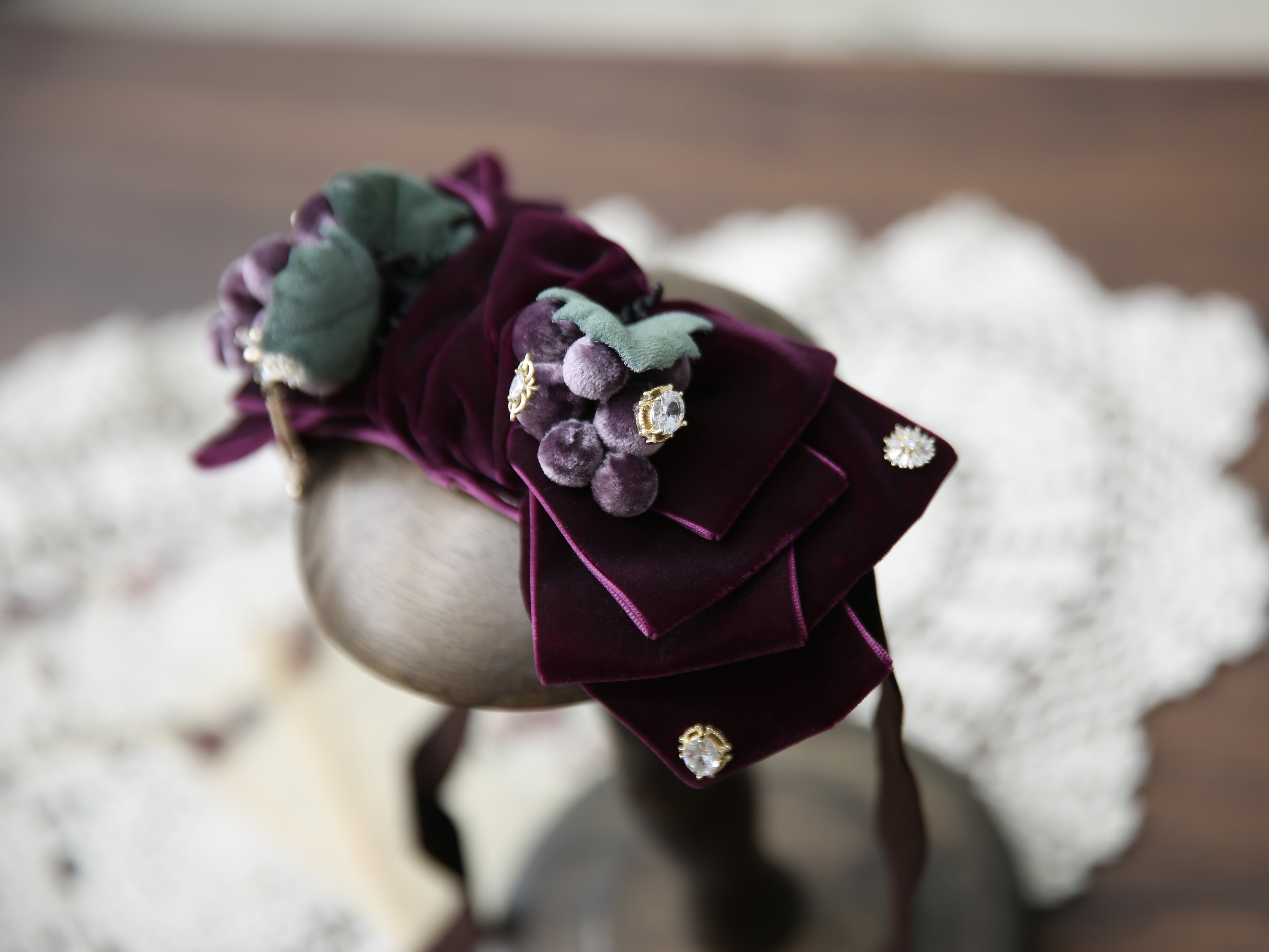 ベルベット地を重ねたリボンの上に大小の葡萄を左右にちょこんとあしらったデザイン。