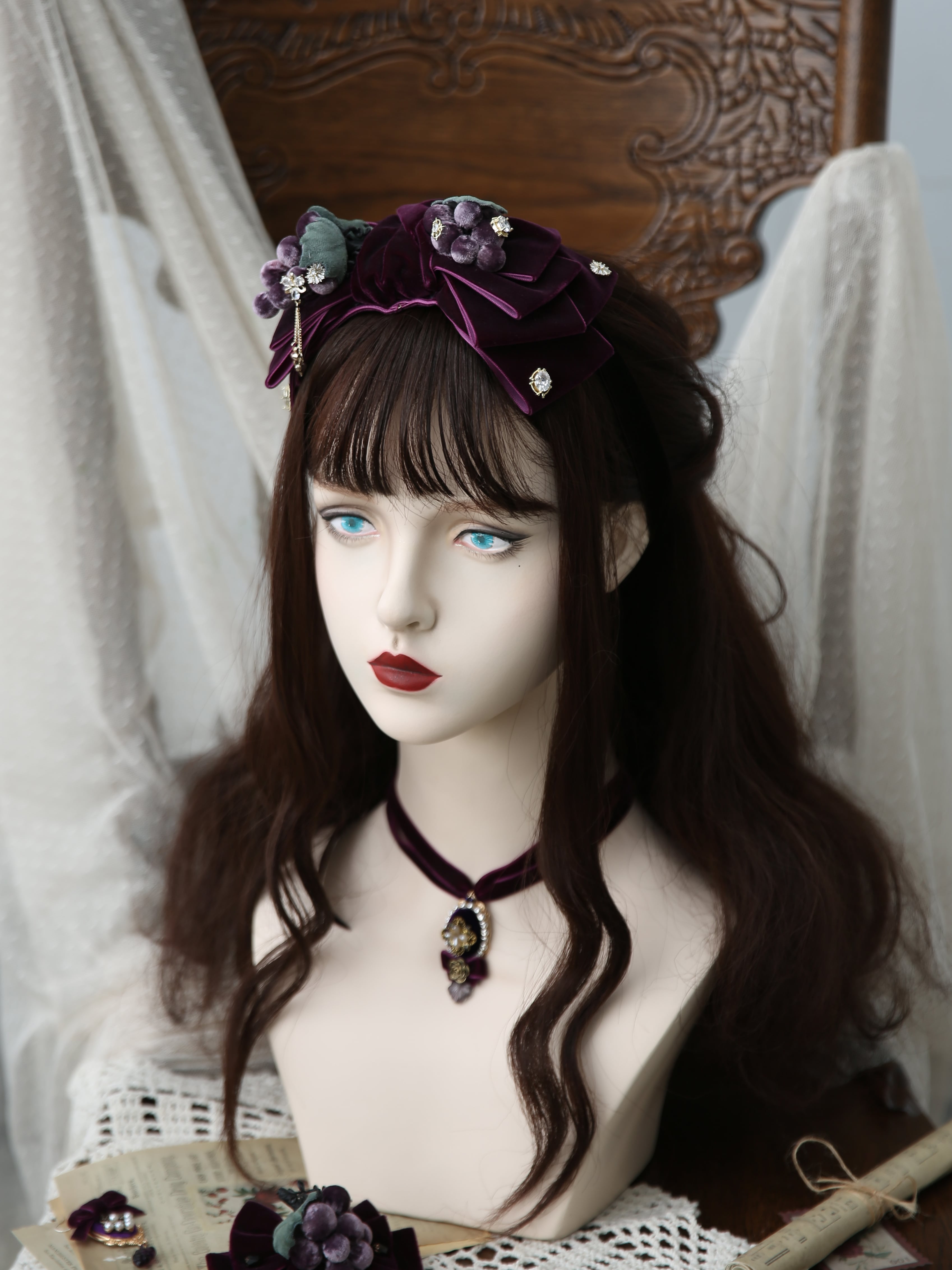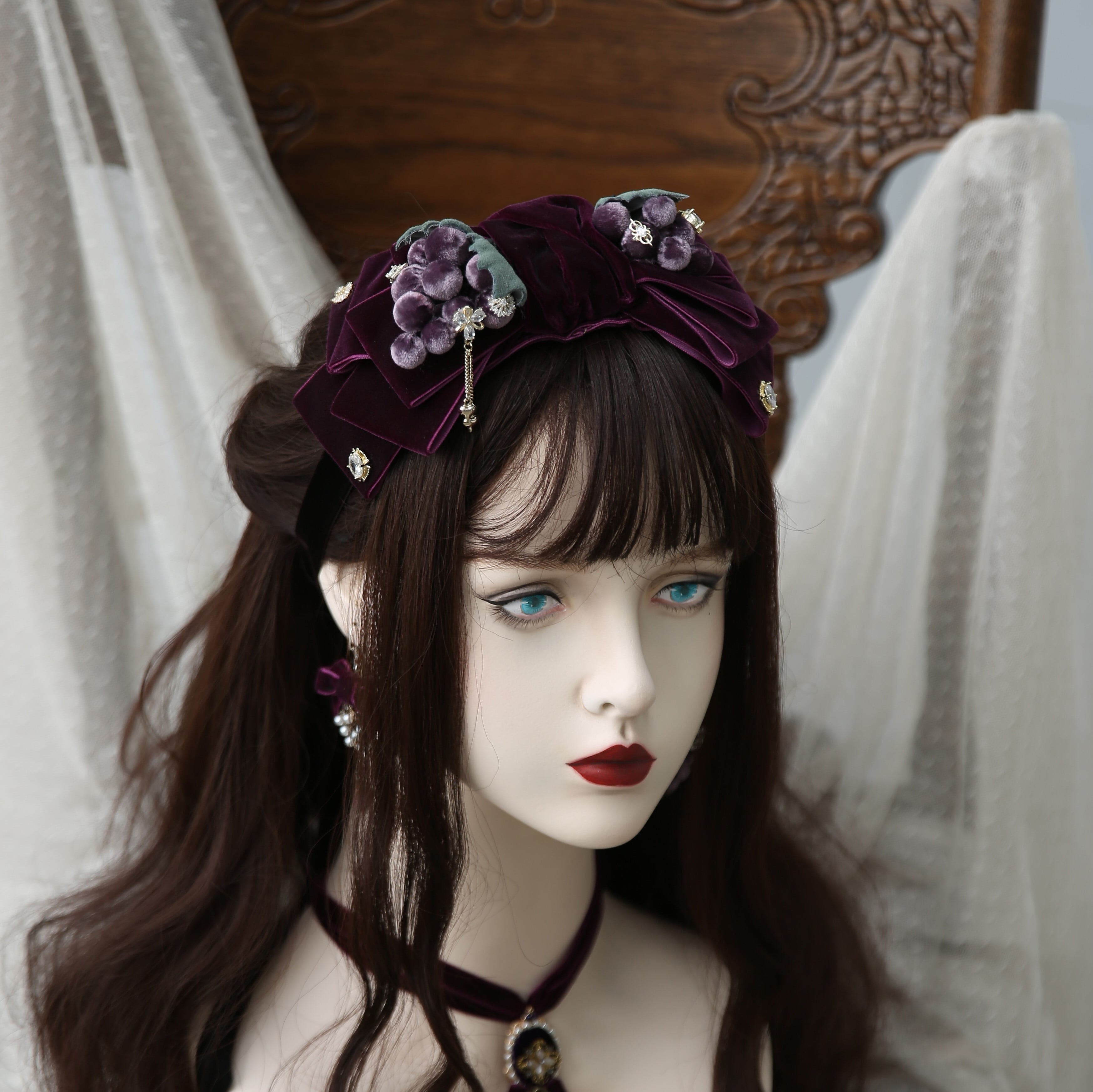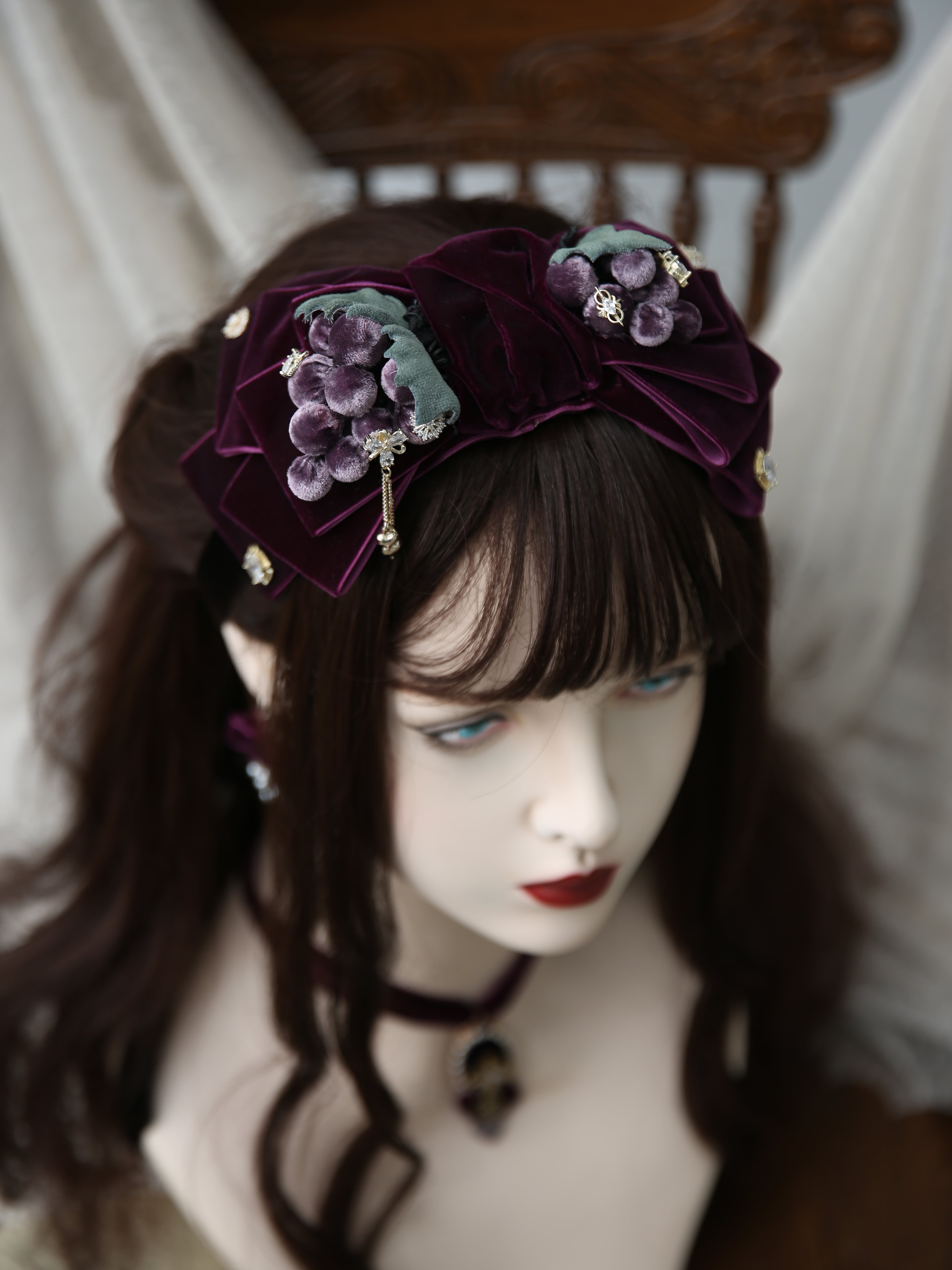 ベルベット地を重ねたリボンの上に大小の葡萄を左右にちょこんとあしらったデザイン。
