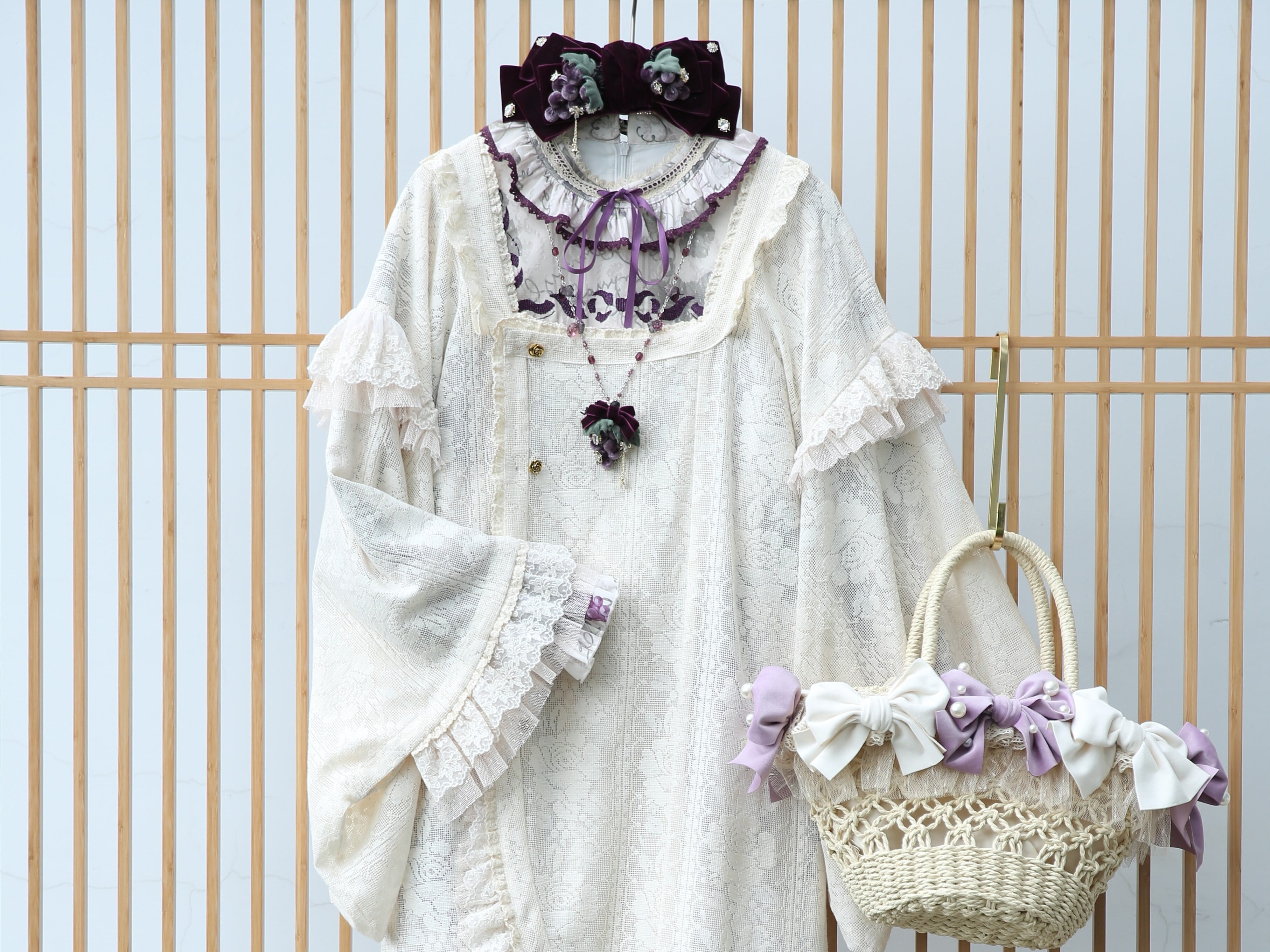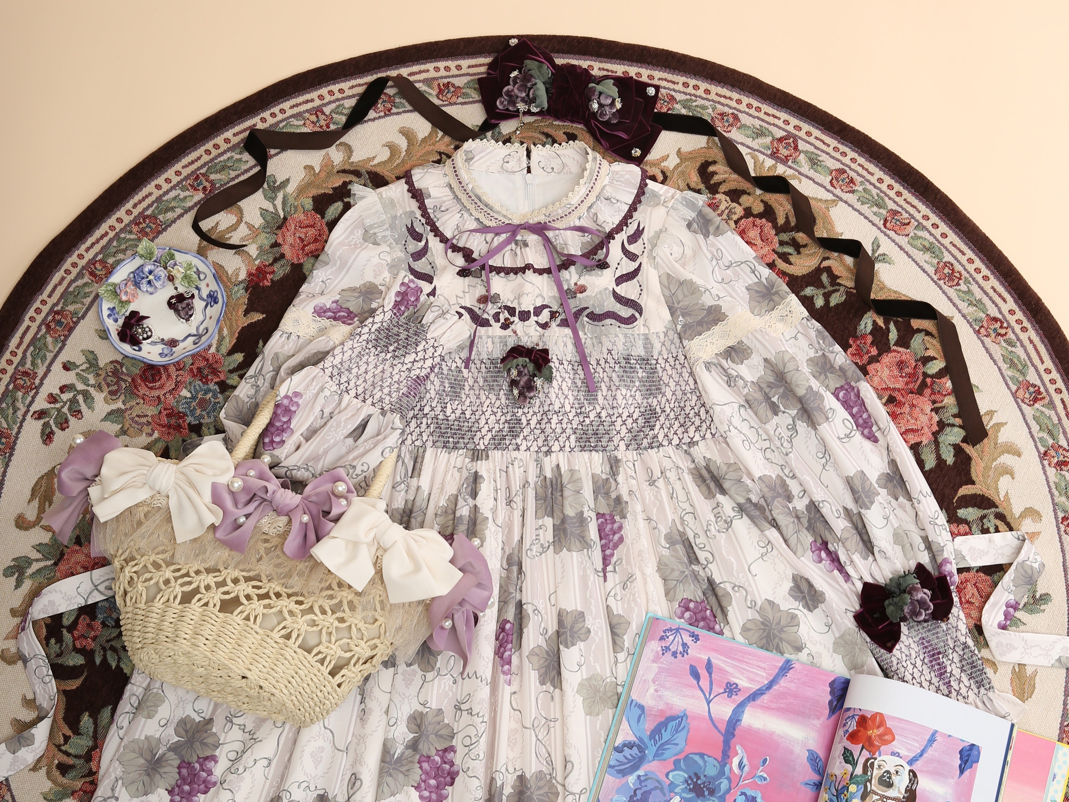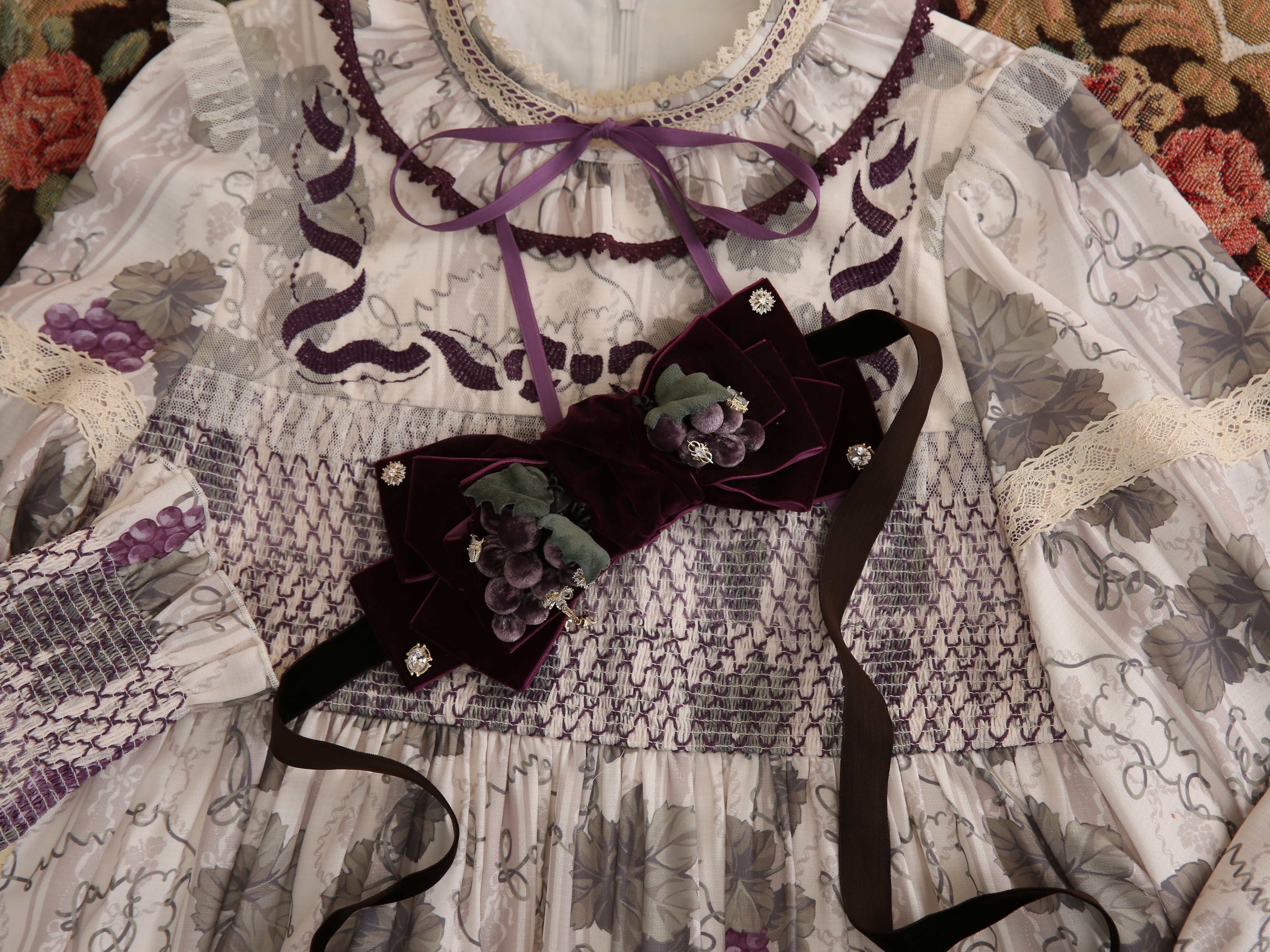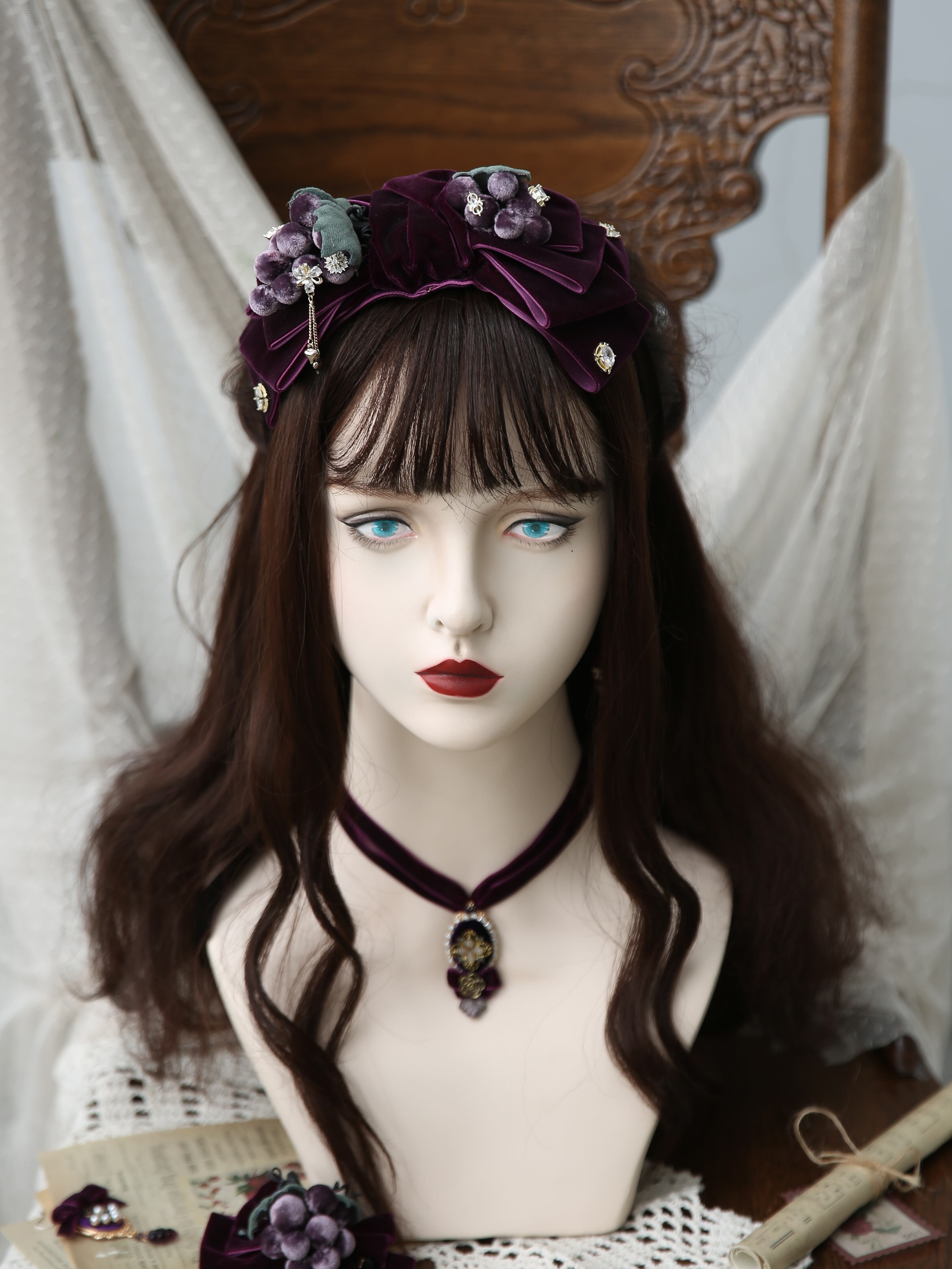 ベルベット地を重ねたリボンの上に大小の葡萄を左右にちょこんとあしらったデザイン。