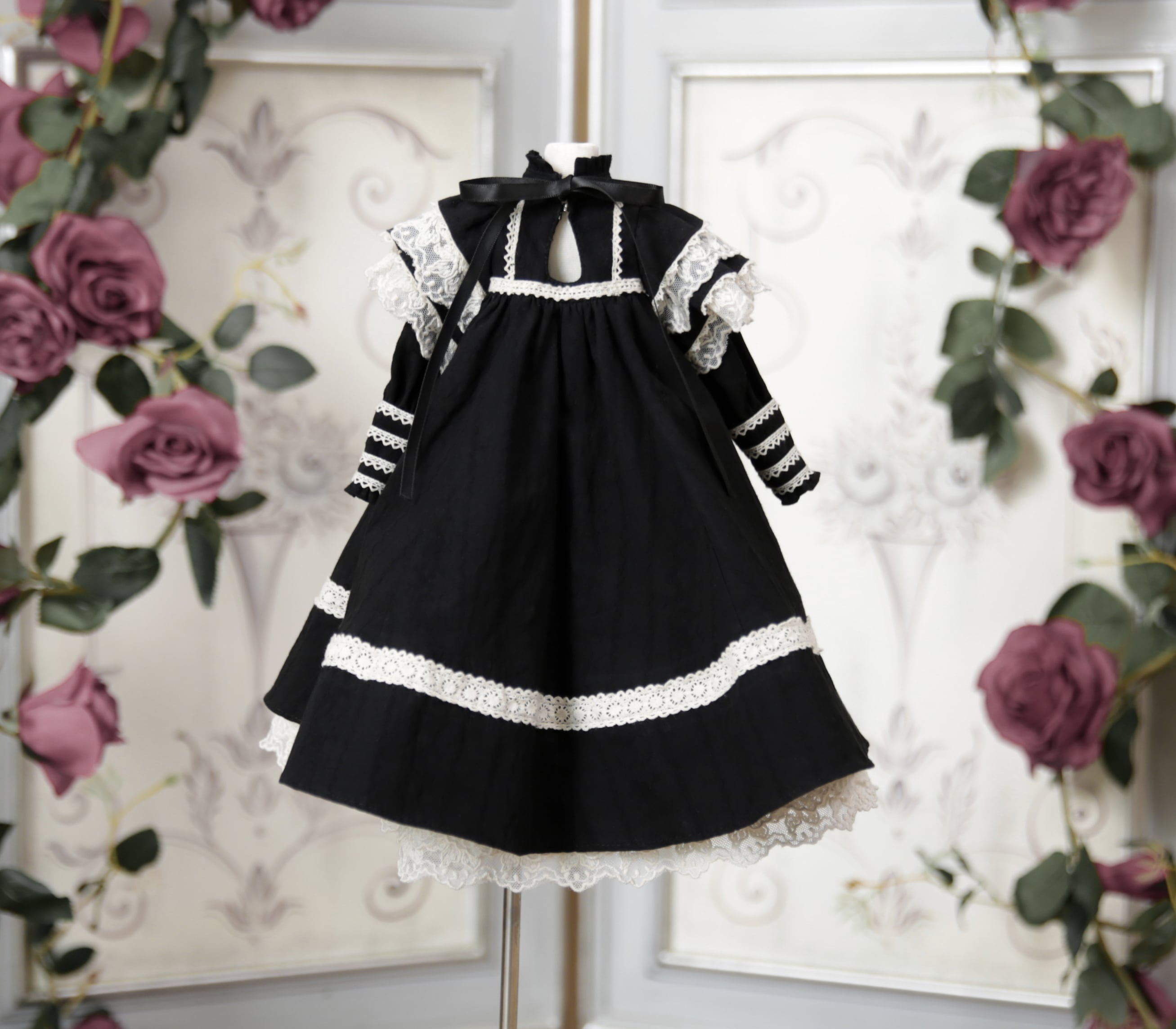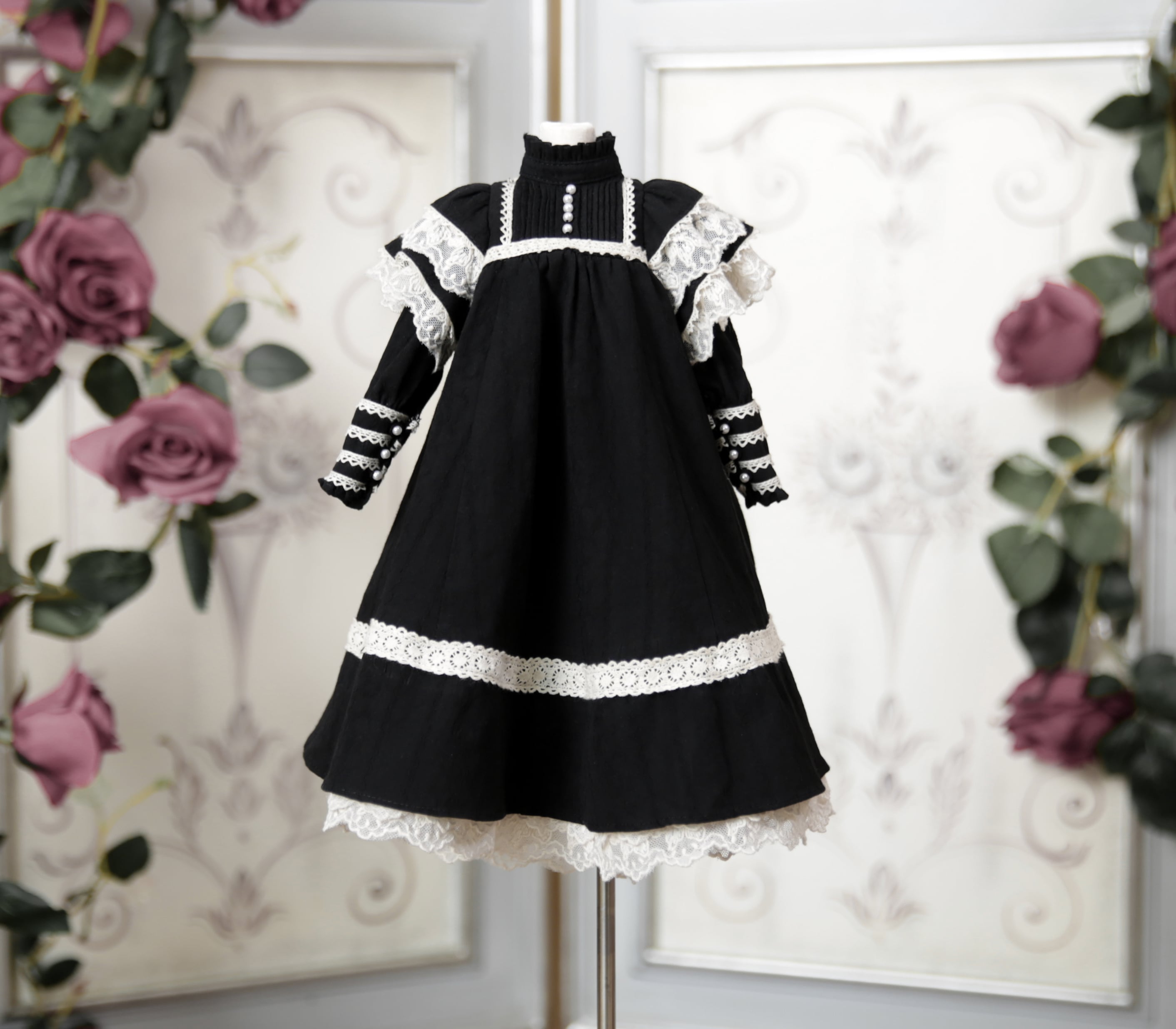 ロング丈モデルは立ち襟のエレガントなデザイン。ショート丈モデルは丸襟の可愛らしいデザイン。どちらもウエストリボンが付属しております。