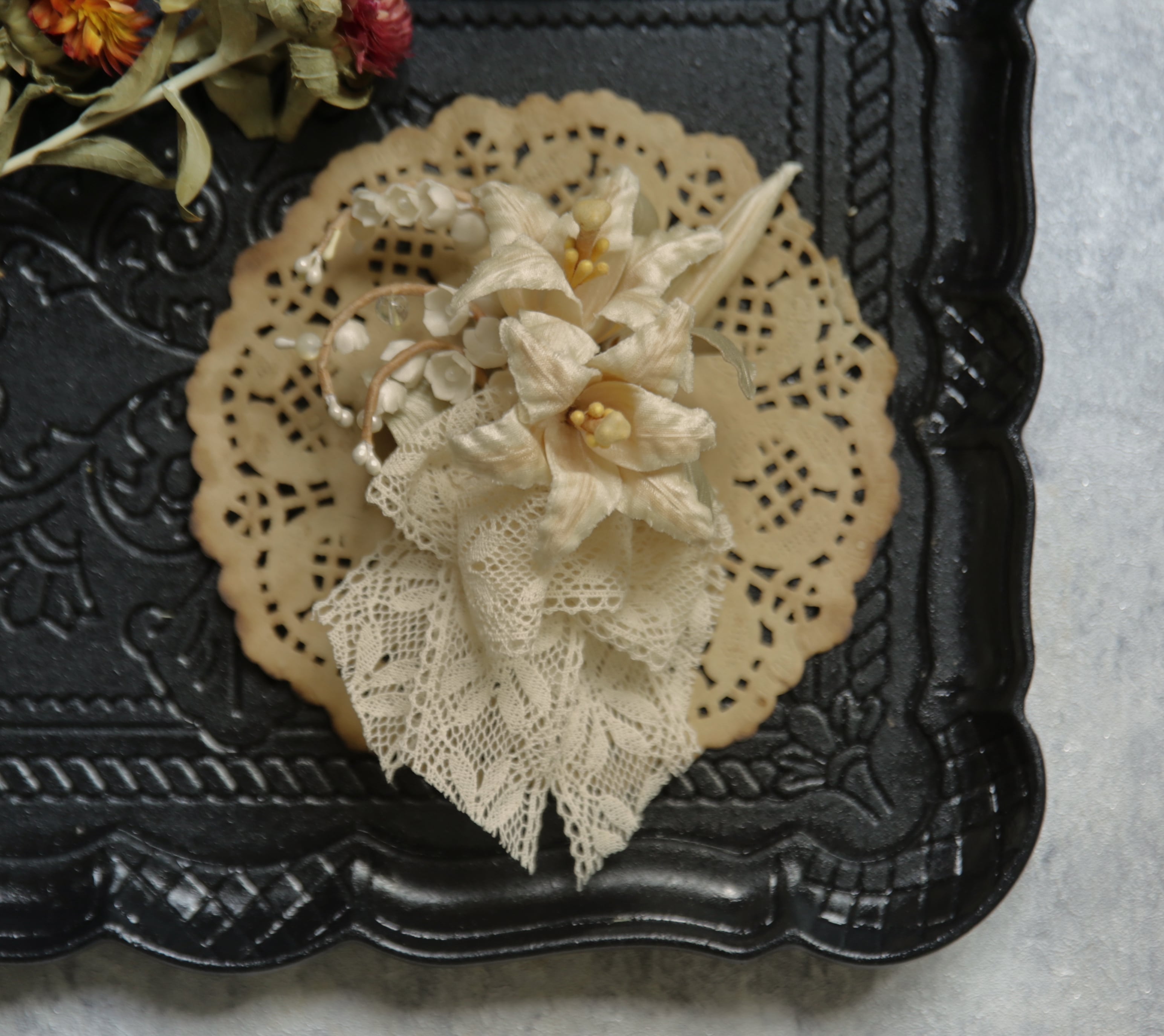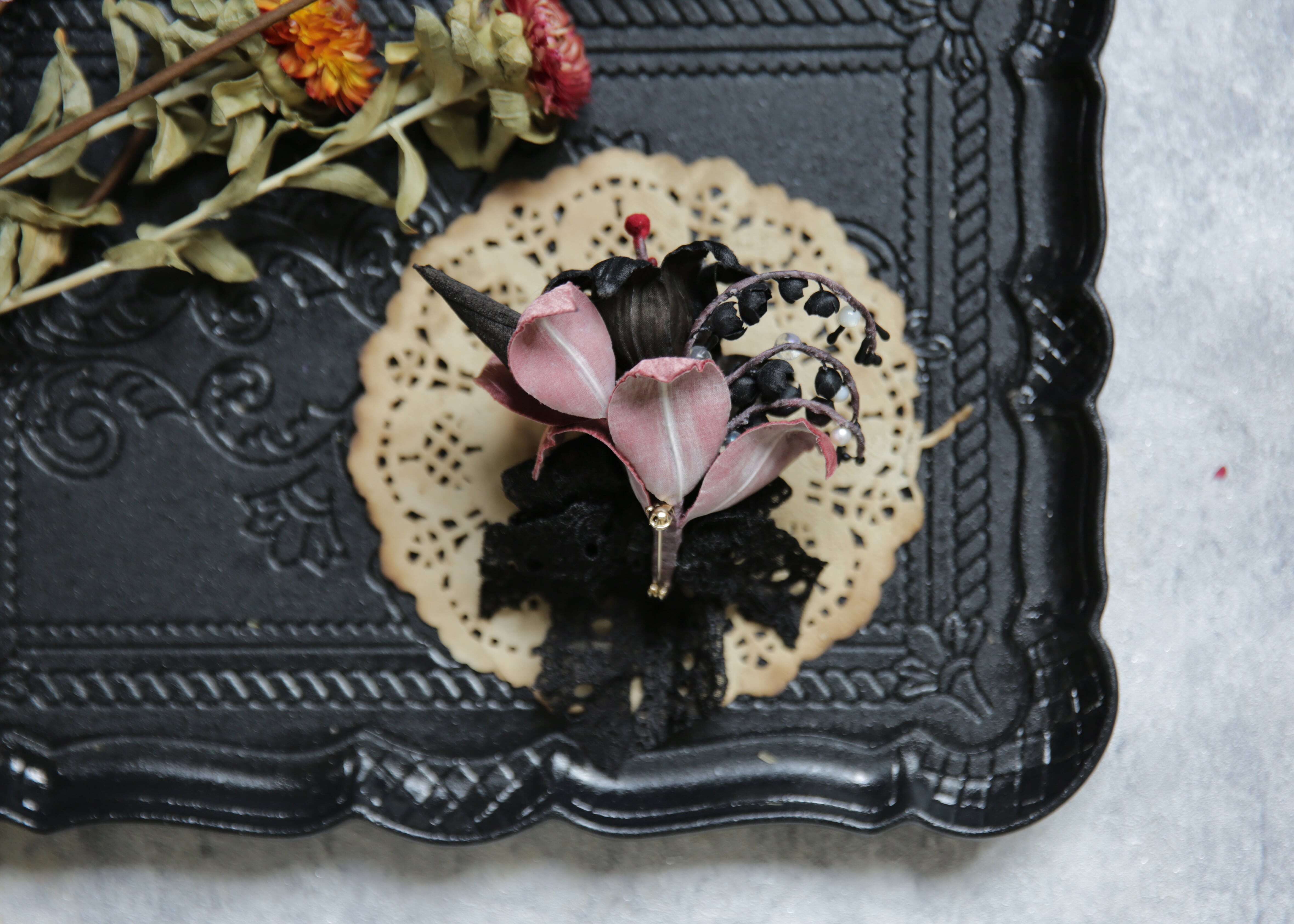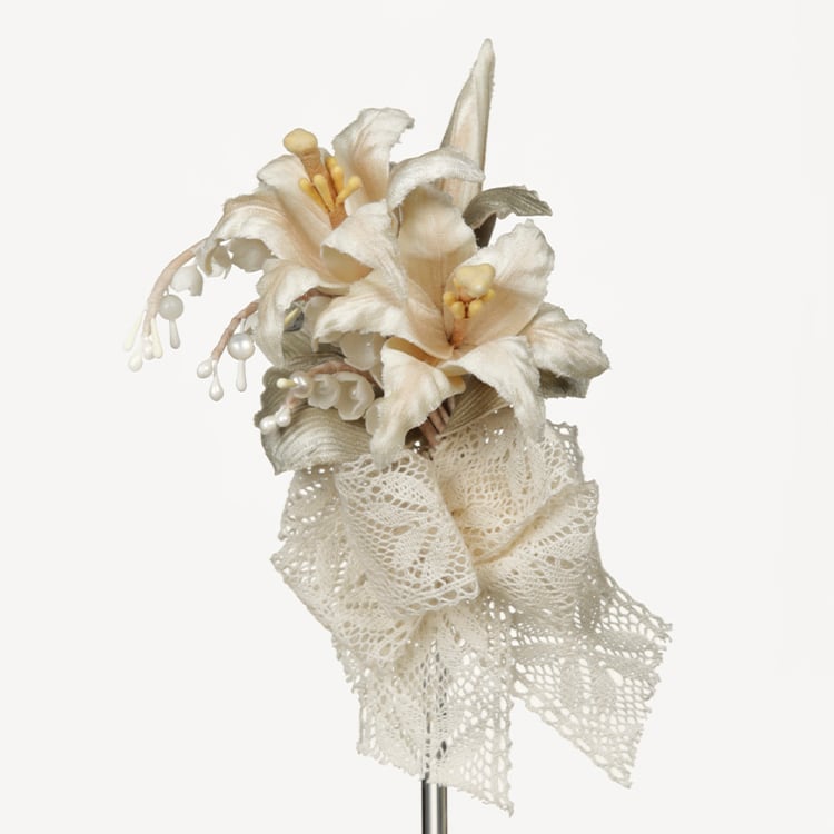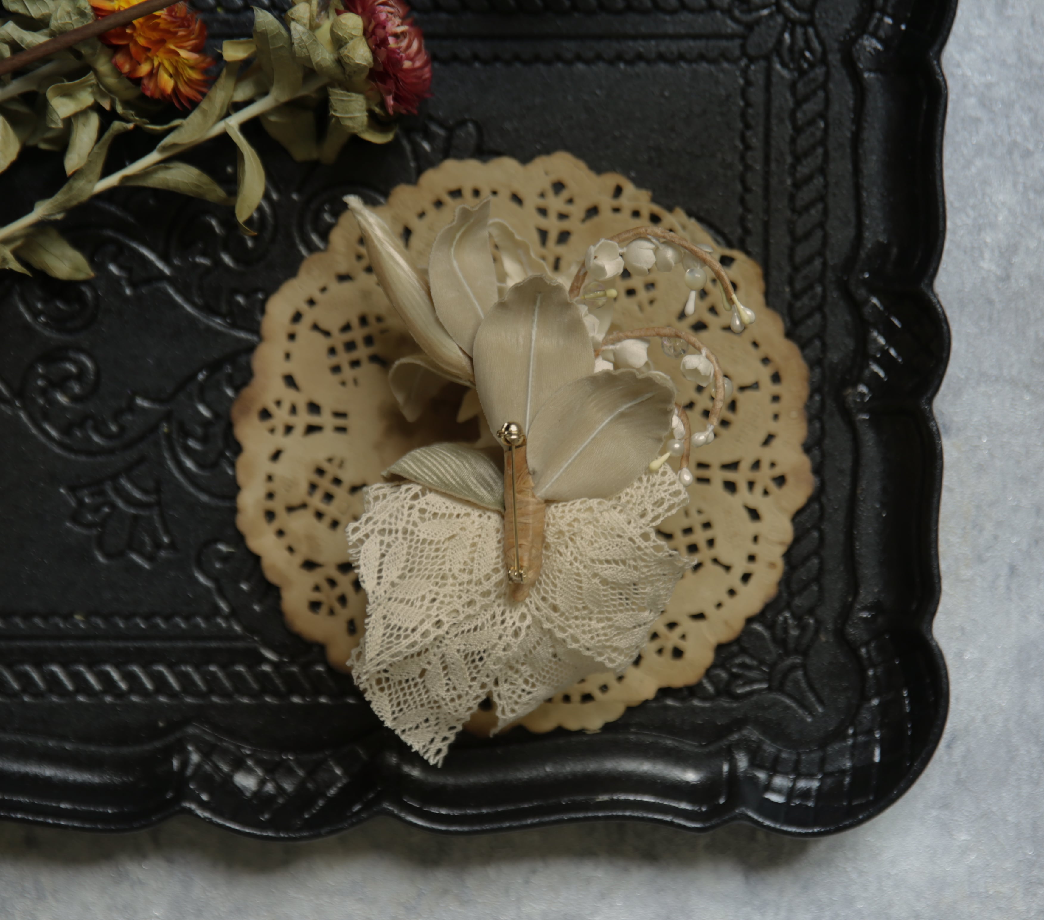 前作から継承された優雅さと高級感を醸し出す百合と鈴蘭のアートフラワーがブローチになりました!今回は安全ピンのブローチタイプとクリップタイプの二種類からお選び頂けます。