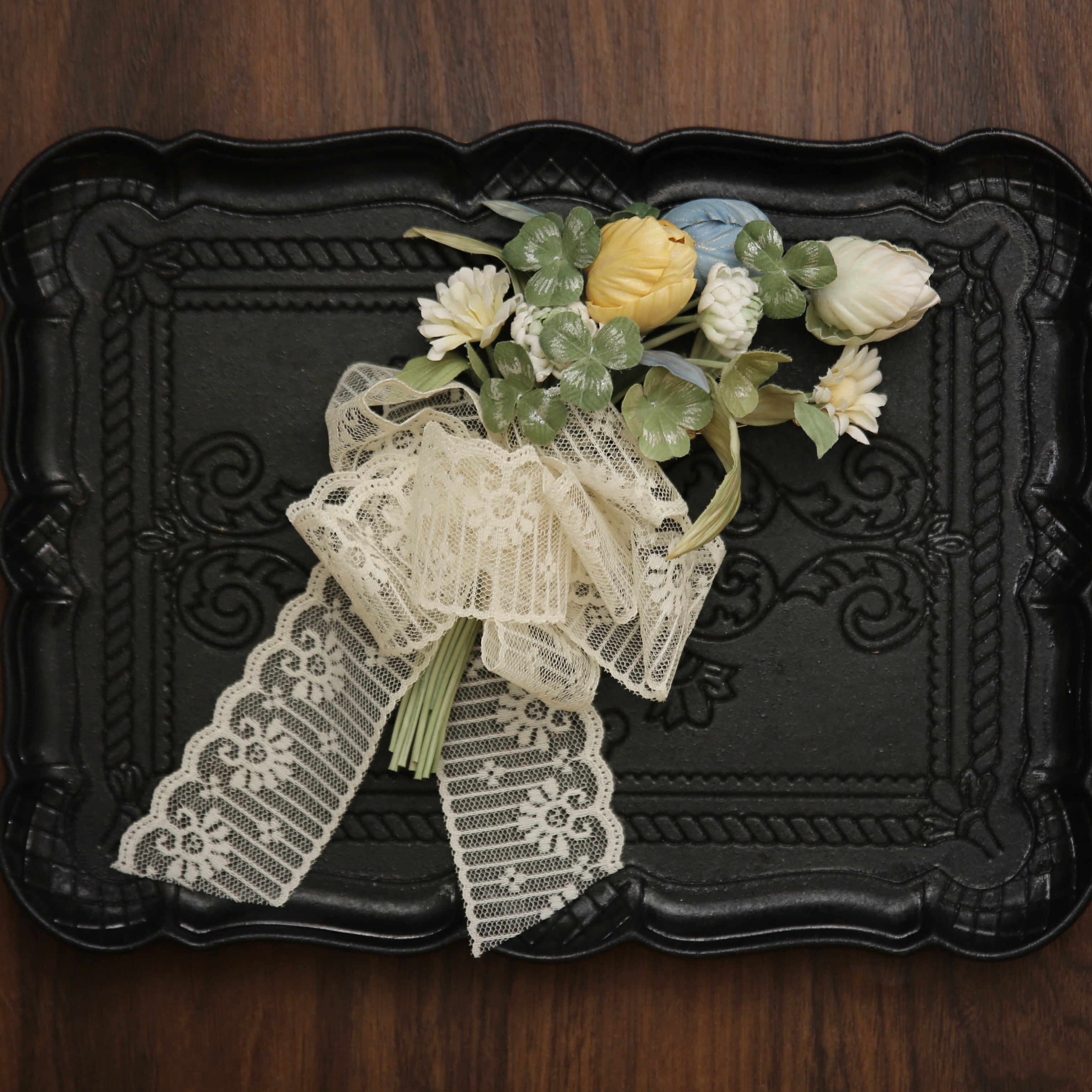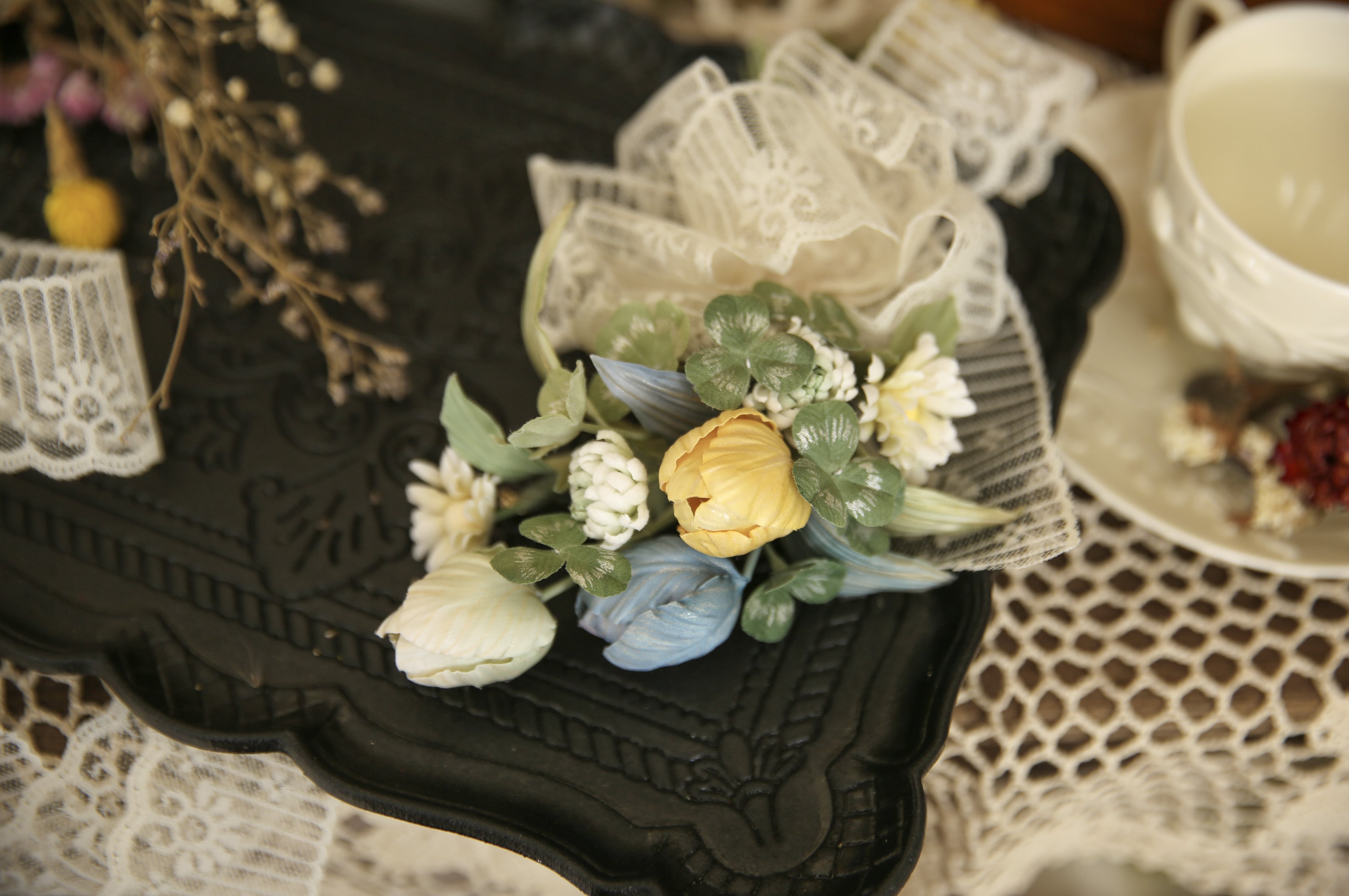 主役のチューリップと花言葉は「約束」のシロツメクサ、そしてデイジーを、透け感のあるチュールレースで花束にした大きなブローチです。