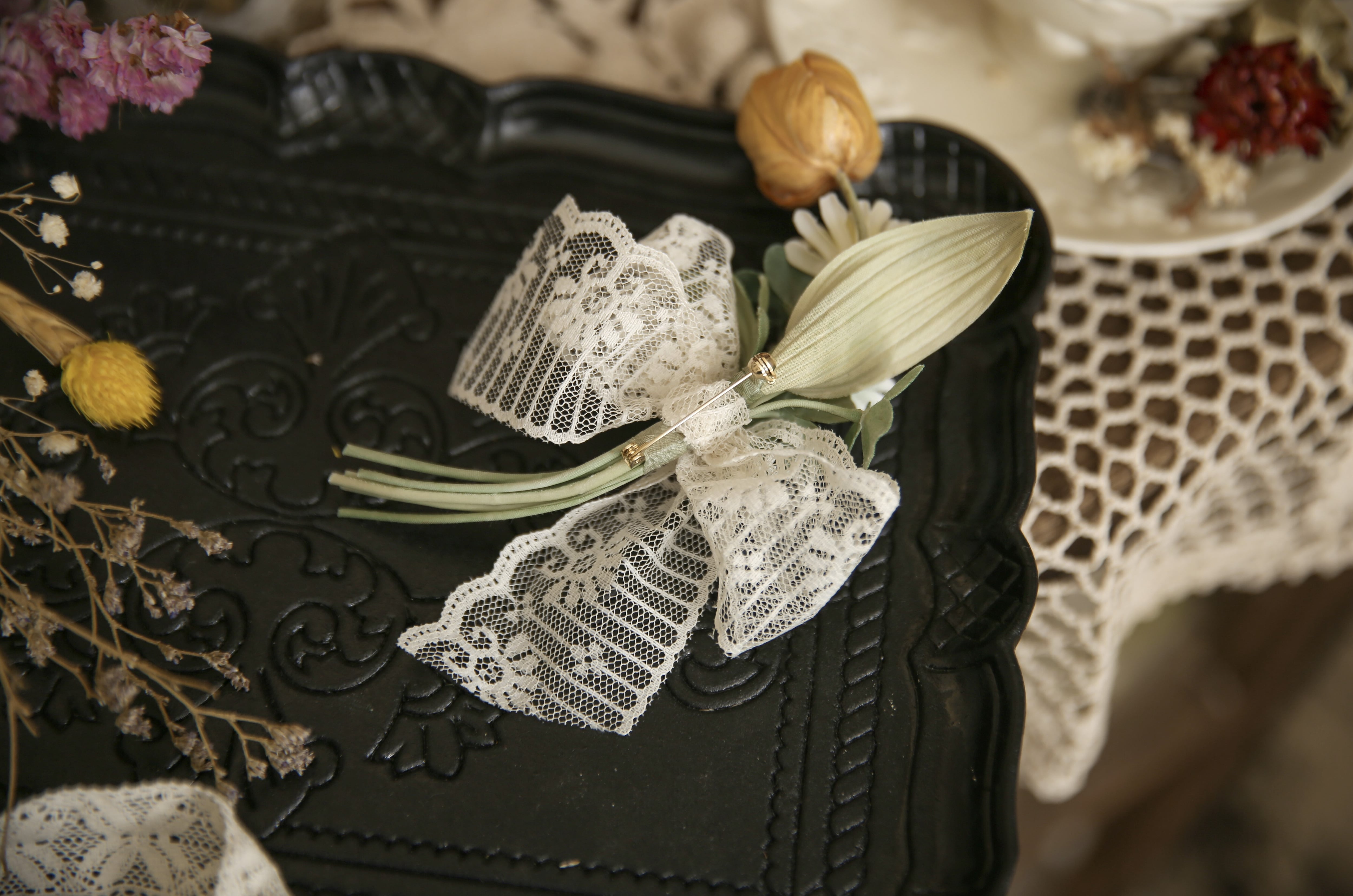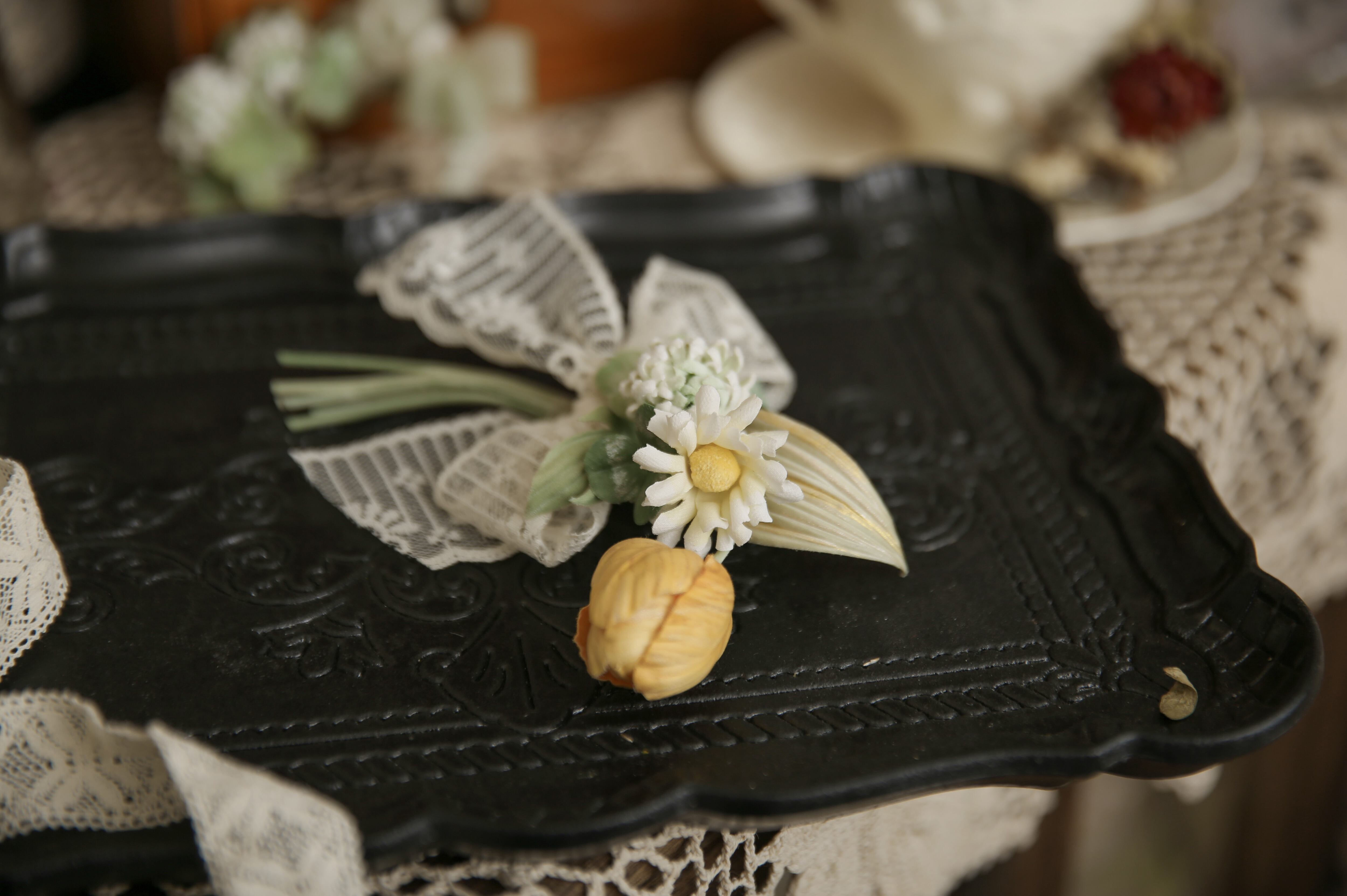 主役のチューリップと花言葉は「約束」のシロツメクサ、そしてデイジーを透け感のあるチュールレースで花束にした安全ピンタイプのブローチです。