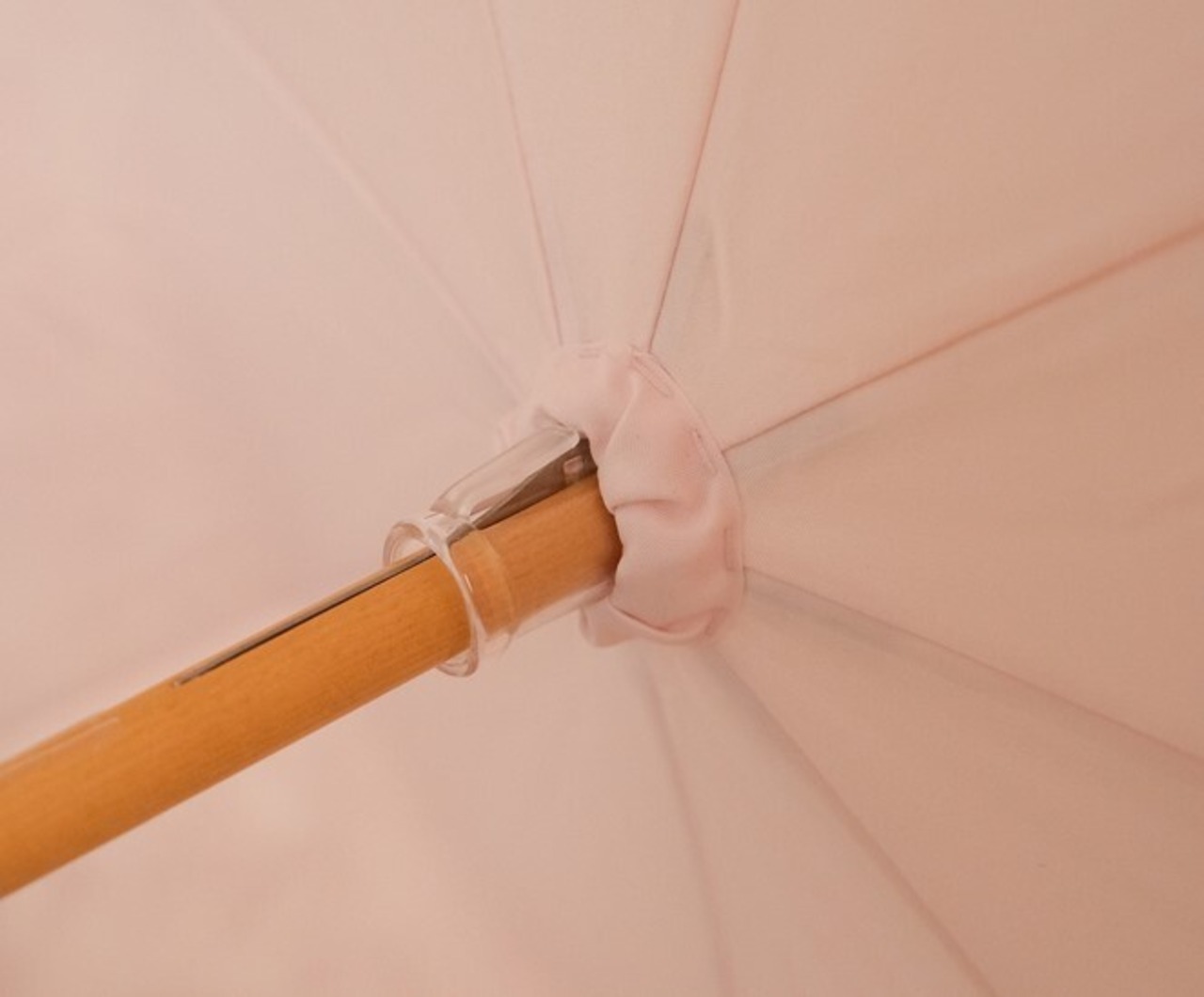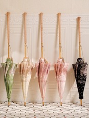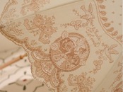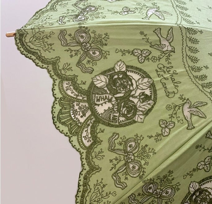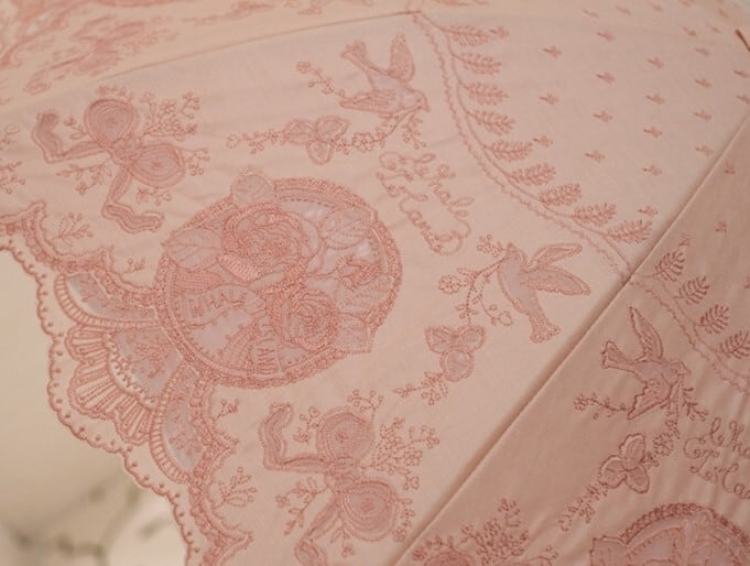 淡い色の生地に贅沢に施された刺繍がエレガントなヴィンテージ風日傘です。