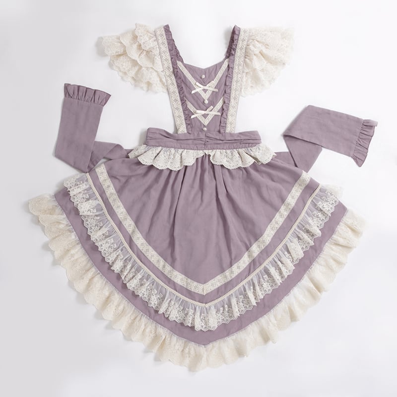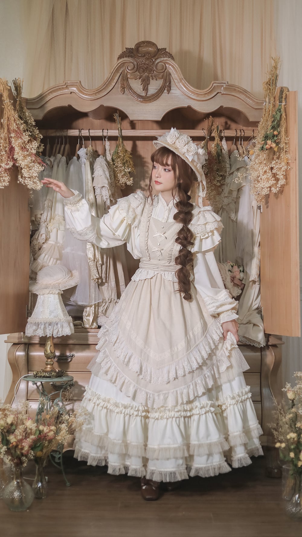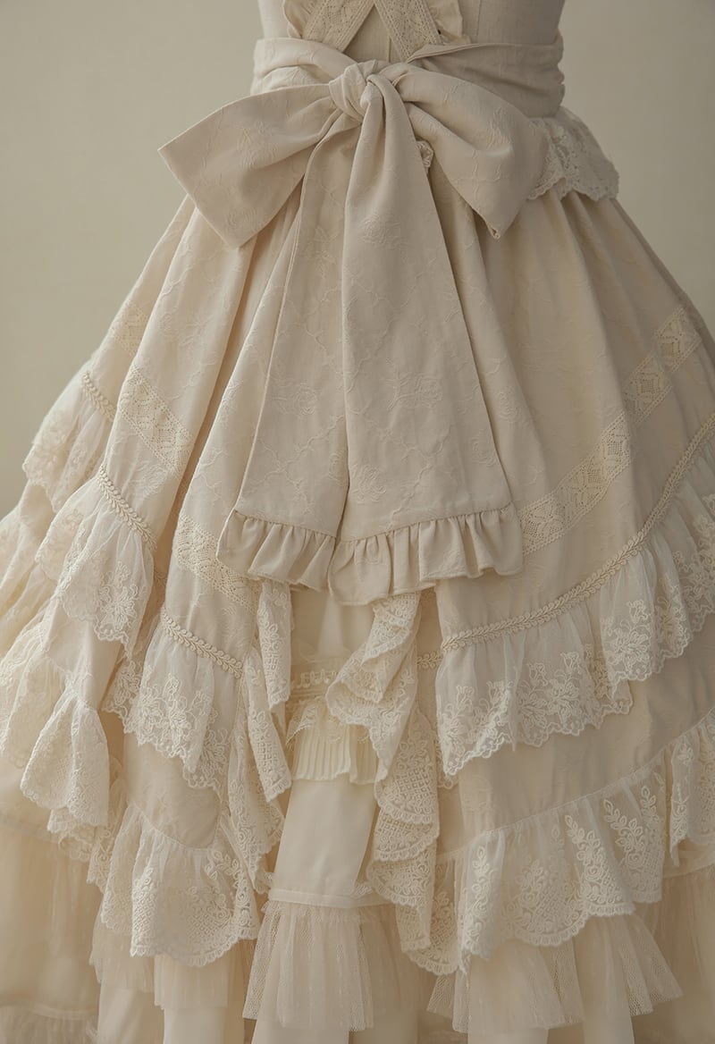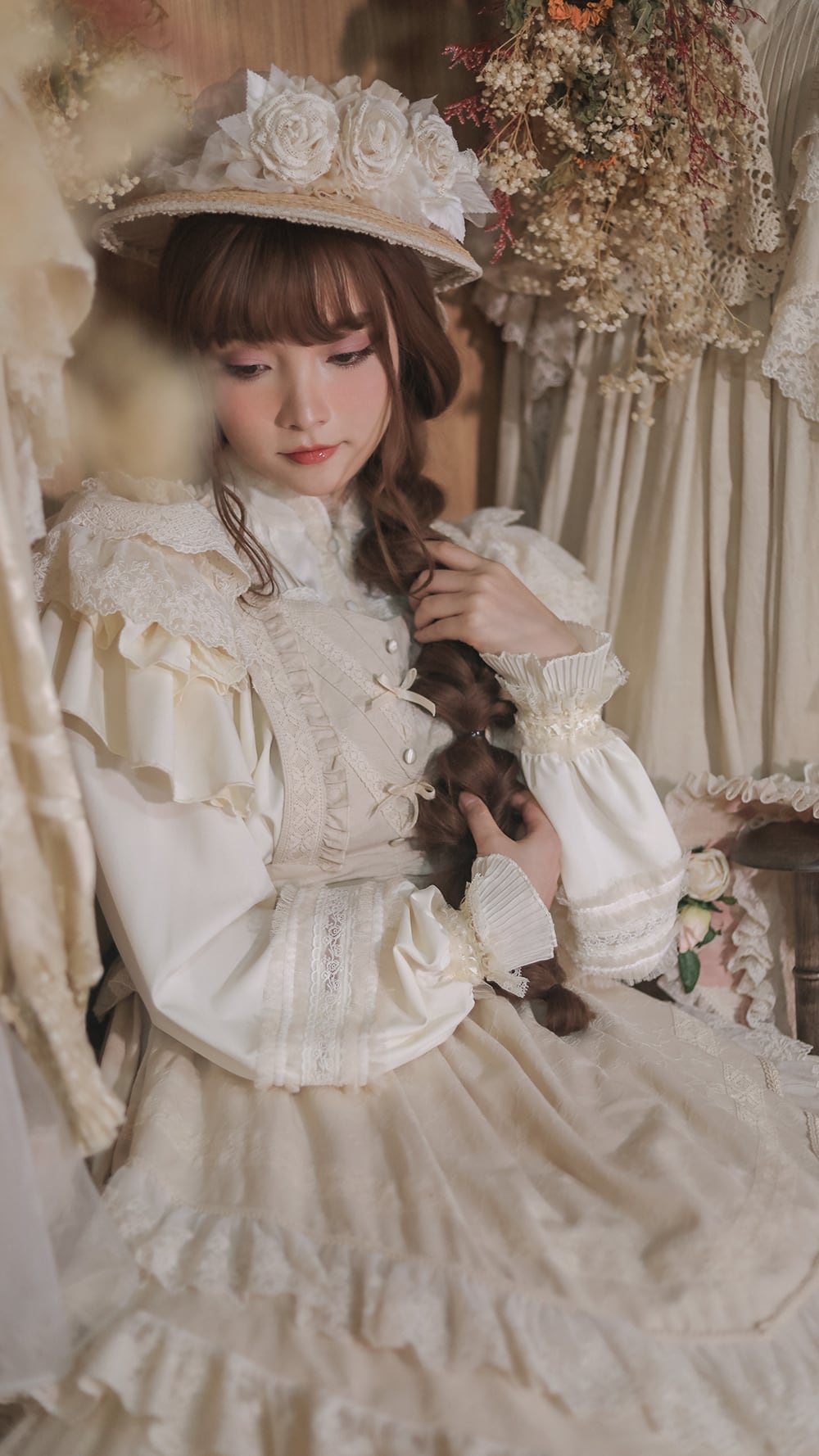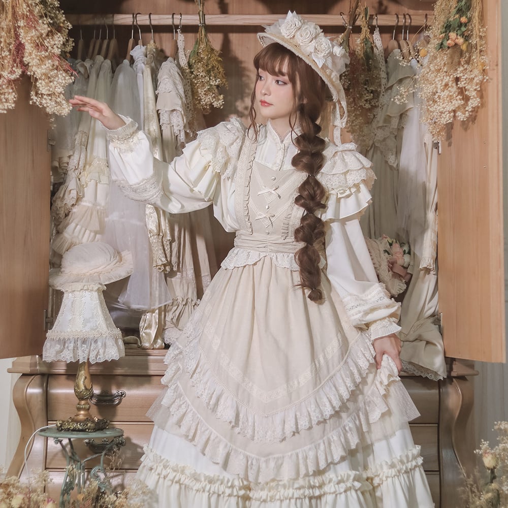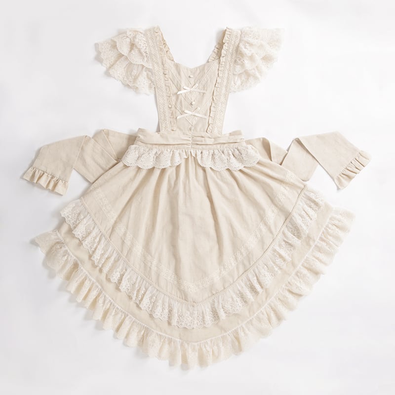 綿レースのフリルでクラシカルでありながら可愛らしく、V字のシルエットが印象的なアイテム。