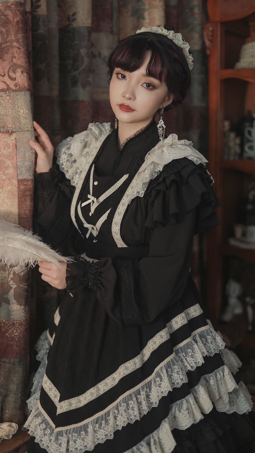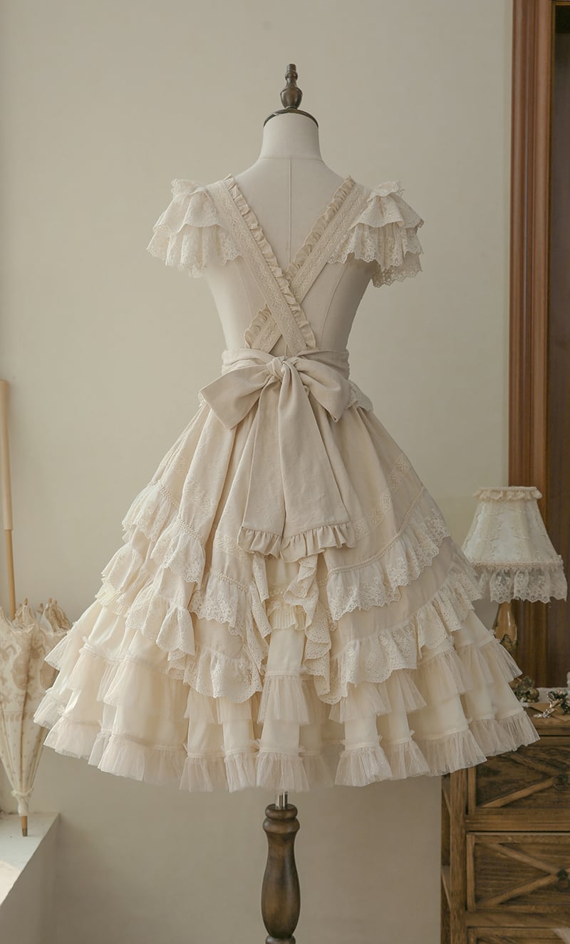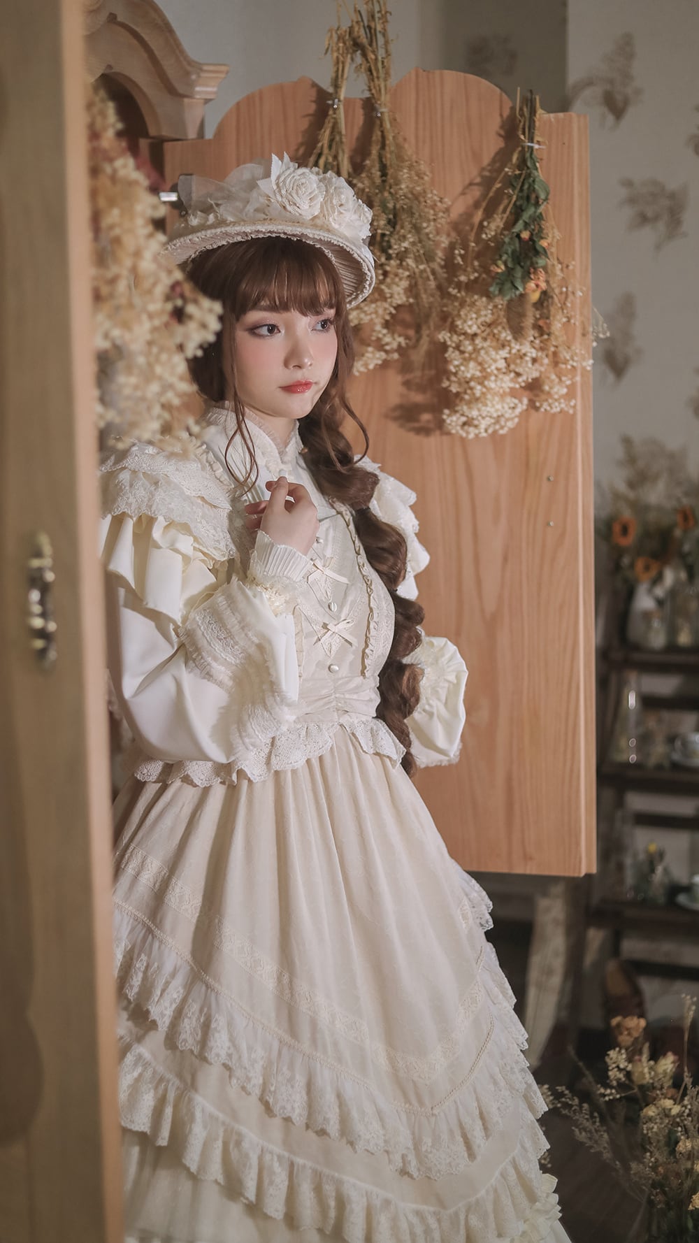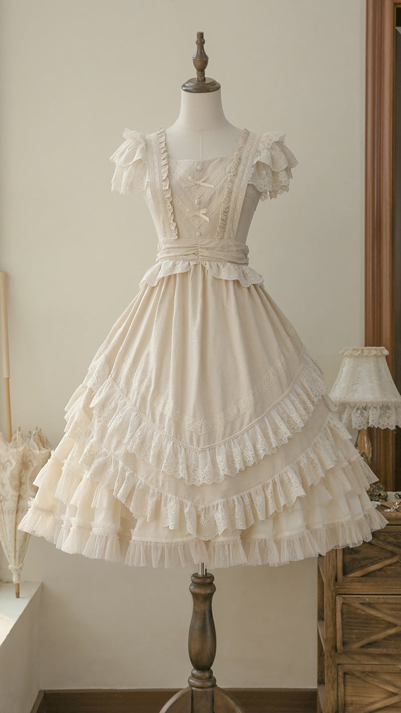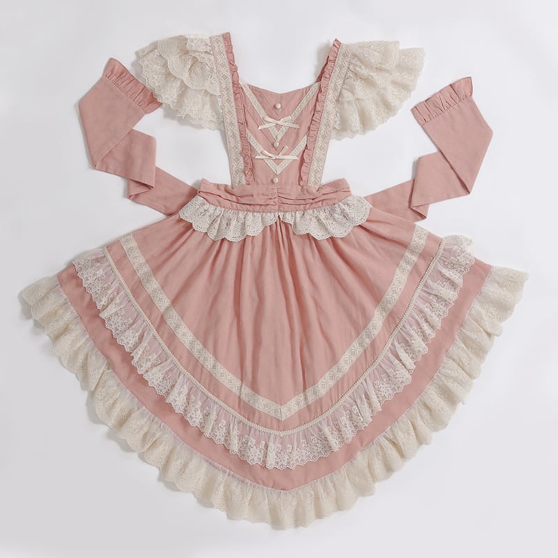 綿レースのフリルでクラシカルでありながら可愛らしく、V字のシルエットが印象的なアイテム。