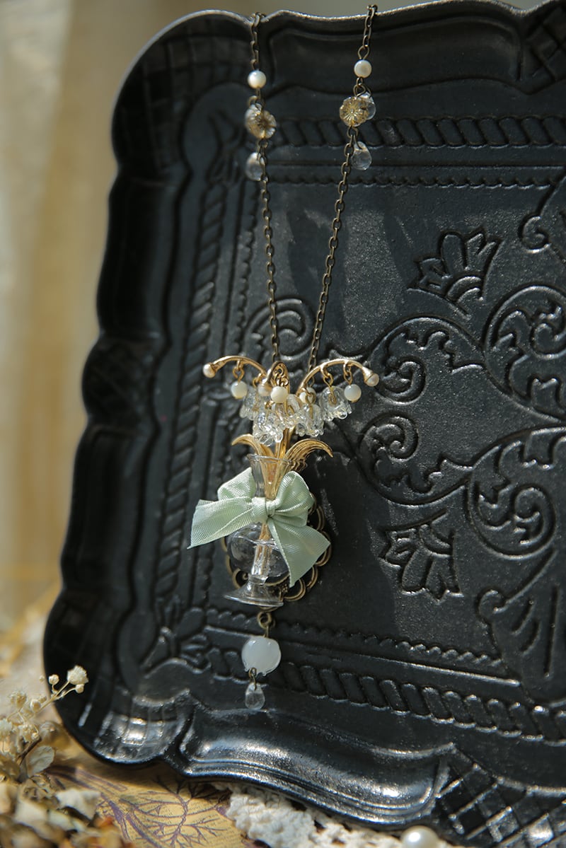 透明のガラス花瓶に一輪挿しのすずらんが輝くネックレス。