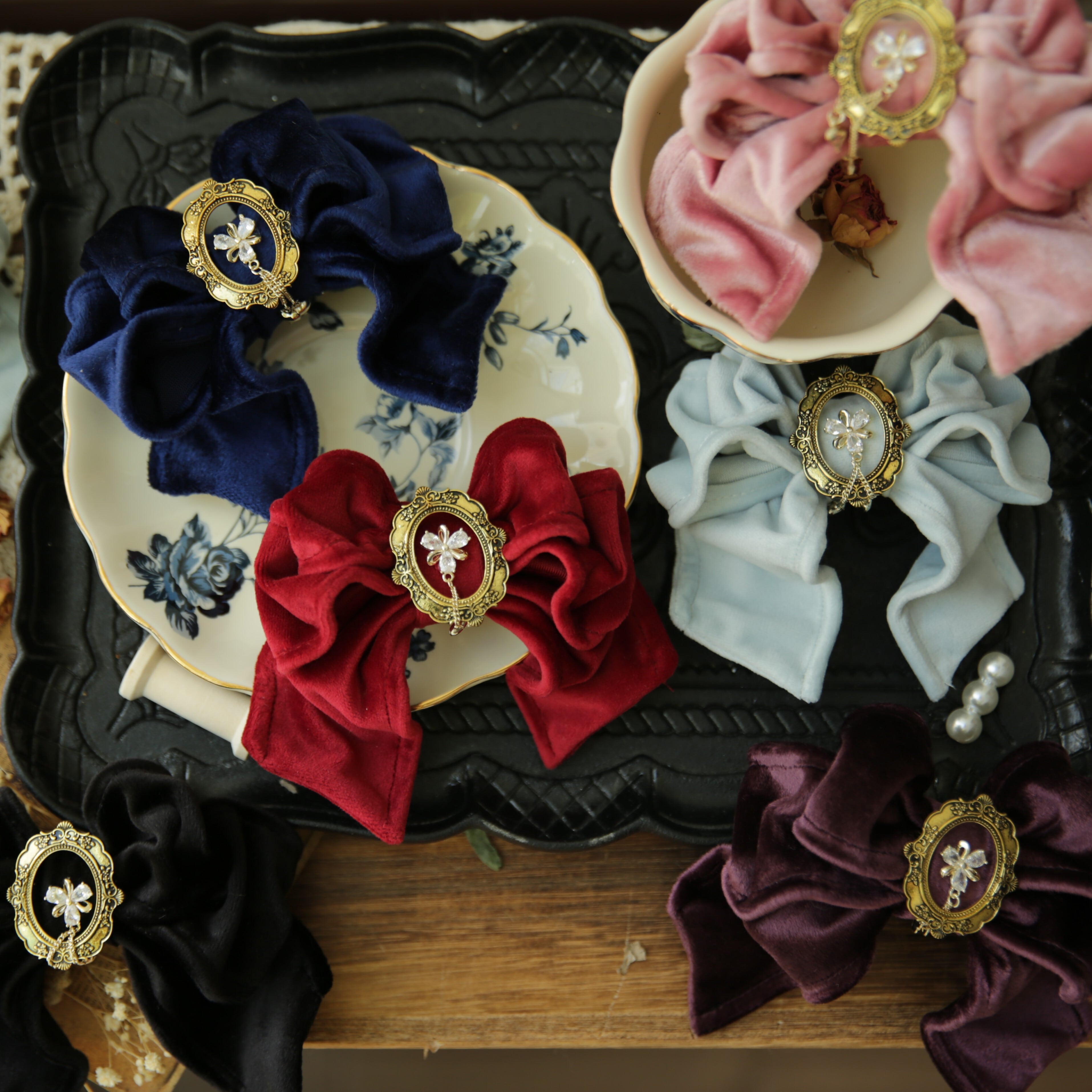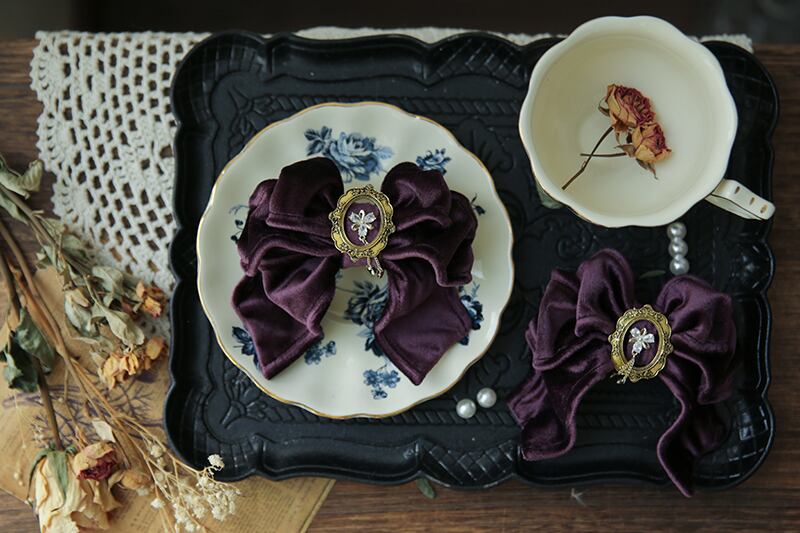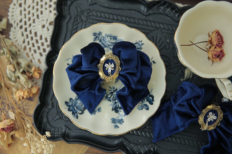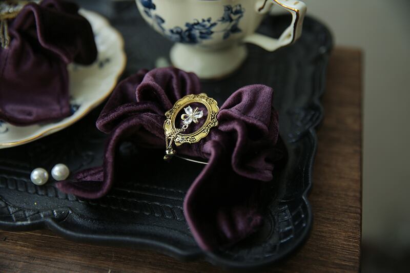 高級感のあるベルベット素材で、フレームの中心に輝くスワロスキークリスタルが上品なデザインです。