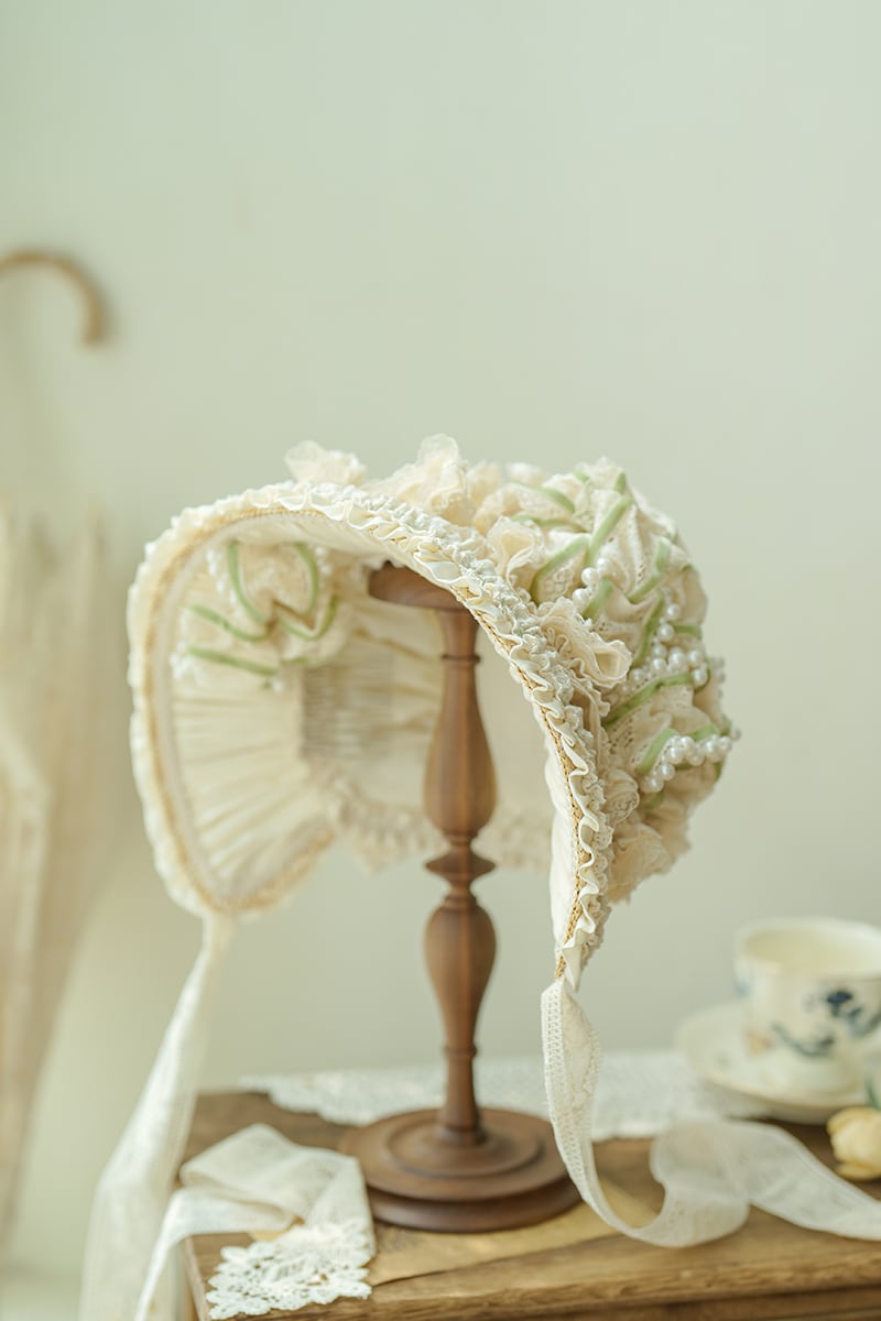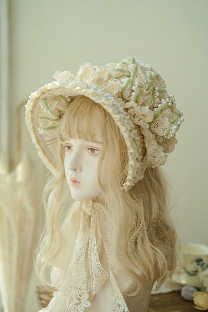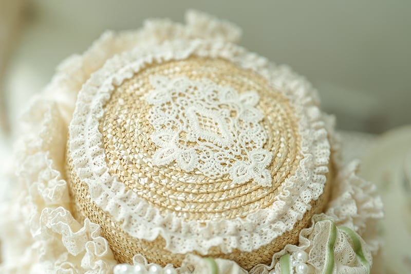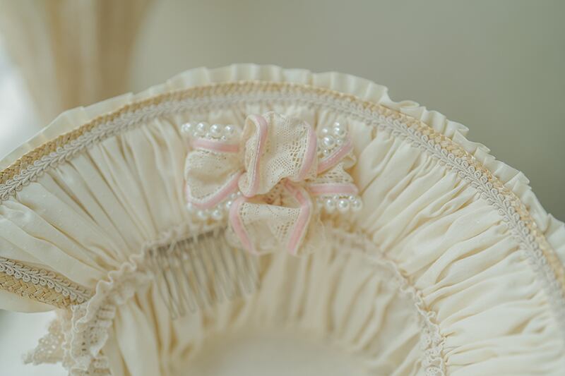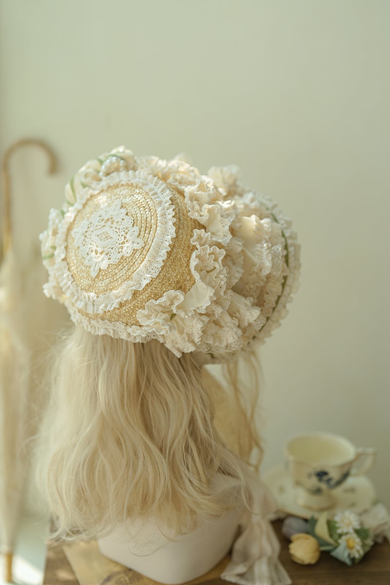 麦わらの上にふんわりとしたレースのリボンとパール、そしてボリューミーなフリルが上品でかわいいボンネット。