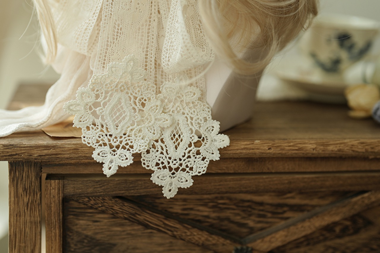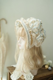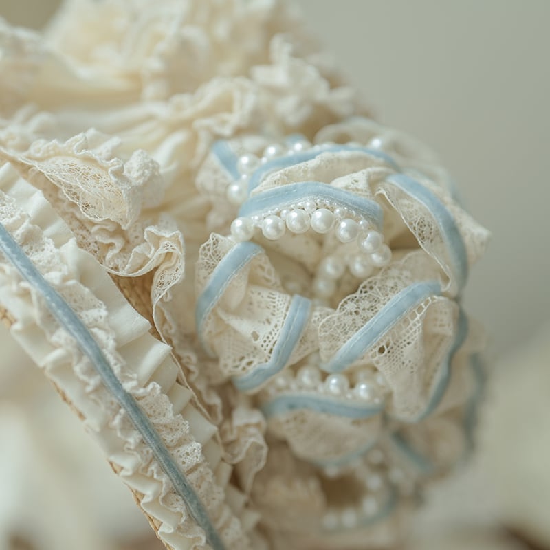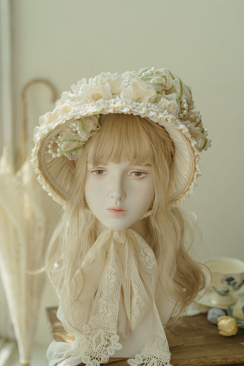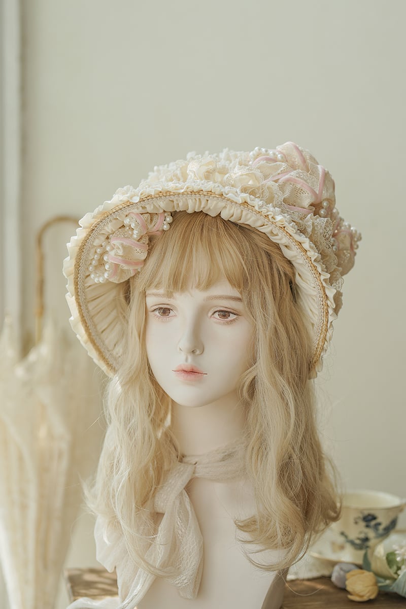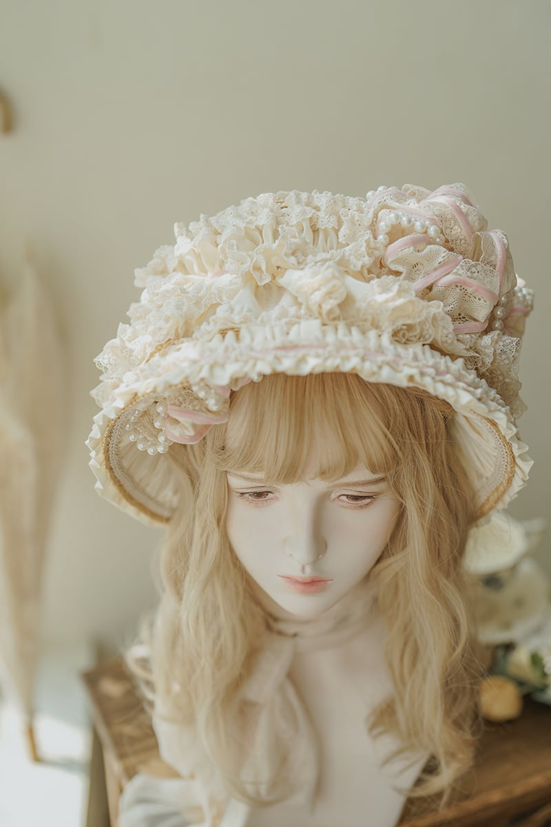 麦わらの上にふんわりとしたレースのリボンとパール、そしてボリューミーなフリルが上品でかわいいボンネット。