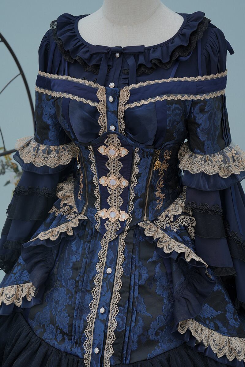 光沢のある繊細なジャカード生地にゴールドのレースがあしらわれた絢爛華麗なベル・エピヌ シリーズのコルセット。