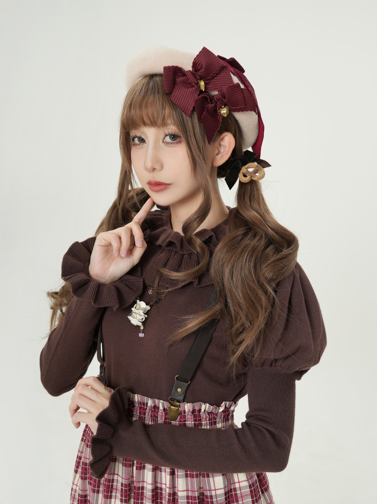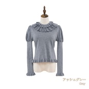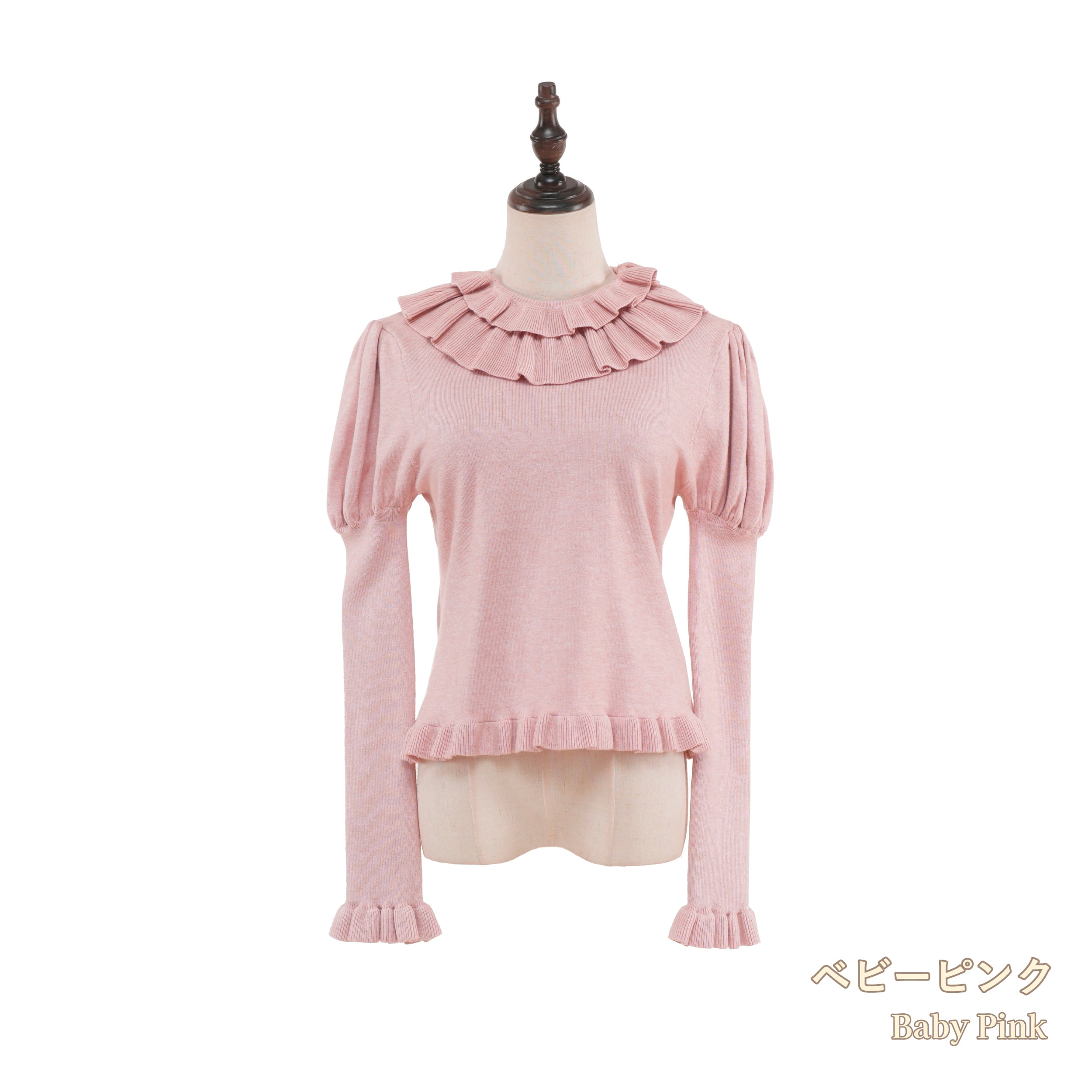 たっぷりとフリルをあしらったタートルネックや袖、裾周りはそのままに、肩回りを華やかに見せるパフスリーブをプラス。