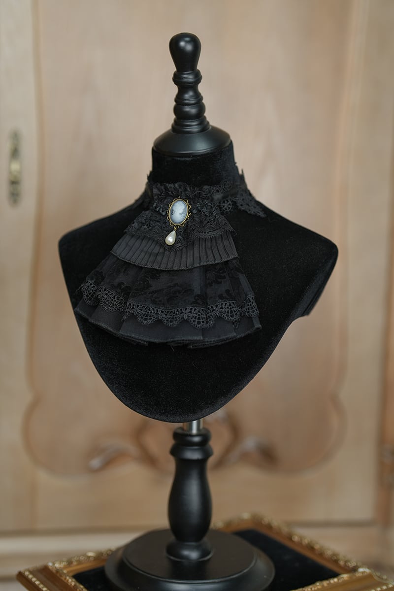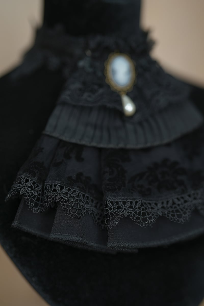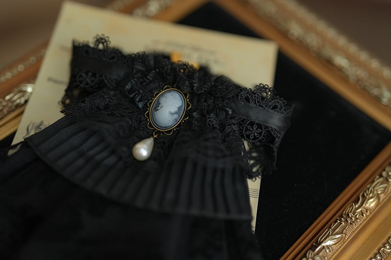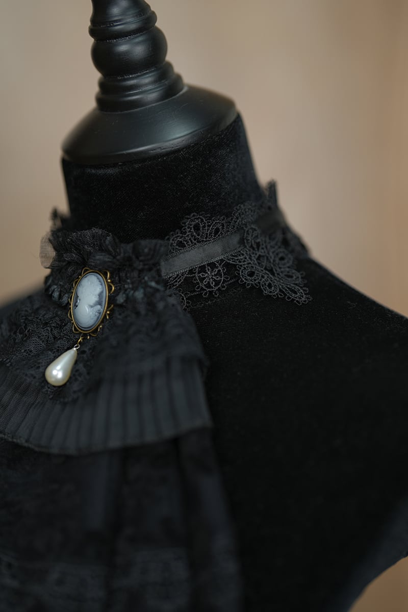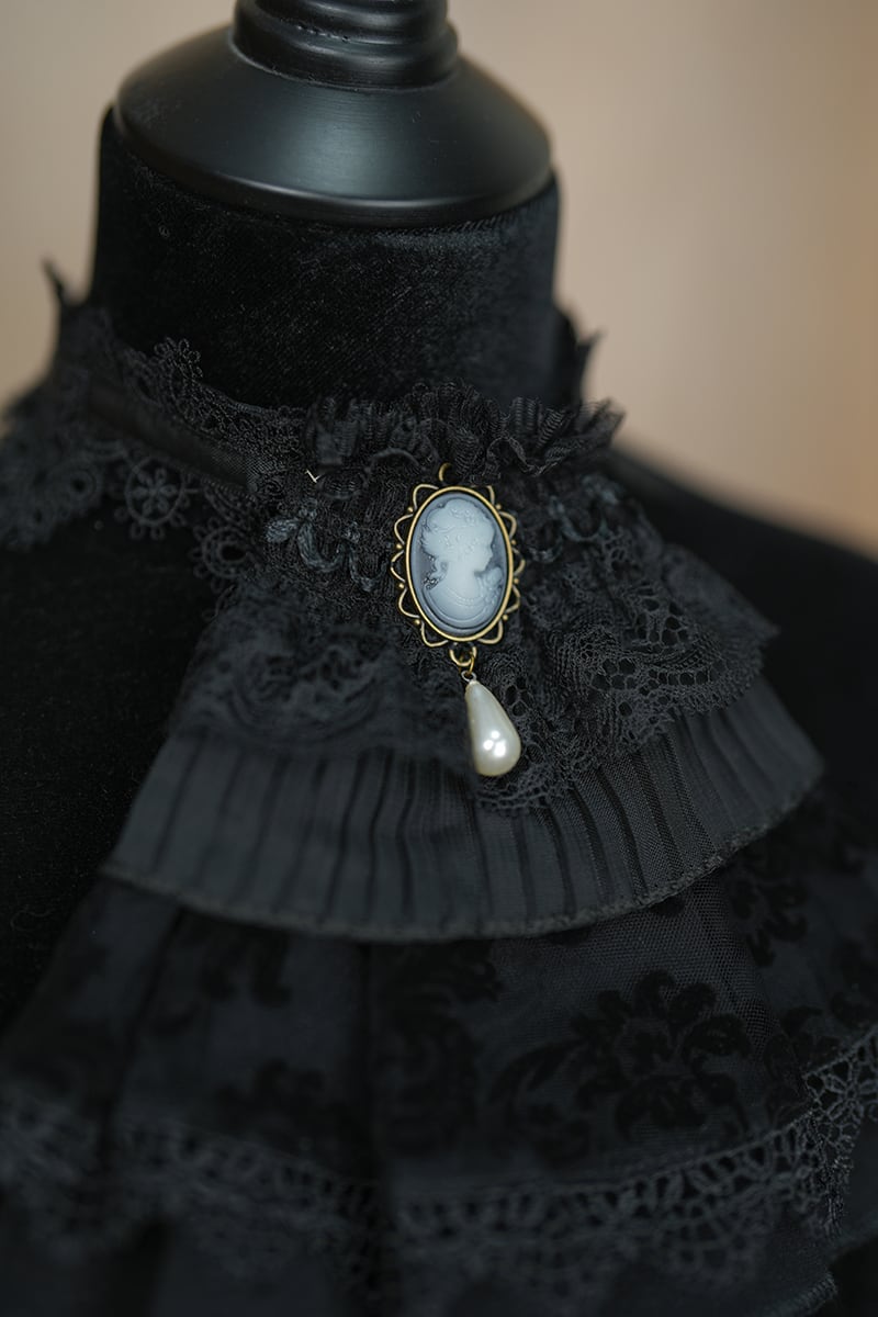 重なったレースとさりげなく佇むカメオ、そして艶やかなパールが、胸元をエレガントに演出します。