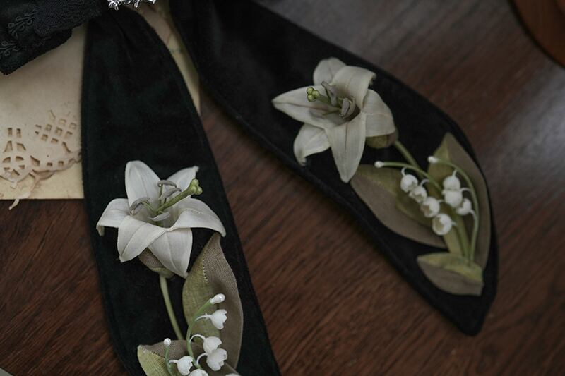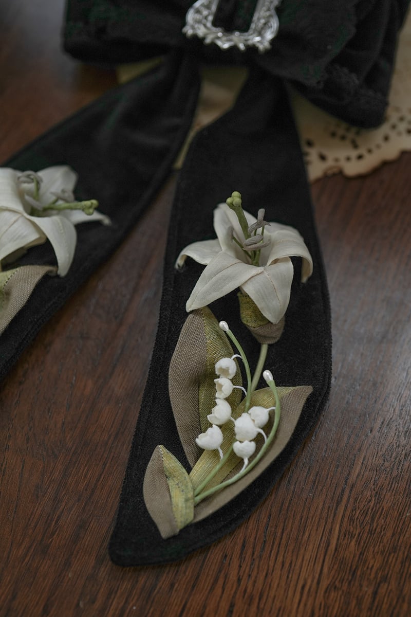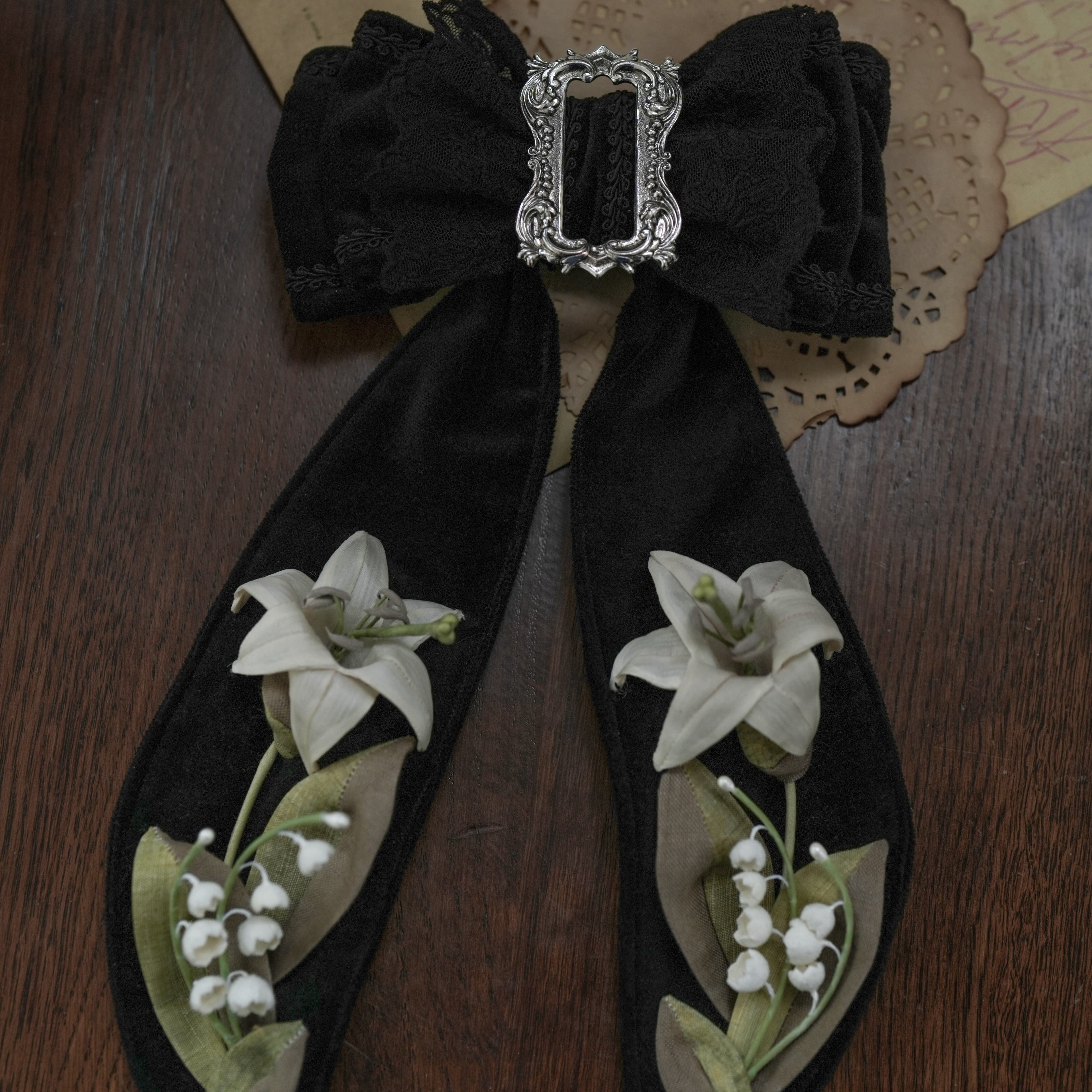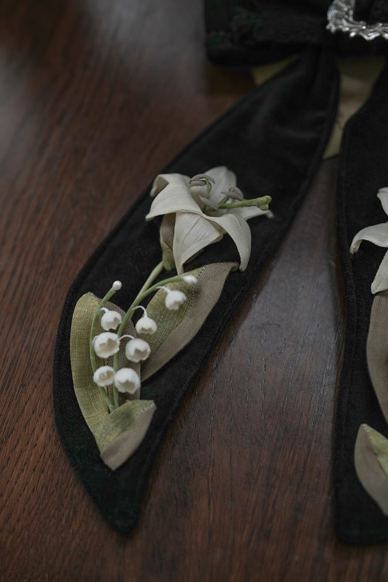 百合や鈴蘭が目をひく大ぶりなリボンタイ。