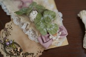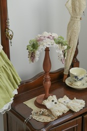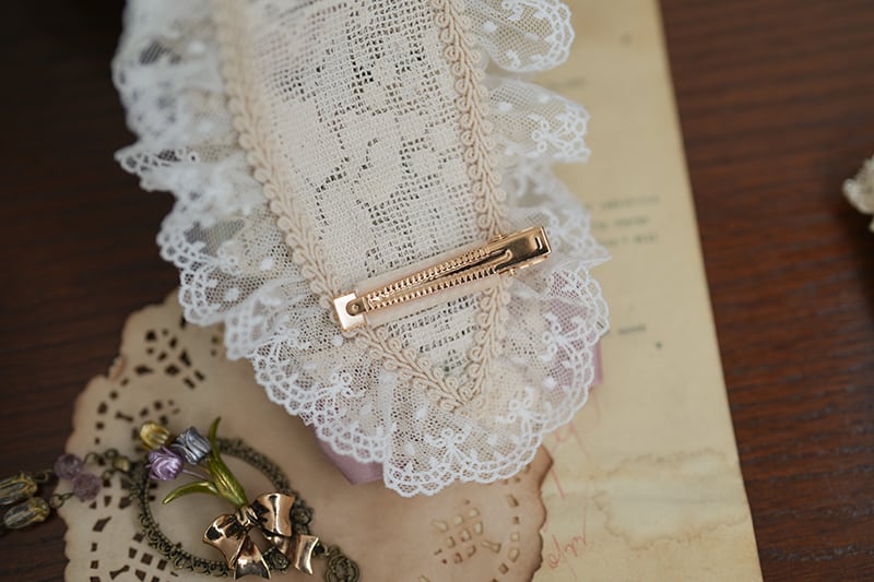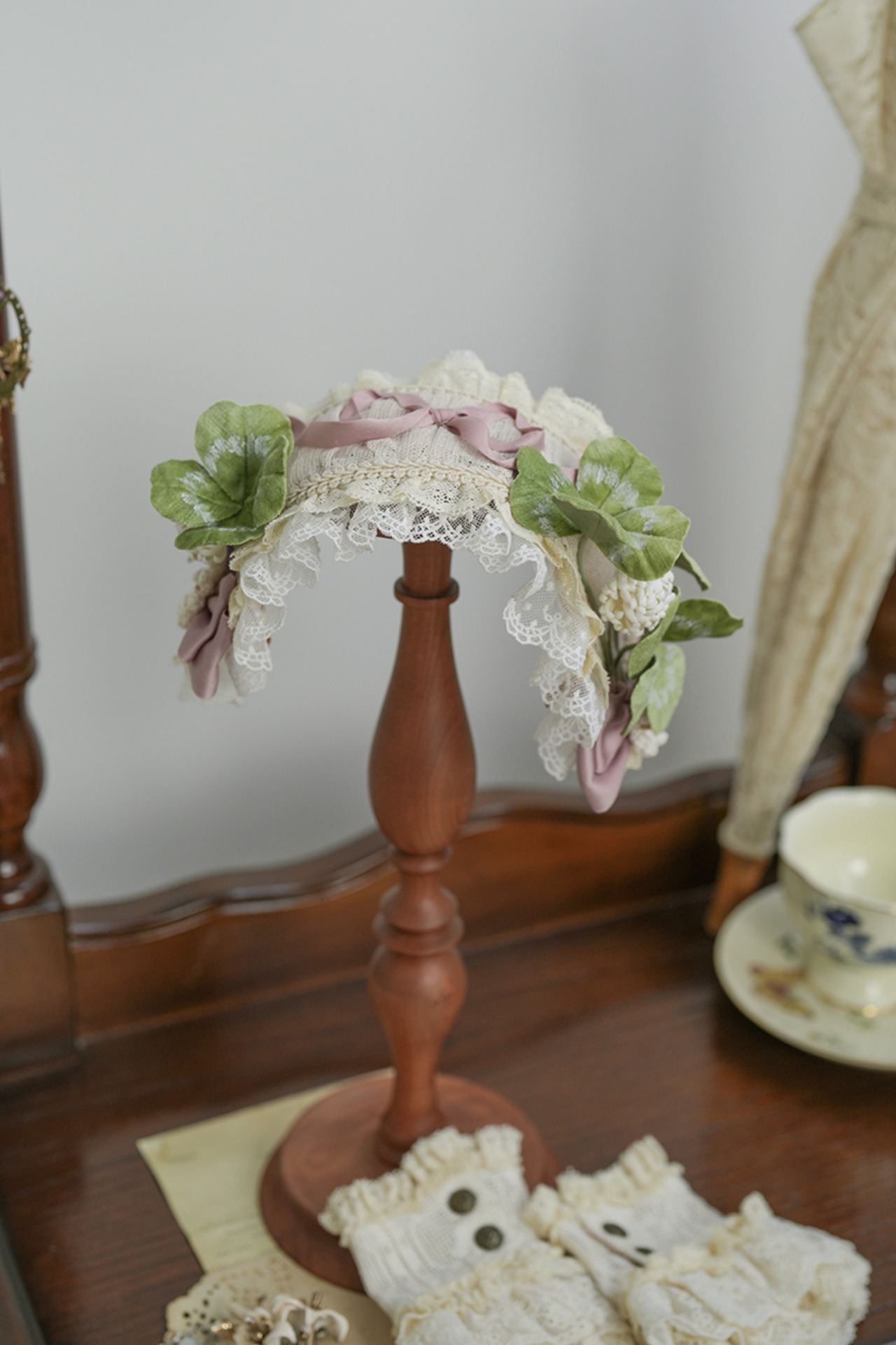 幅広のヘッドドレスはレースが周りにたっぷりついて、頭を華やかに飾ります。