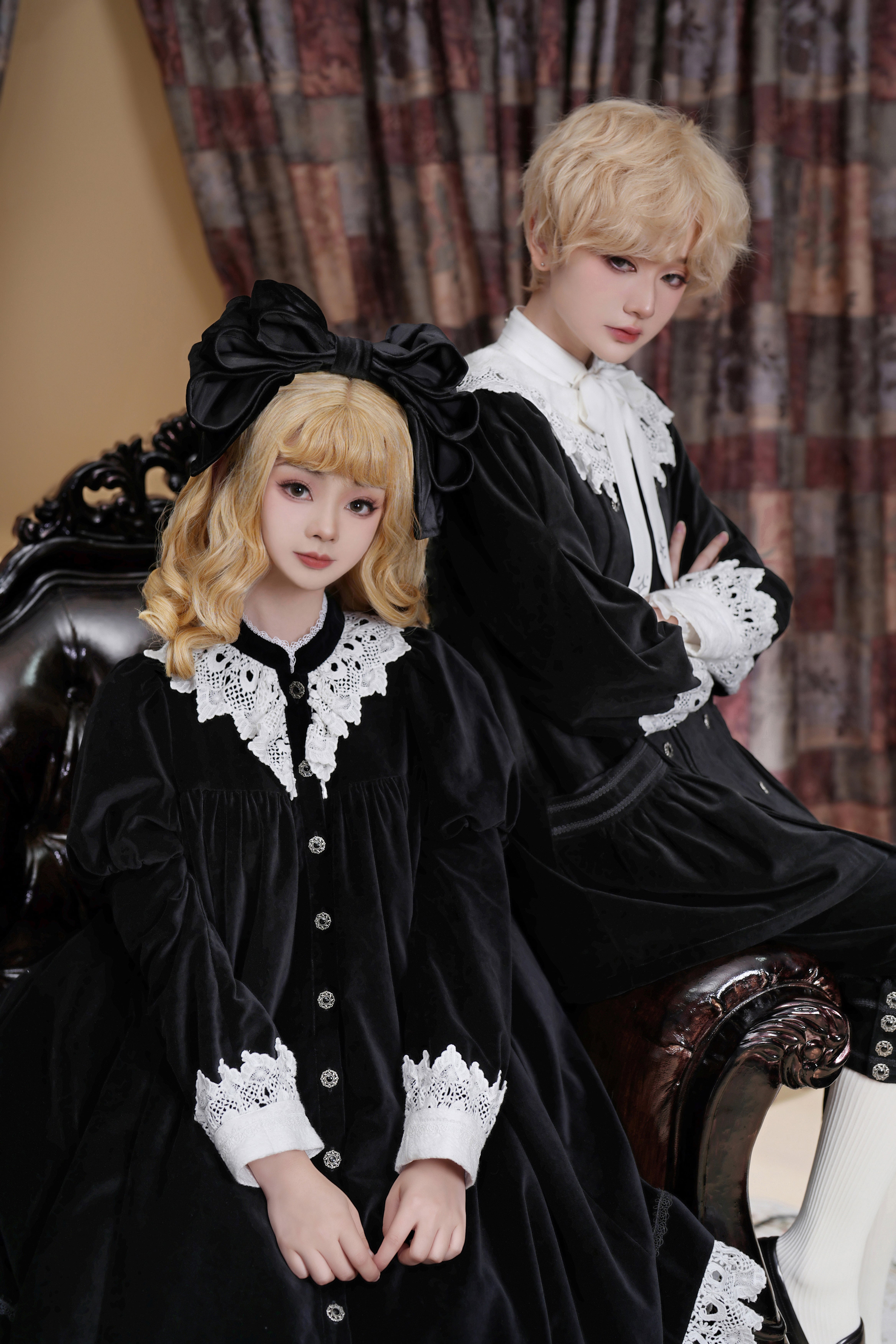 ベロアの光沢感やアンティークボタンなど、シンプルながら重厚感のある素材のコンビネーションが、少年の面影の中に貴族としての厳かな雰囲気を醸し出します。