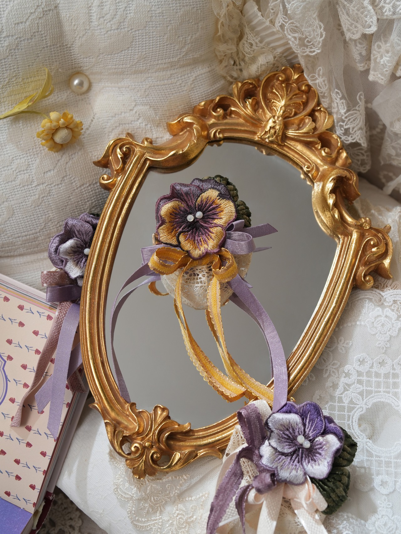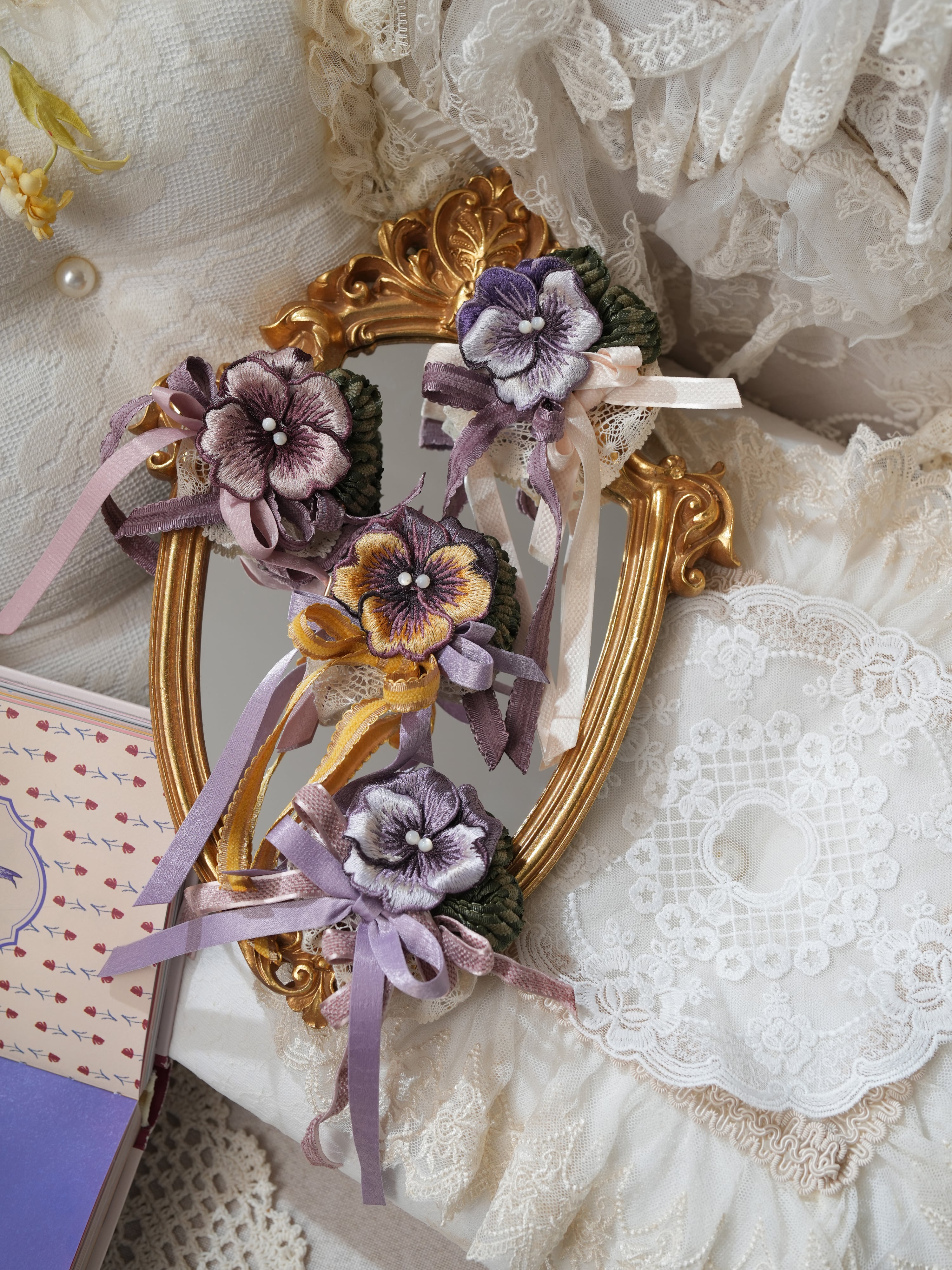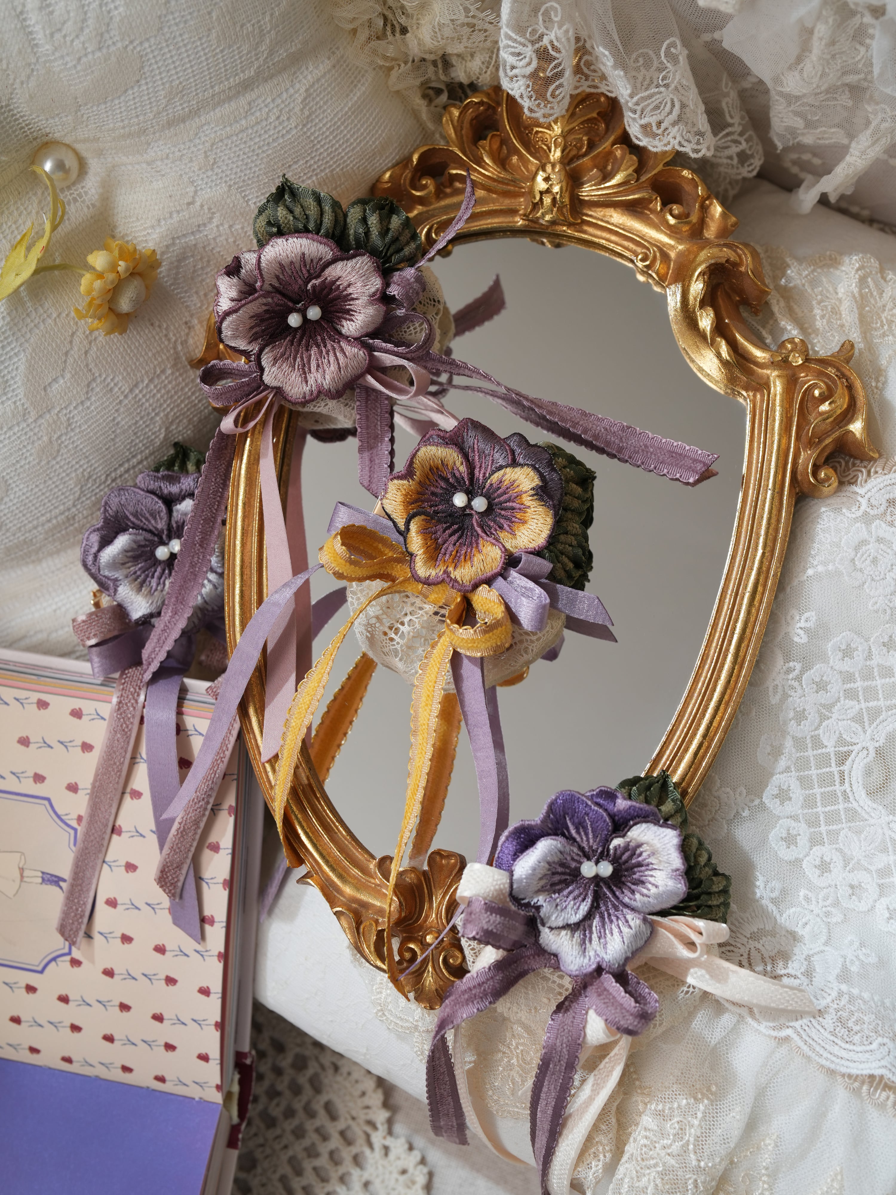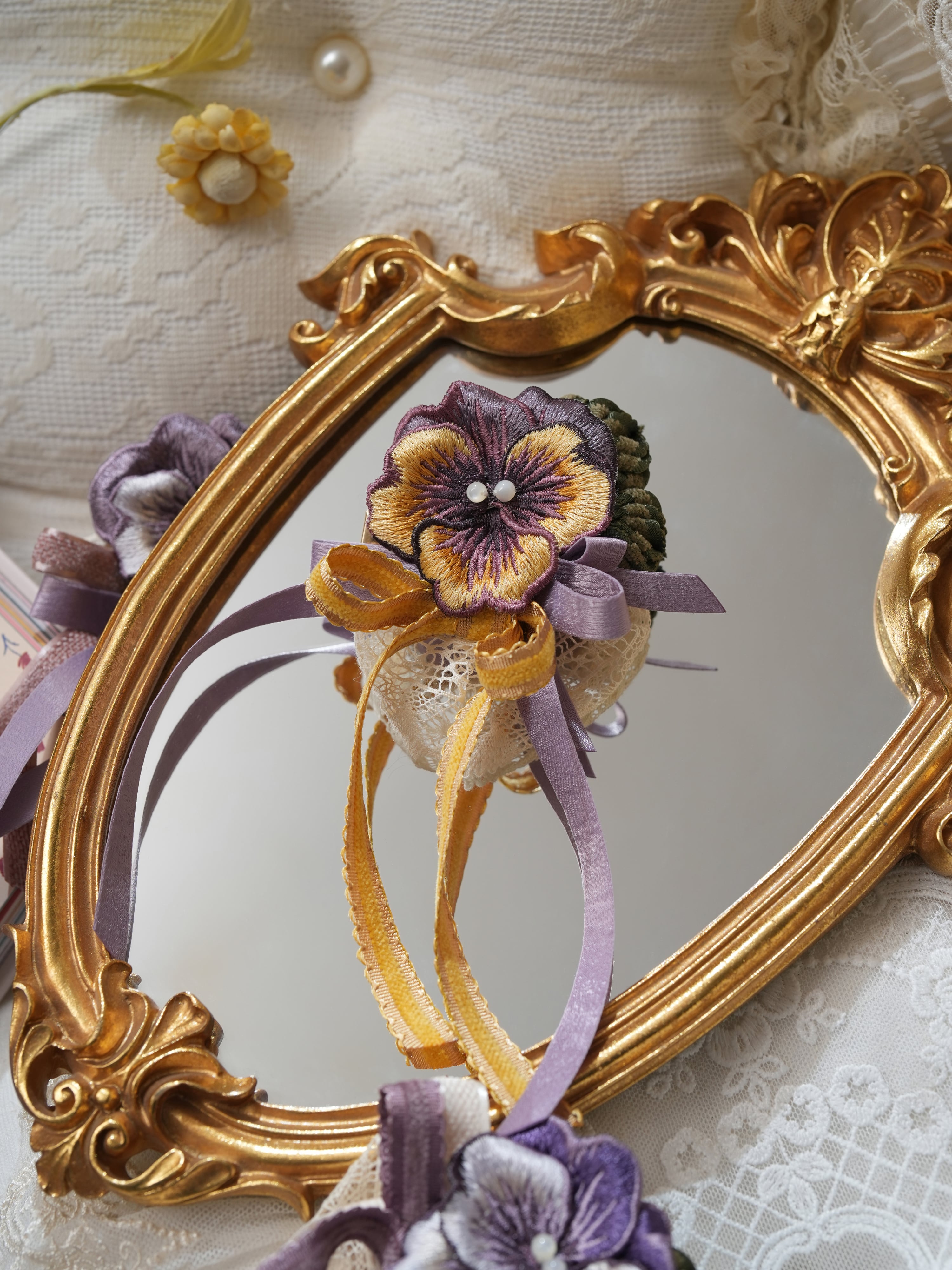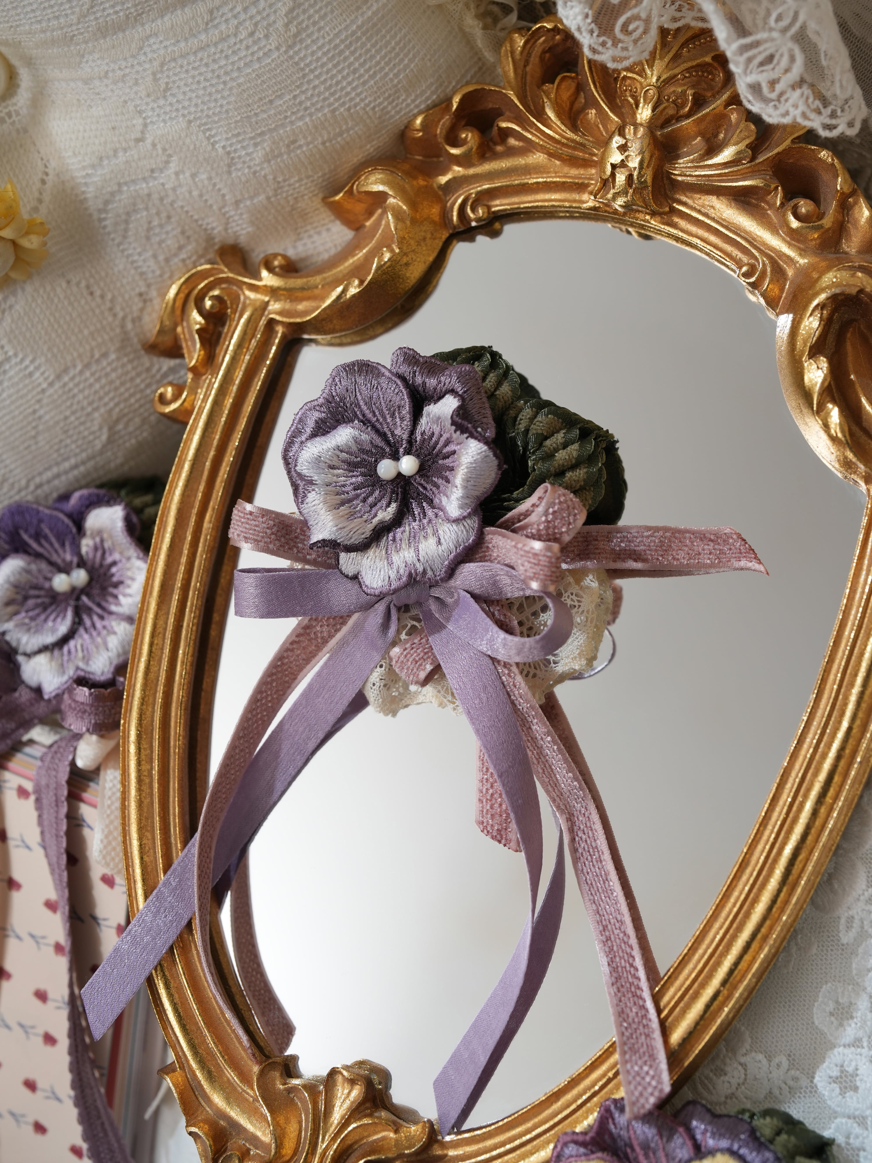 まるで本物のような美しい刺繍の可憐な三色すみれ。