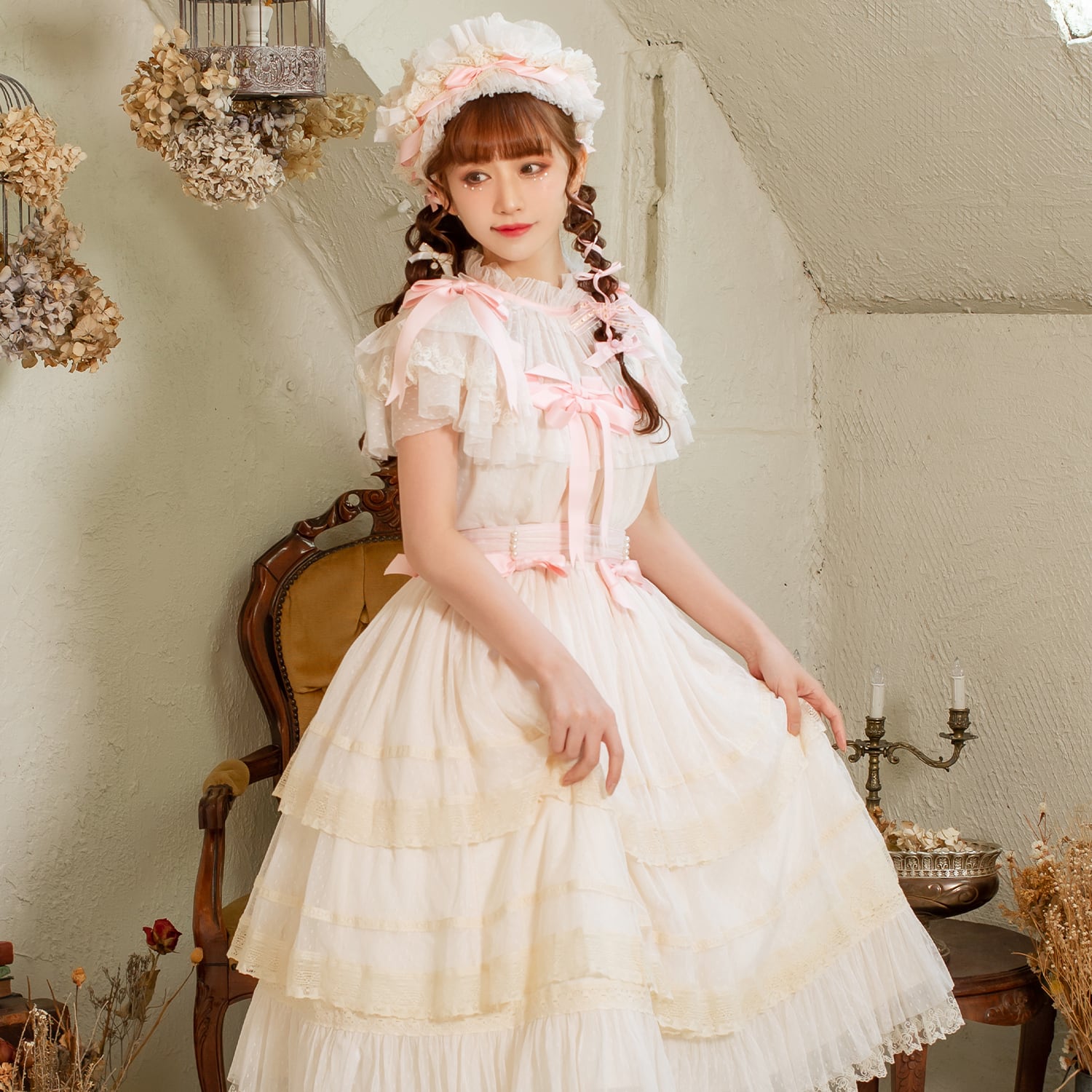 パステルカラーのサテンリボンとパール付きベルトがやさしい色合いのアクセントに。