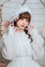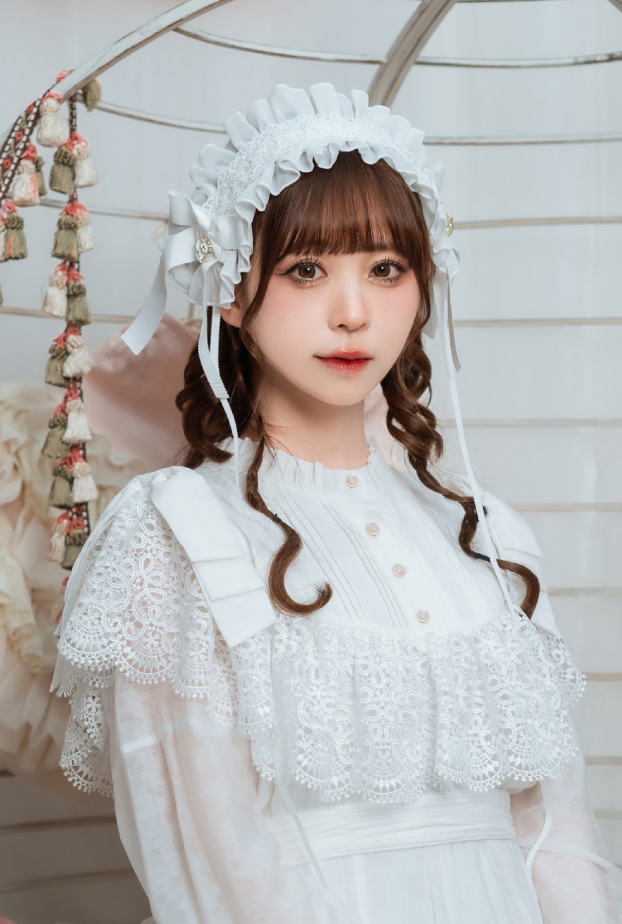 トップのレースやチャームに薔薇をたっぷりあしらったヘッドドレス。