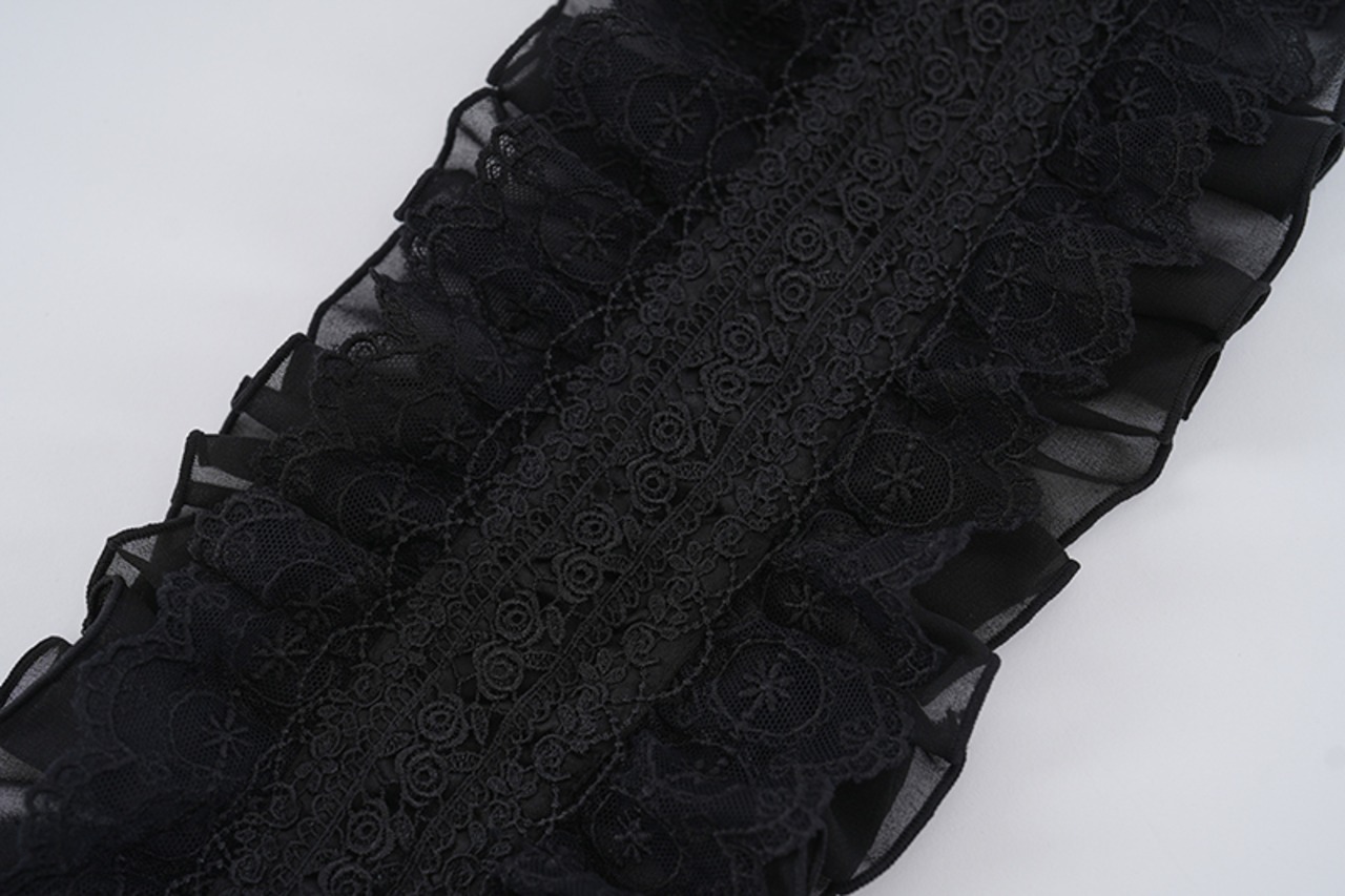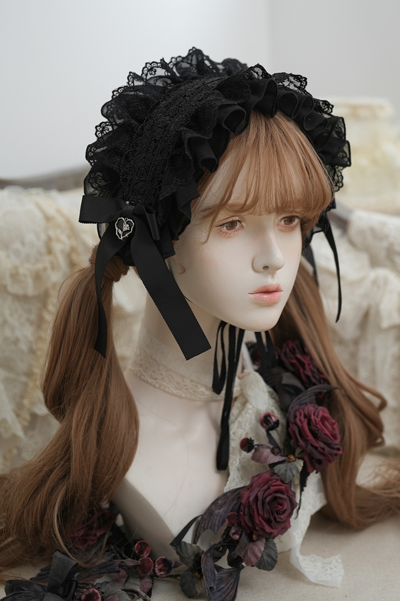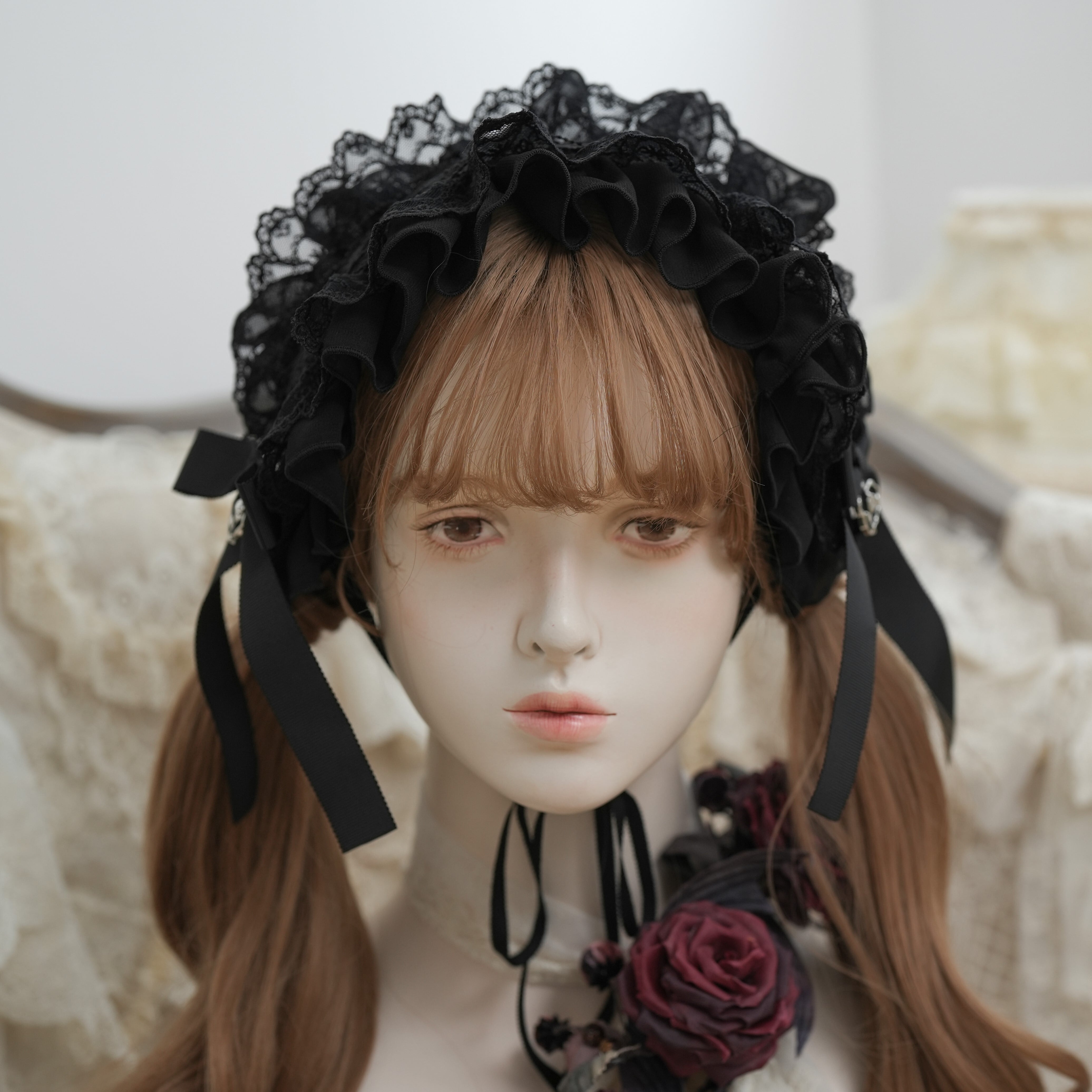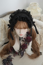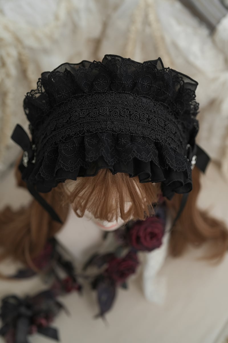 トップのレースやチャームに薔薇をたっぷりあしらったヘッドドレス。