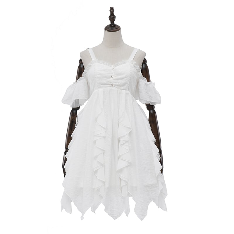 アシンメトリーなスカートがひらひらと舞う、優雅なオフショルダージャンパースカート。