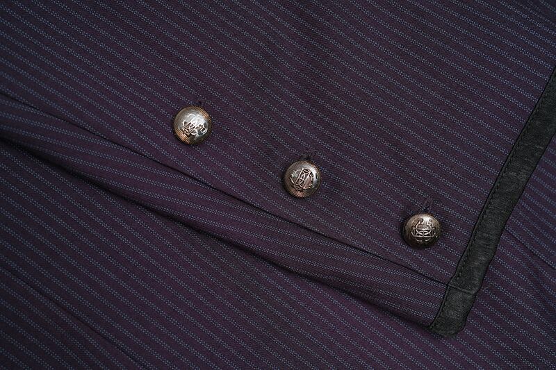 ほどよいフォーマル感の細目ストライプ柄と、アンティークシルバーのボタンで華やかな仕上がり。