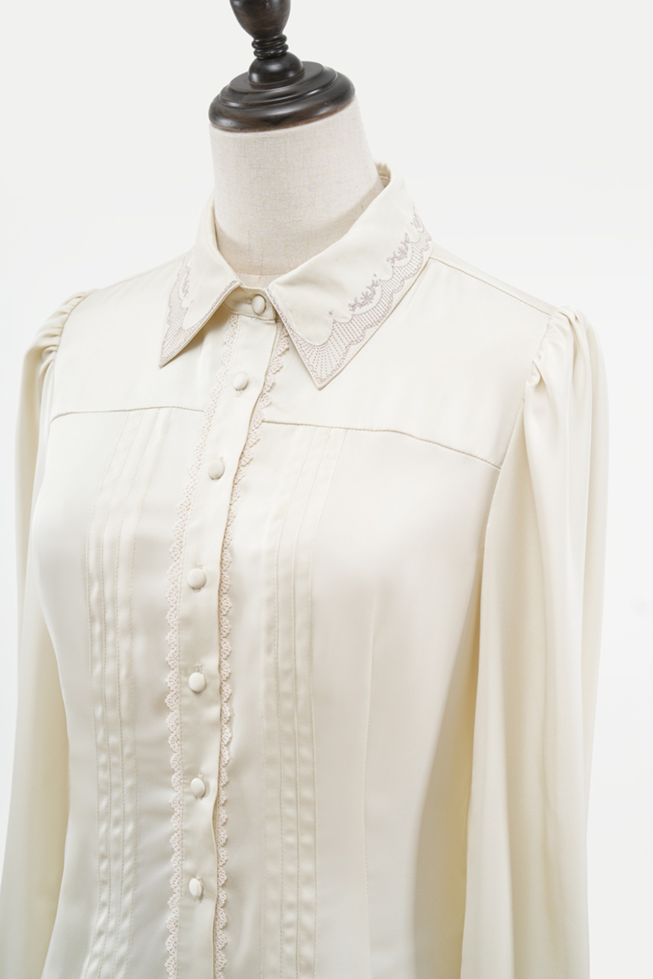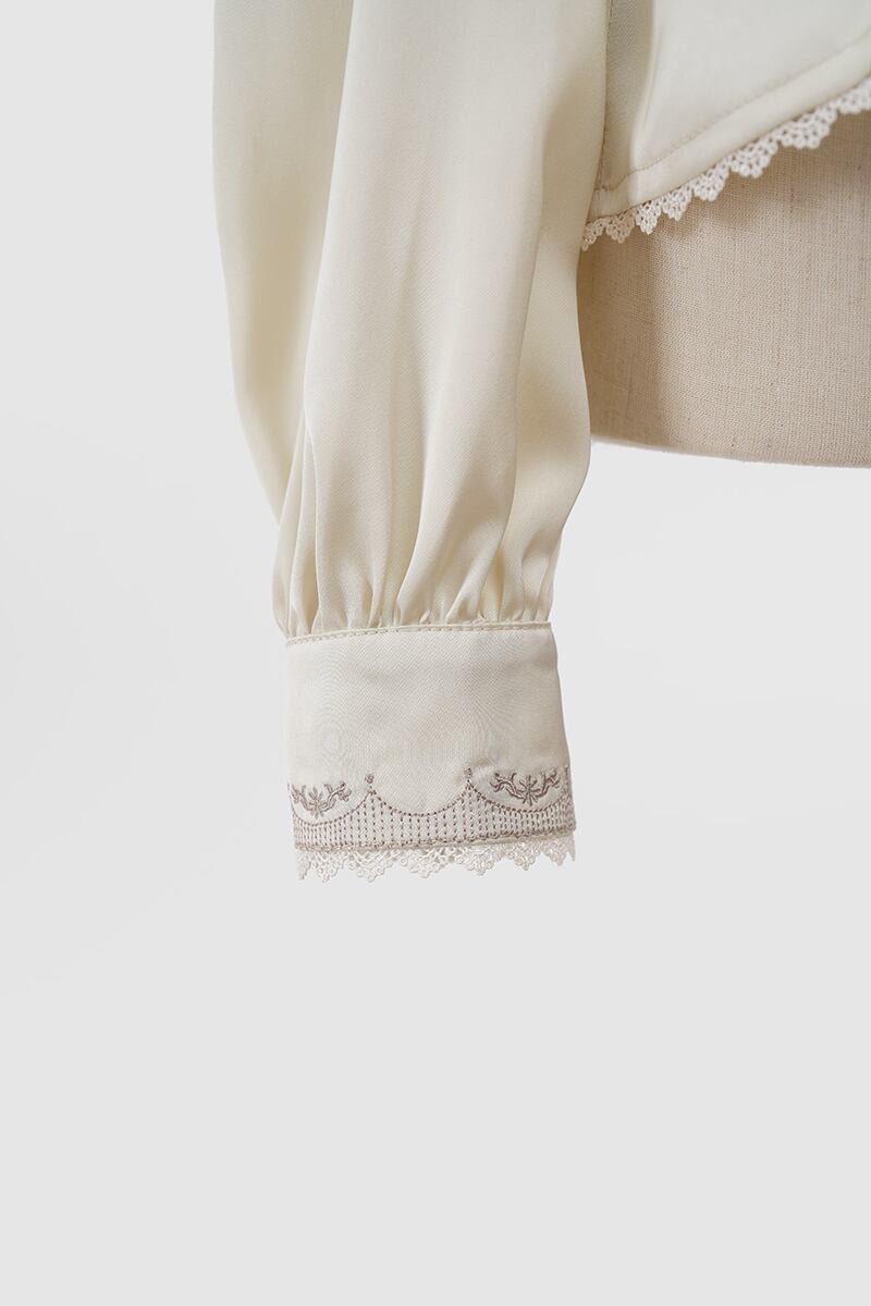襟や袖口に添えられた同系色の刺繍もポイント。