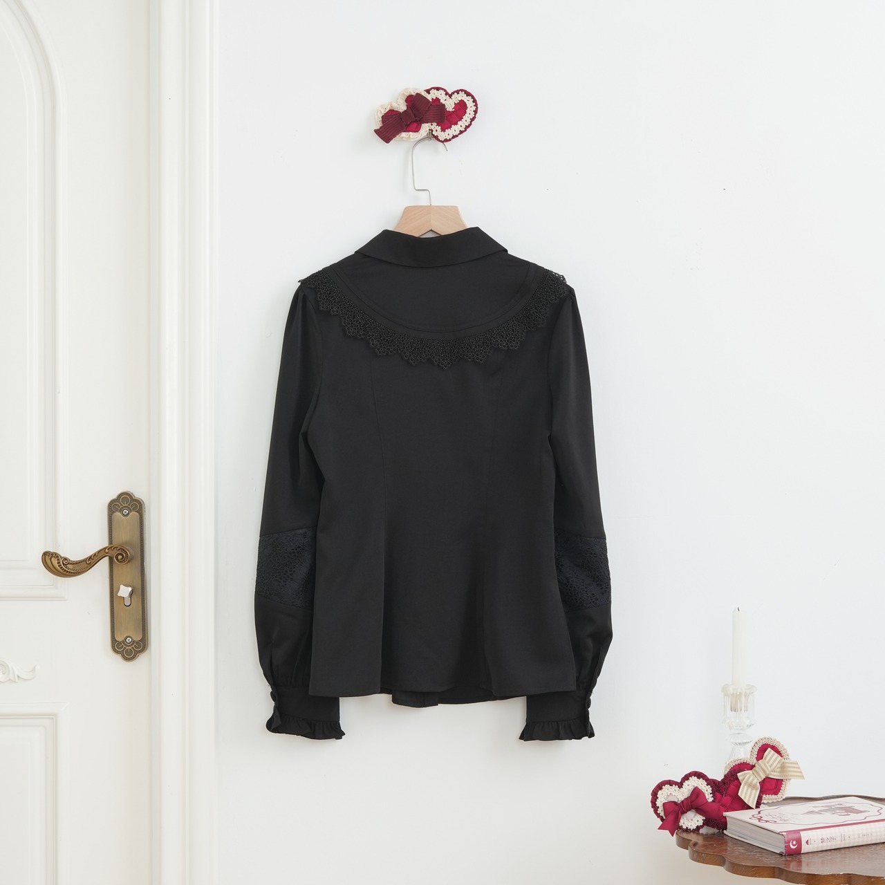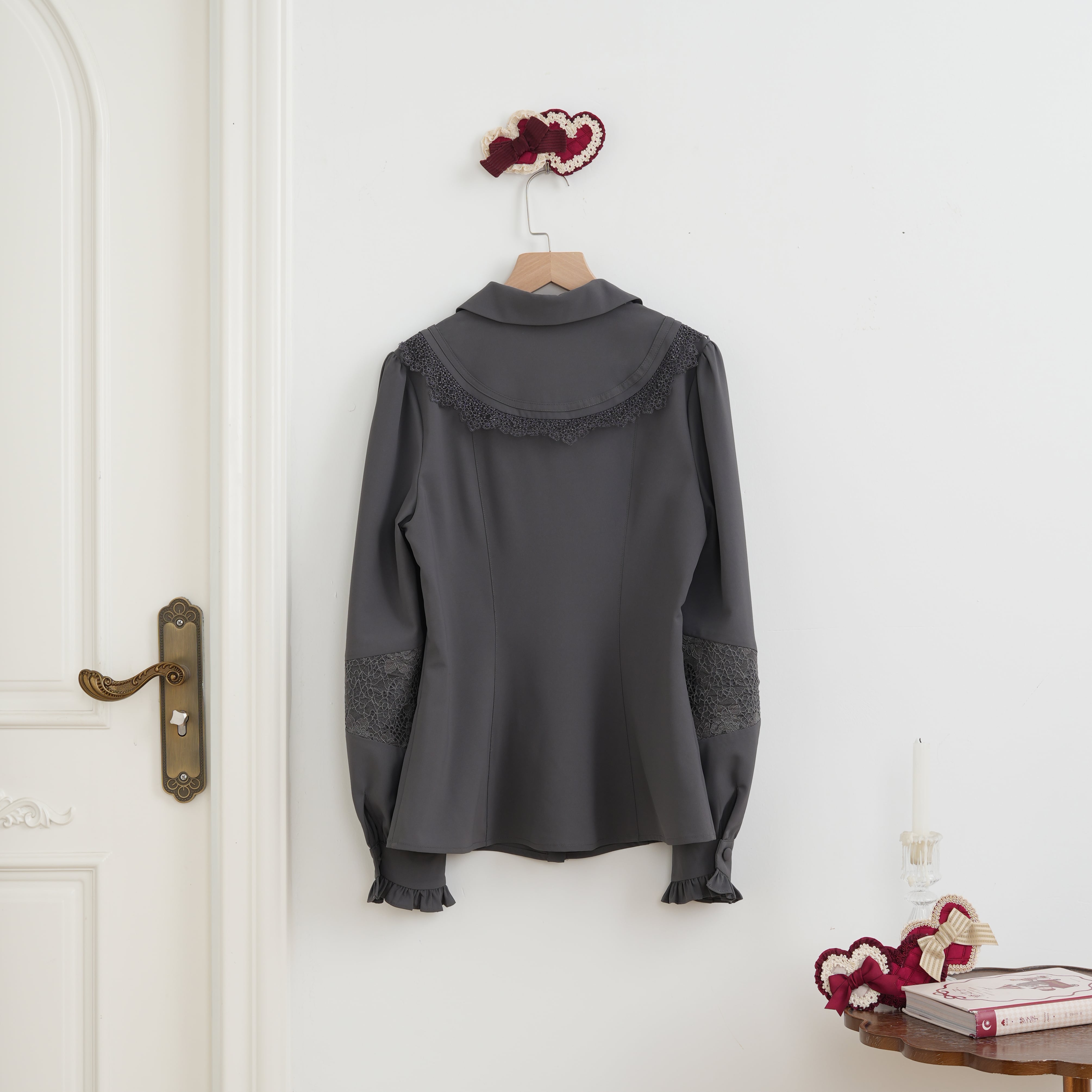 バックの襟元がレースペーパーのようで愛らしい。袖のシルエットが美しく、上品さも兼ねそろえています。