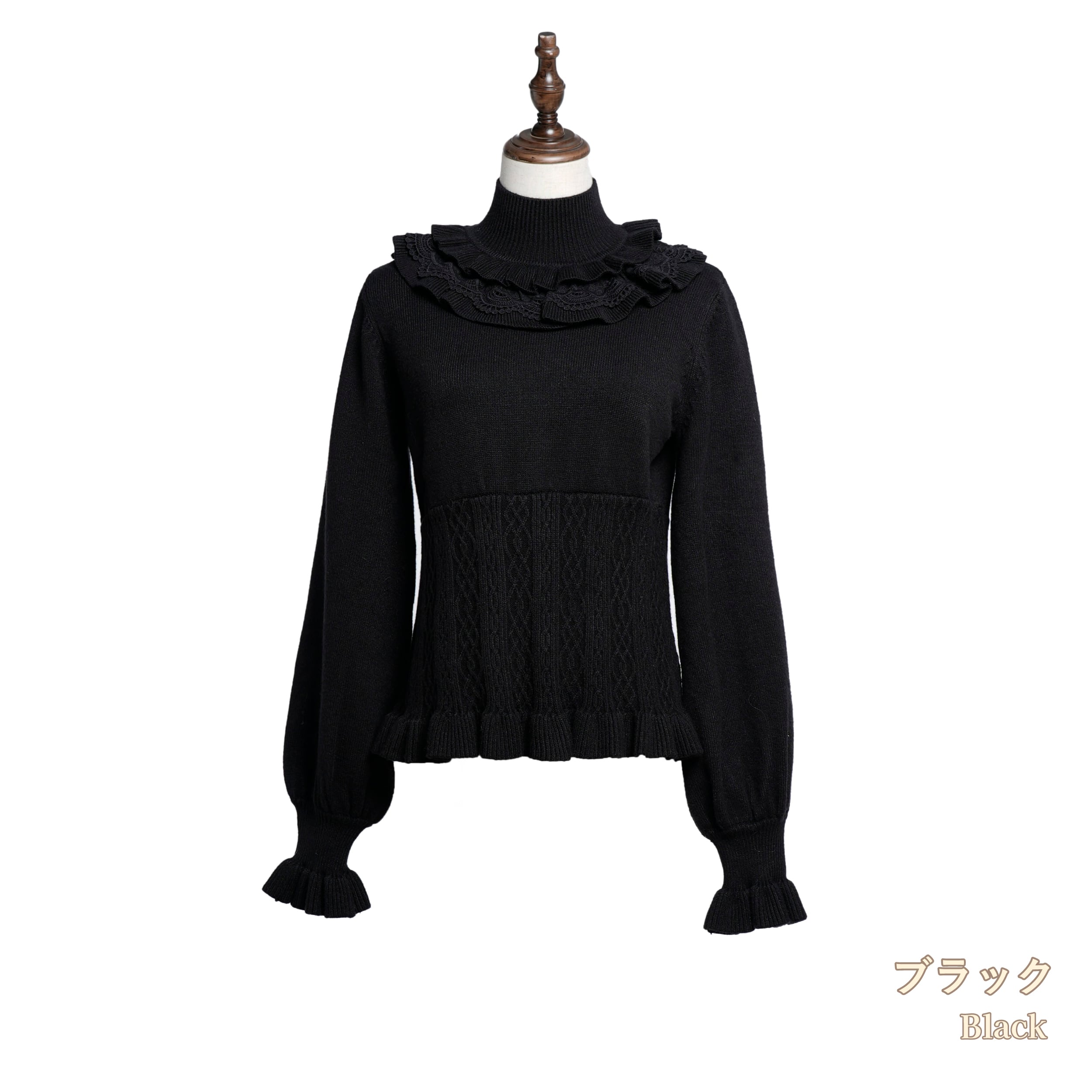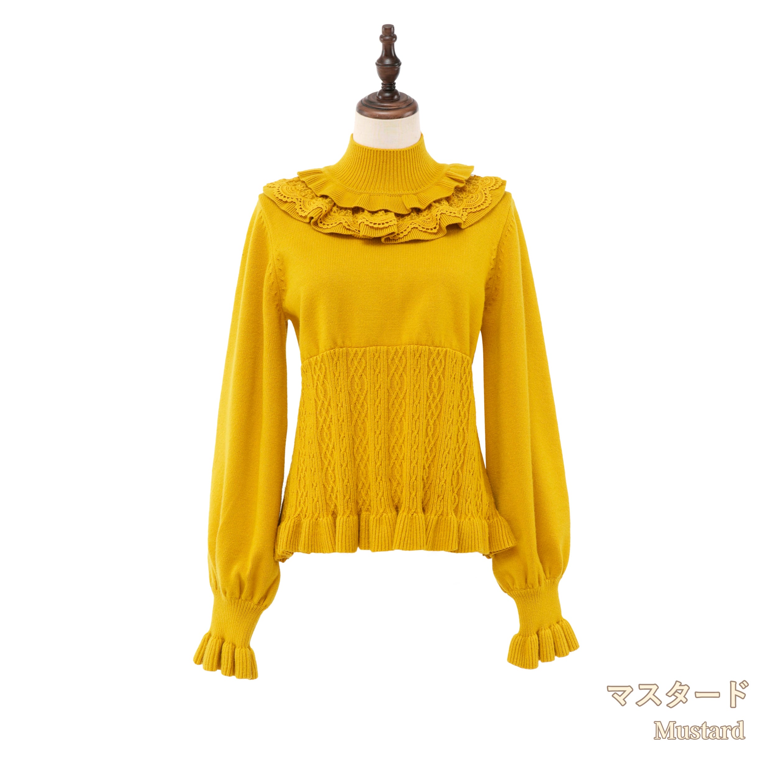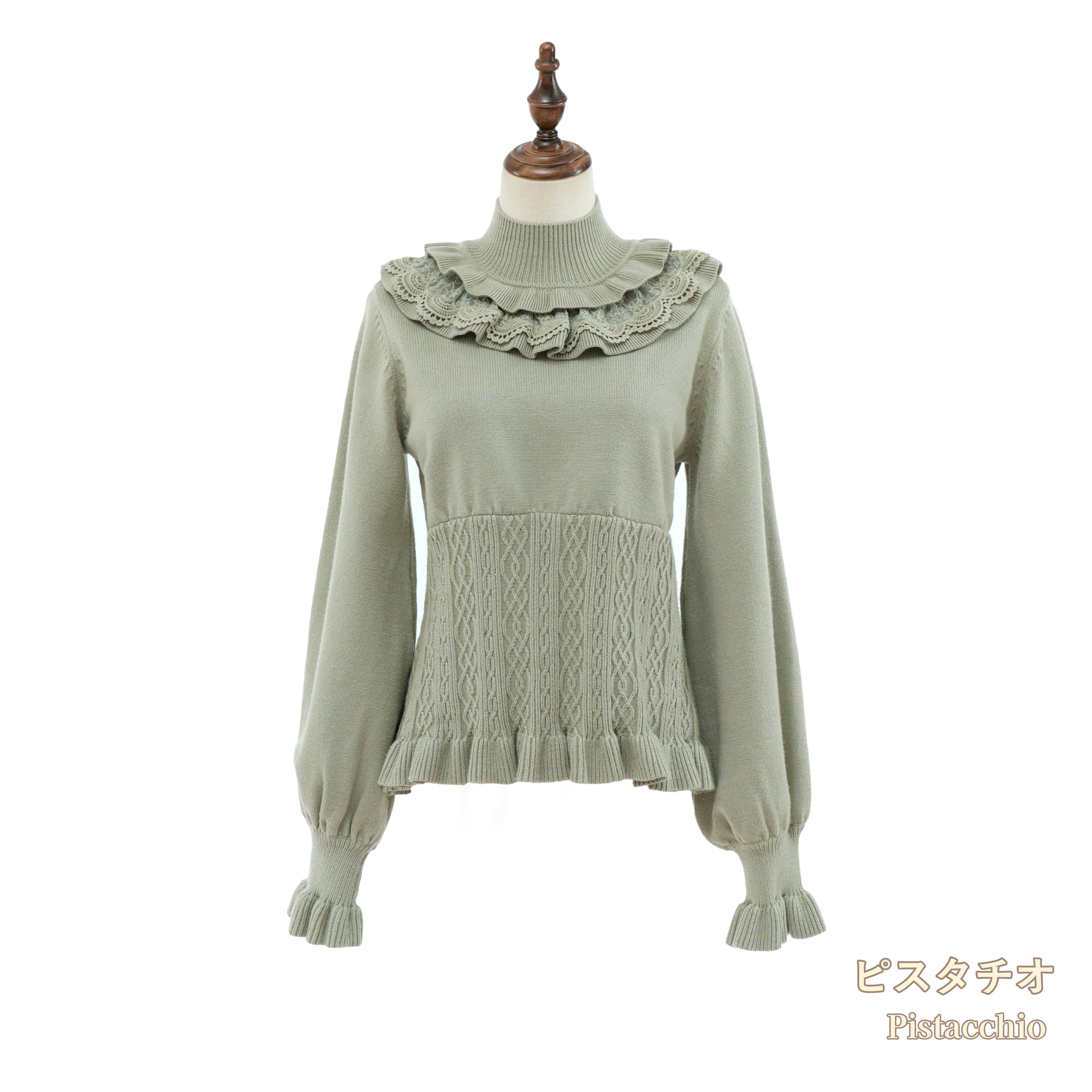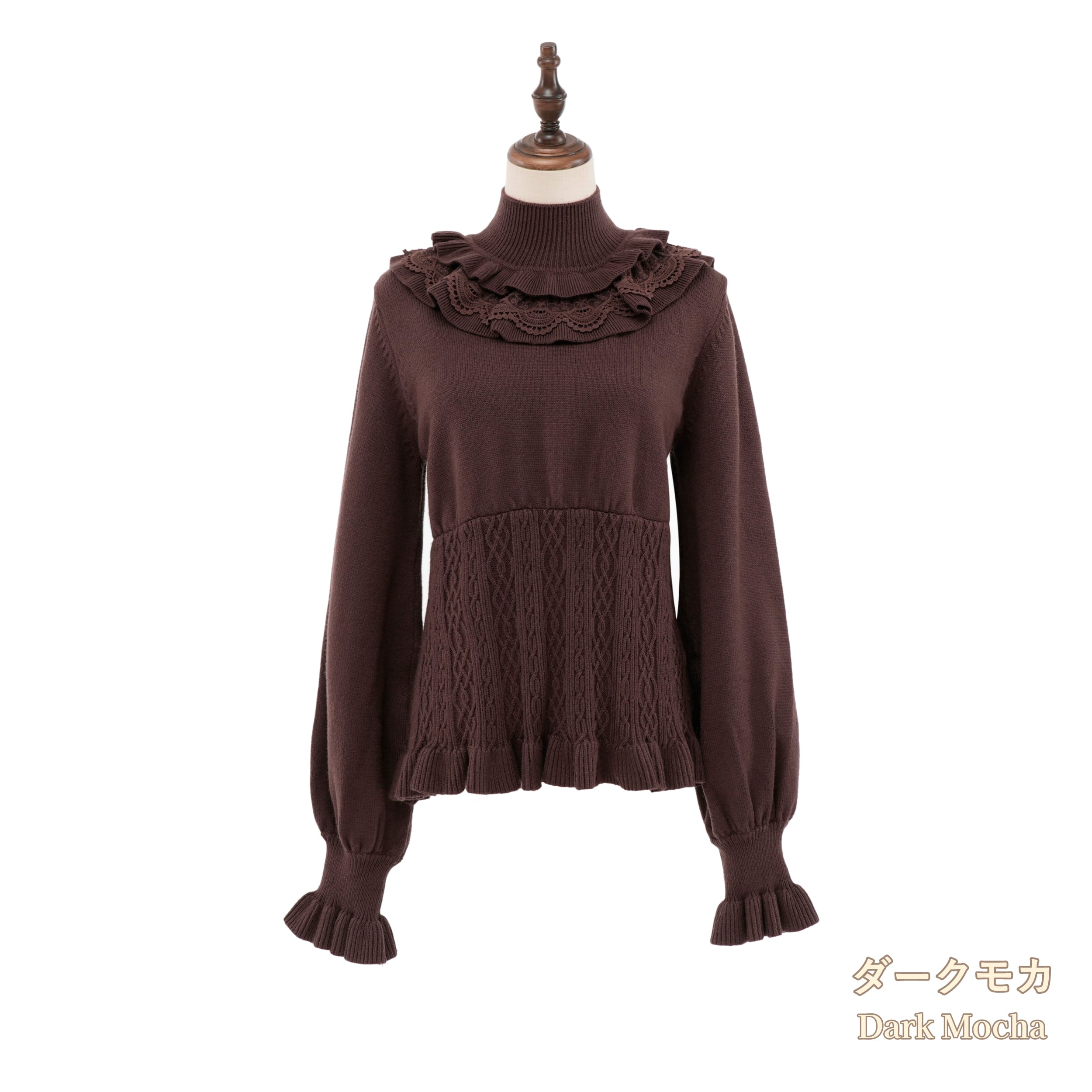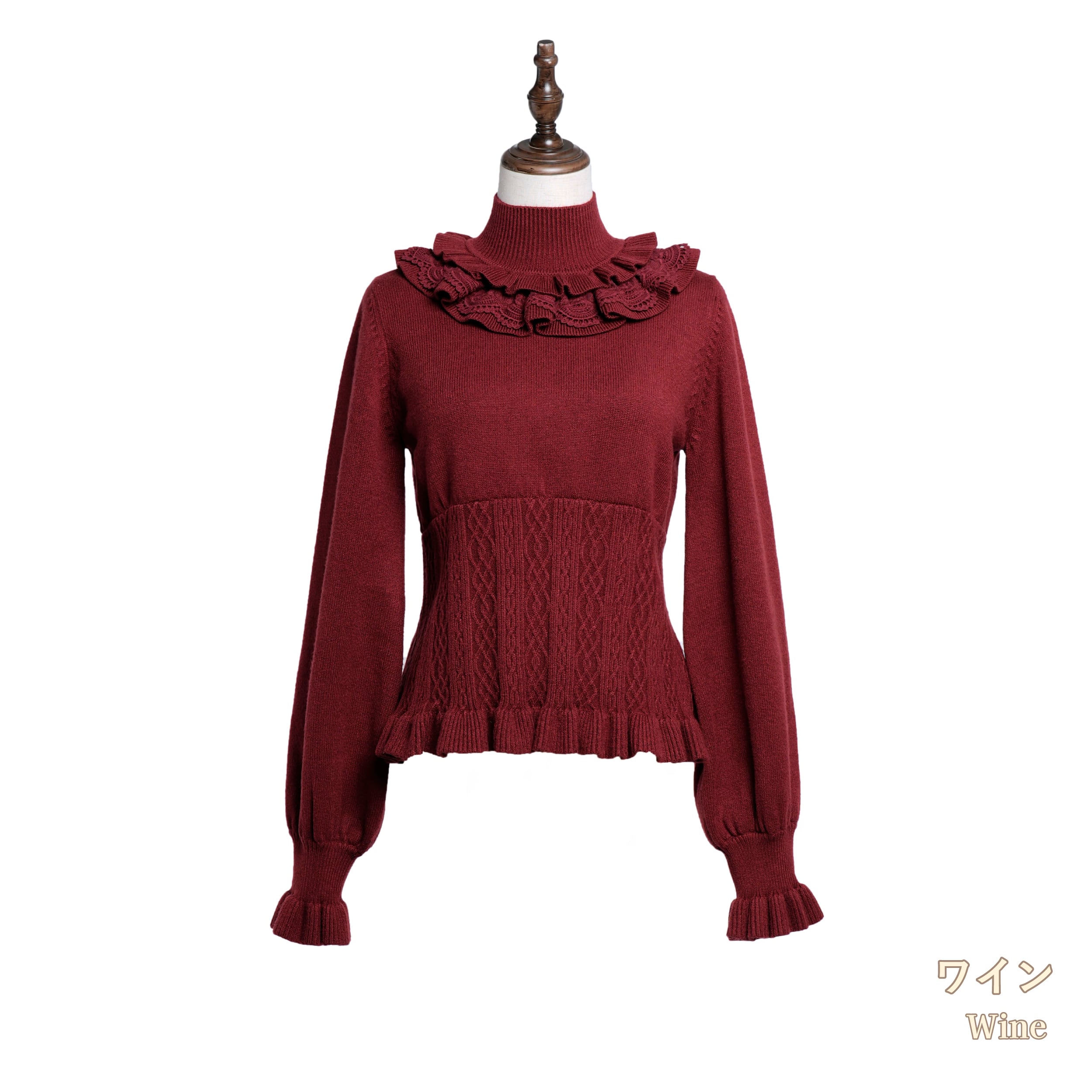タートルネックや袖、裾周りにはたっぷりとフリルをあしらいました。