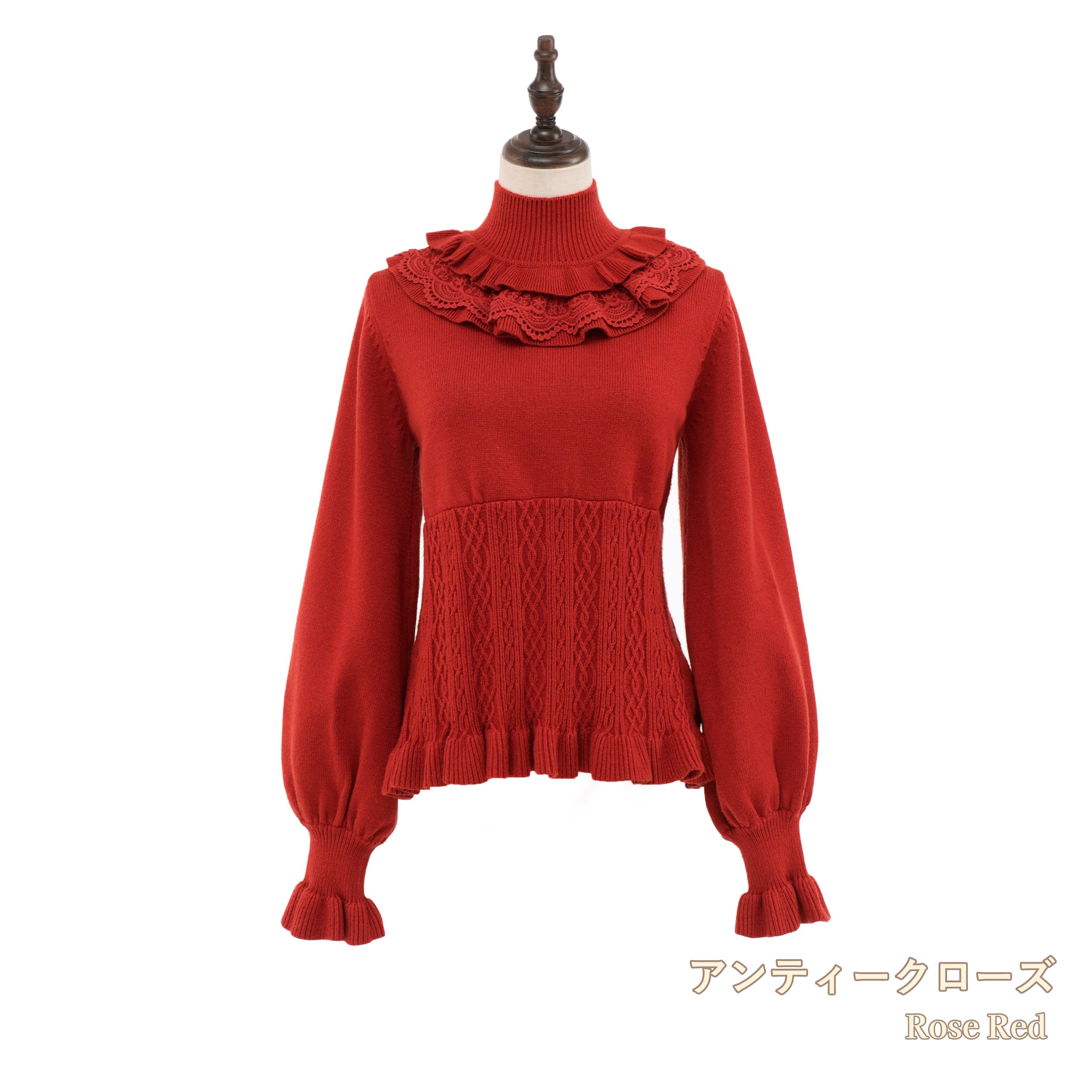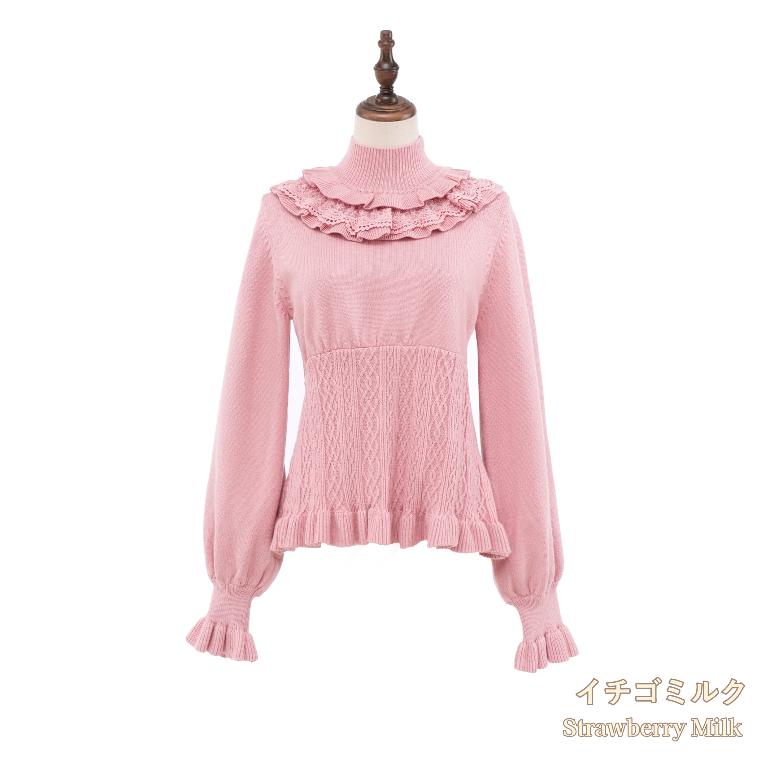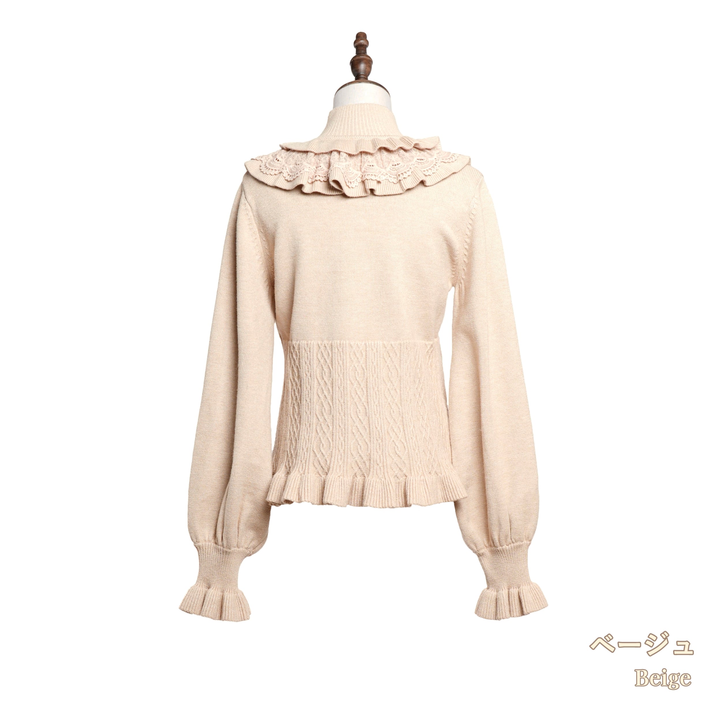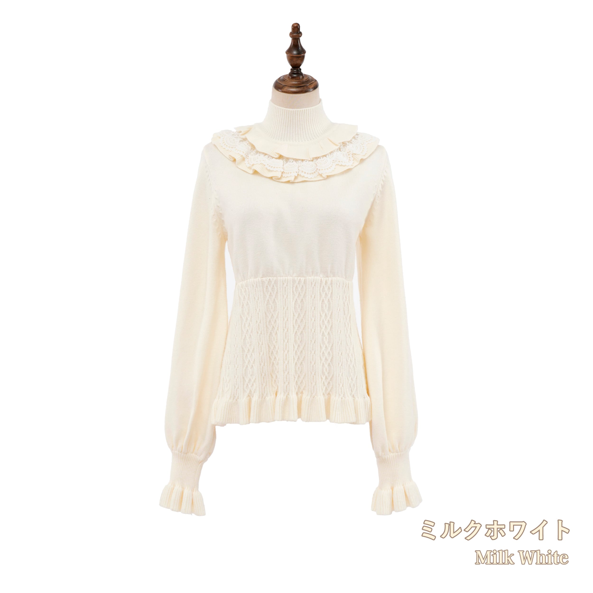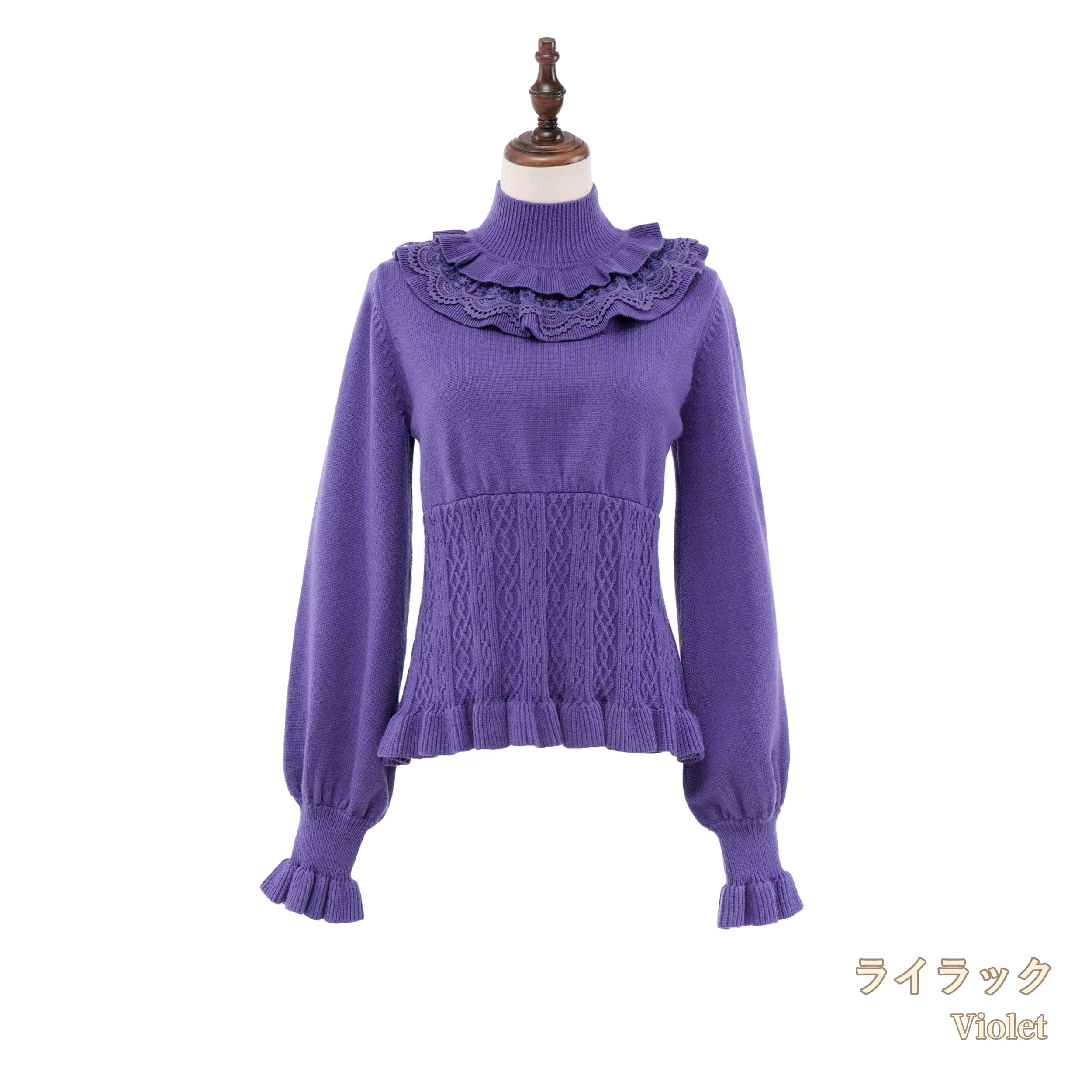 タートルネックや袖、裾周りにはたっぷりとフリルをあしらいました。